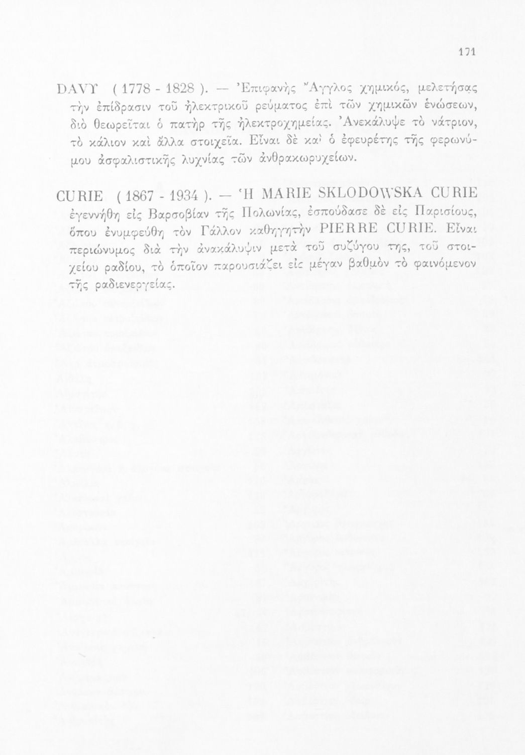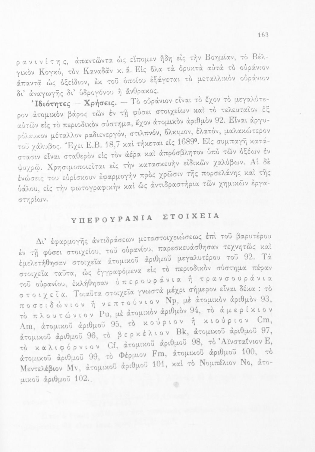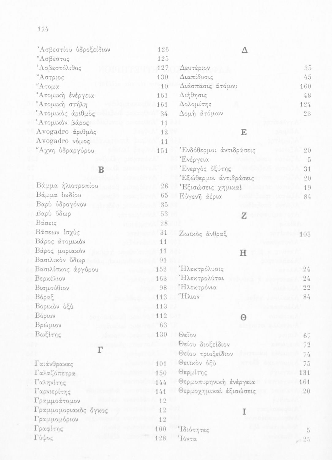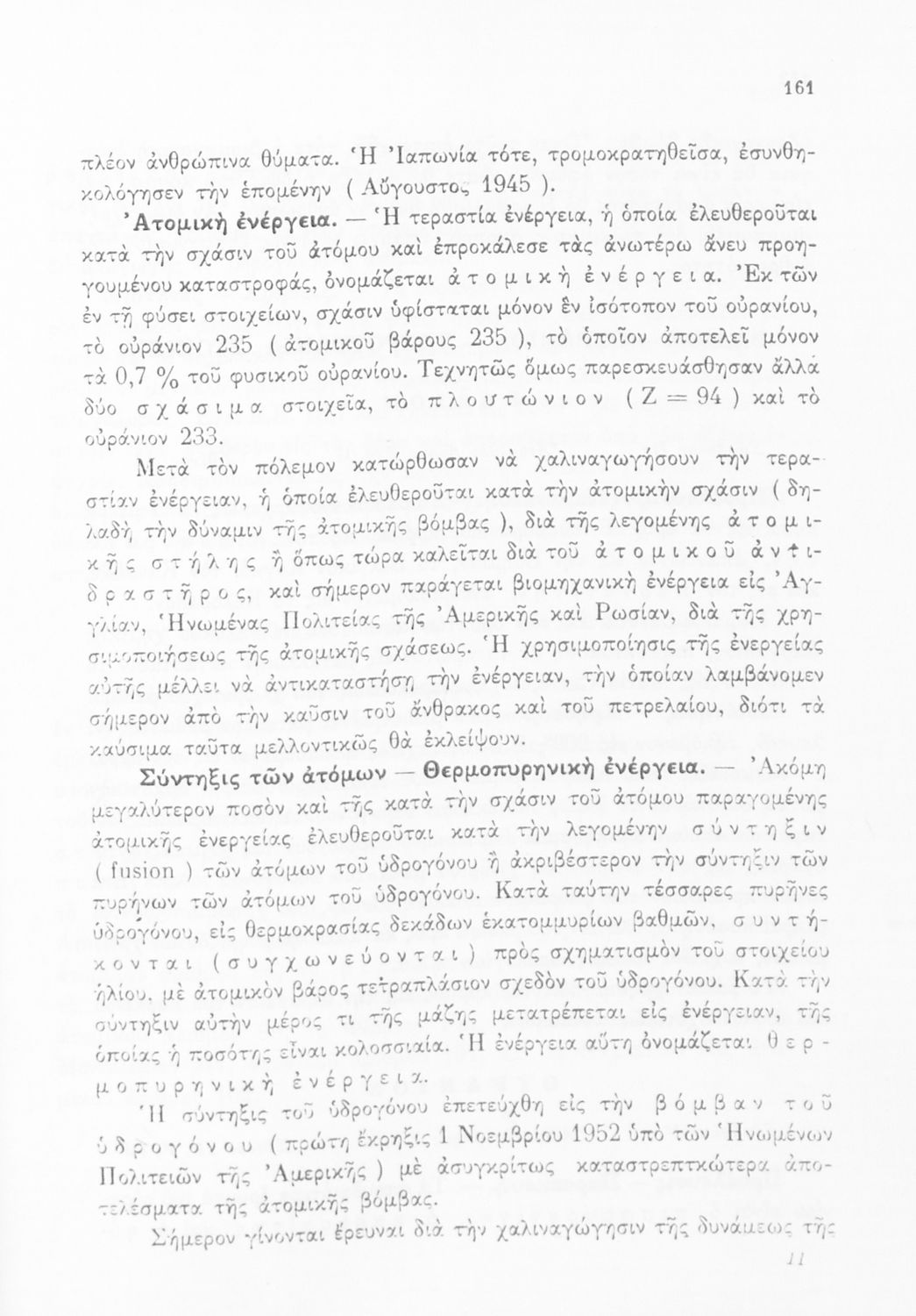 Σχολικό εγχειρίδιο Χημείας για τους μαθητές της Δ' και Ε' Γυμνασίου. Χωρίζεται σε τρία μέρη. Στο πρώτο μέρος είναι μια γενική εισαγωγή που παρουσιάζει τους θεμελιώδεις νόμους της Χημείας, τις χημικές αντιδράσεις, τα χημικά σύμβολα. Στο δεύτερο και το τρίτο μέρος υπάρχει η παρουσίαση των αμέταλλων στοιχείων όπως το οξυγόνο, το άζωτο και ο άνθρακας, τα παράγωγά και τις ιδιότητες τους. Στο τρίτο παρουσιάζονται τα μέταλλα και τα παράγωγά τους όπως ο χρυσός, ο αργύλιος, ο χαλκός. Τέλος, το βιβλίο ολοκληρώνει με μια σύντομη εισαγωγή στη ραδιενέργεια.