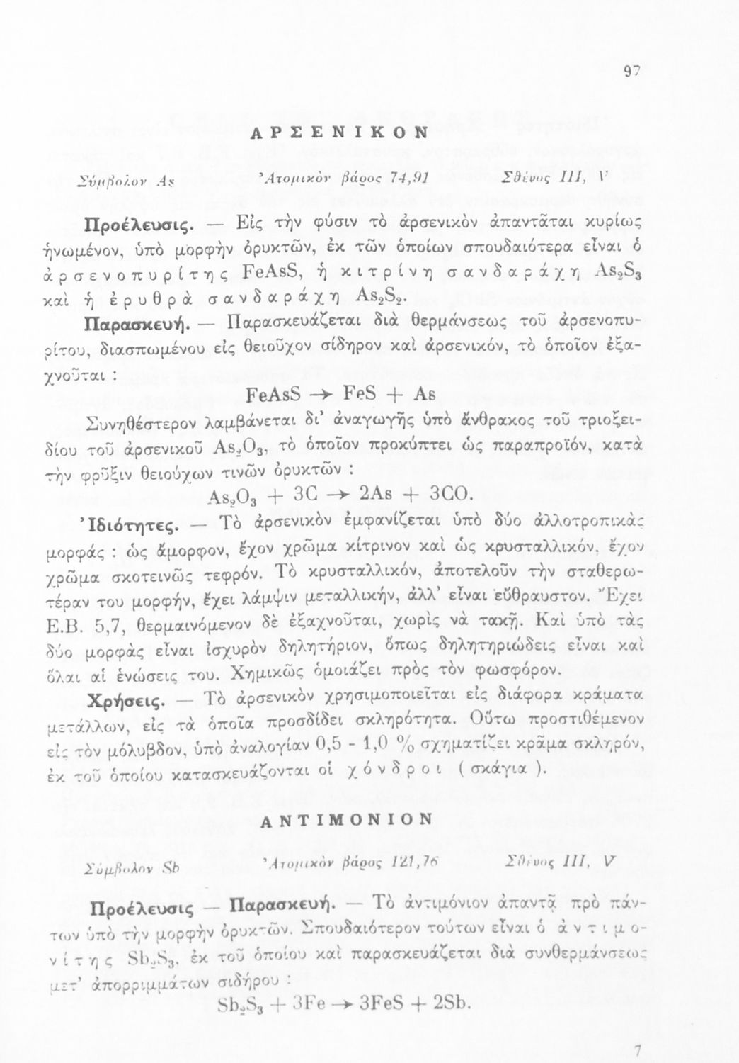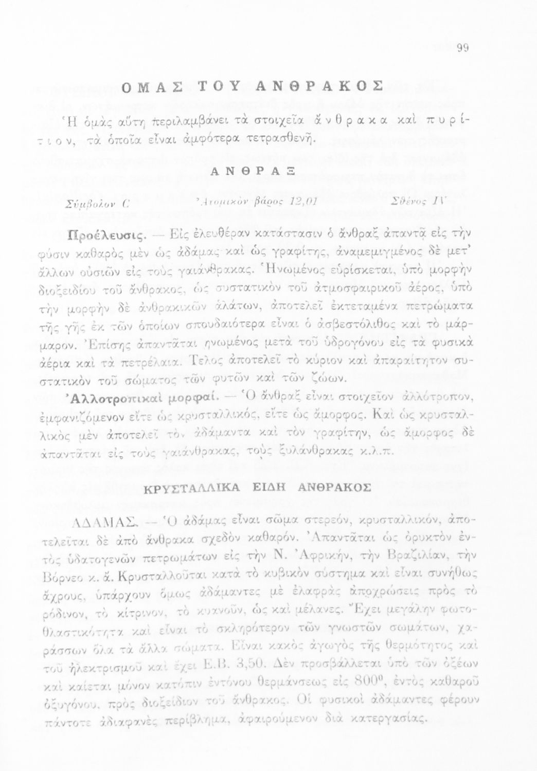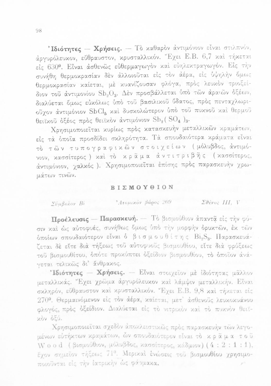 Σχολικό εγχειρίδιο Χημείας για τους μαθητές της Δ' και Ε' Γυμνασίου. Χωρίζεται σε τρία μέρη. Στο πρώτο μέρος είναι μια γενική εισαγωγή που παρουσιάζει τους θεμελιώδεις νόμους της Χημείας, τις χημικές αντιδράσεις, τα χημικά σύμβολα. Στο δεύτερο και το τρίτο μέρος υπάρχει η παρουσίαση των αμέταλλων στοιχείων όπως το οξυγόνο, το άζωτο και ο άνθρακας, τα παράγωγά και τις ιδιότητες τους. Στο τρίτο παρουσιάζονται τα μέταλλα και τα παράγωγά τους όπως ο χρυσός, ο αργύλιος, ο χαλκός. Τέλος, το βιβλίο ολοκληρώνει με μια σύντομη εισαγωγή στη ραδιενέργεια.