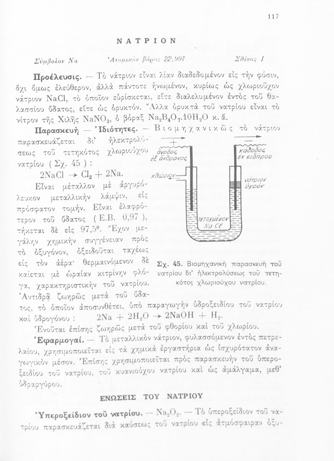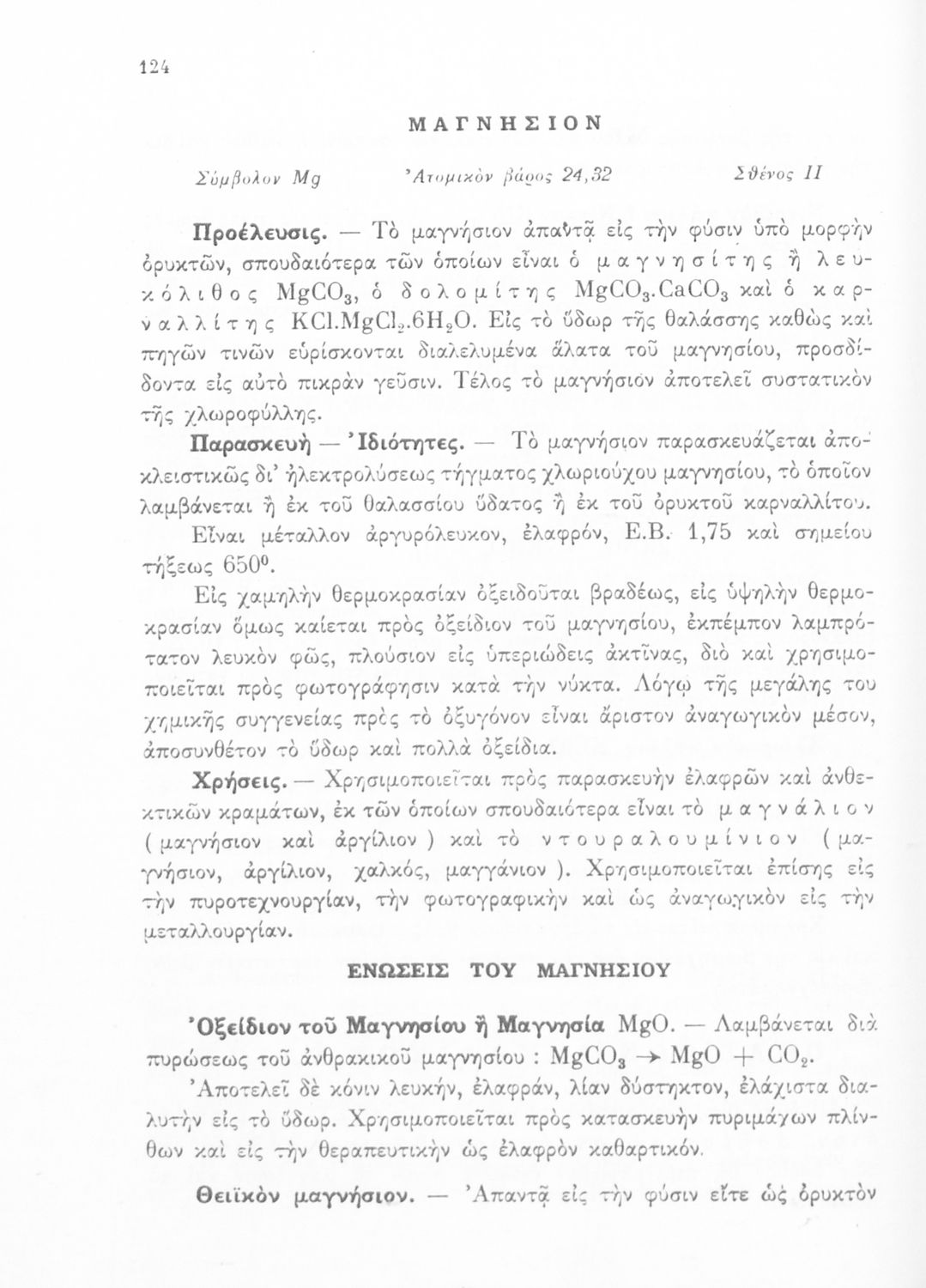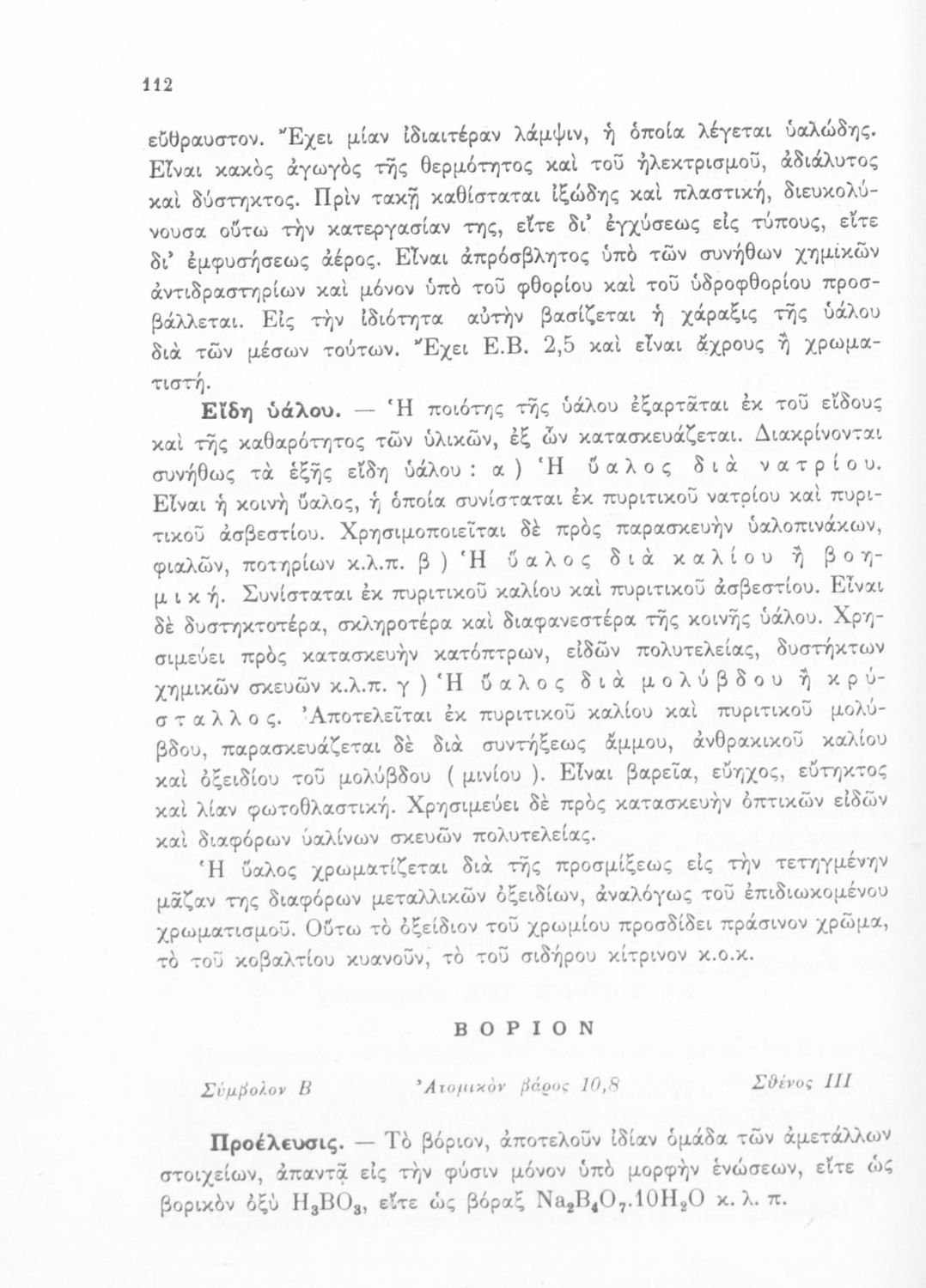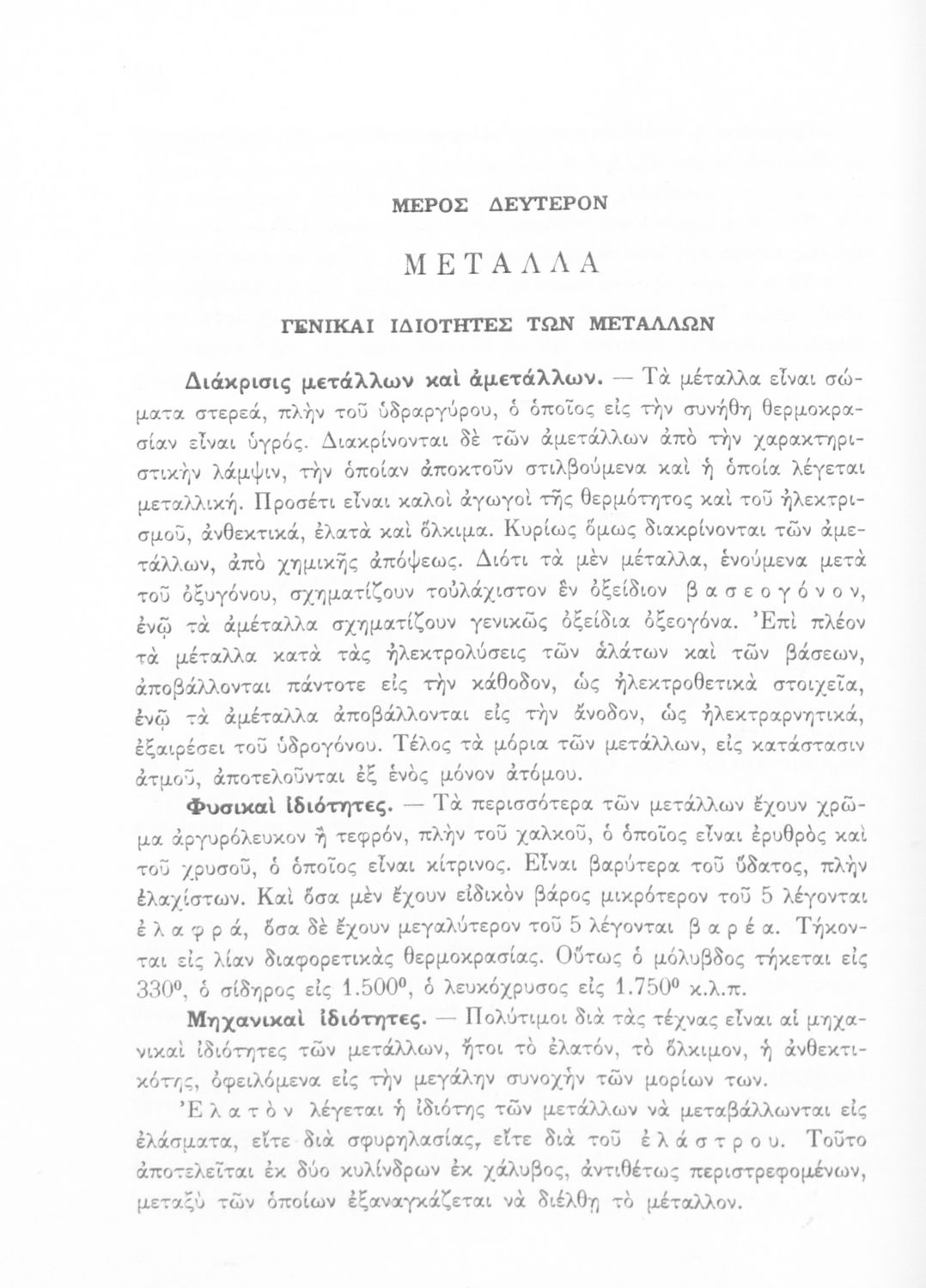 Σχολικό εγχειρίδιο Χημείας για τους μαθητές της Δ' Γυμνασίου. Χωρίζεται σε τρία μέρη. Στο πρώτο μέρος είναι μια γενική εισαγωγή που παρουσιάζει τους θεμελιώδεις νόμους της Χημείας, τις χημικές αντιδράσεις, τα χημικά σύμβολα. Στο δεύτερο και το τρίτο μέρος υπάρχει η παρουσίαση των αμέταλλων στοιχείων όπως το οξυγόνο, το άζωτο και ο άνθρακας, τα παράγωγά και τις ιδιότητες τους. Στο τρίτο παρουσιάζονται τα μέταλλα και τα παράγωγά τους όπως ο χρυσός, ο αργύλιος, ο χαλκός. Τέλος, το βιβλίο ολοκληρώνει με μια σύντομη εισαγωγή στη ραδιενέργεια.
