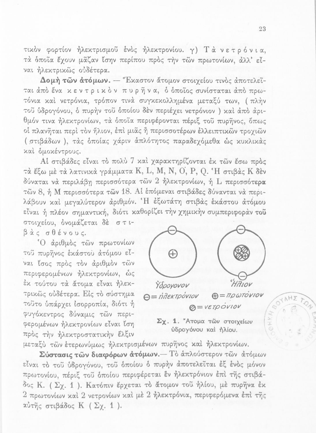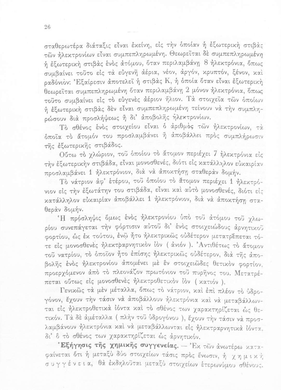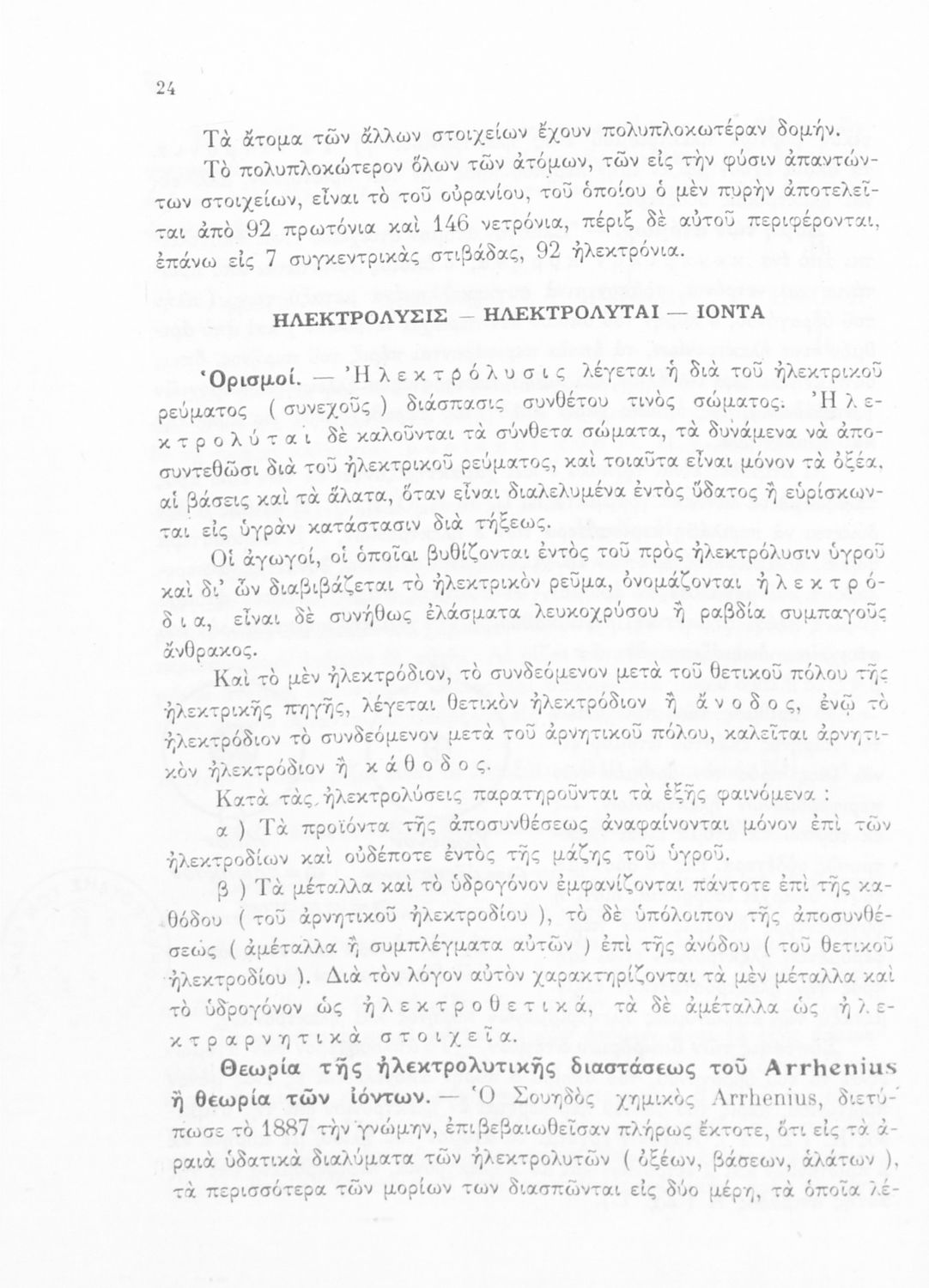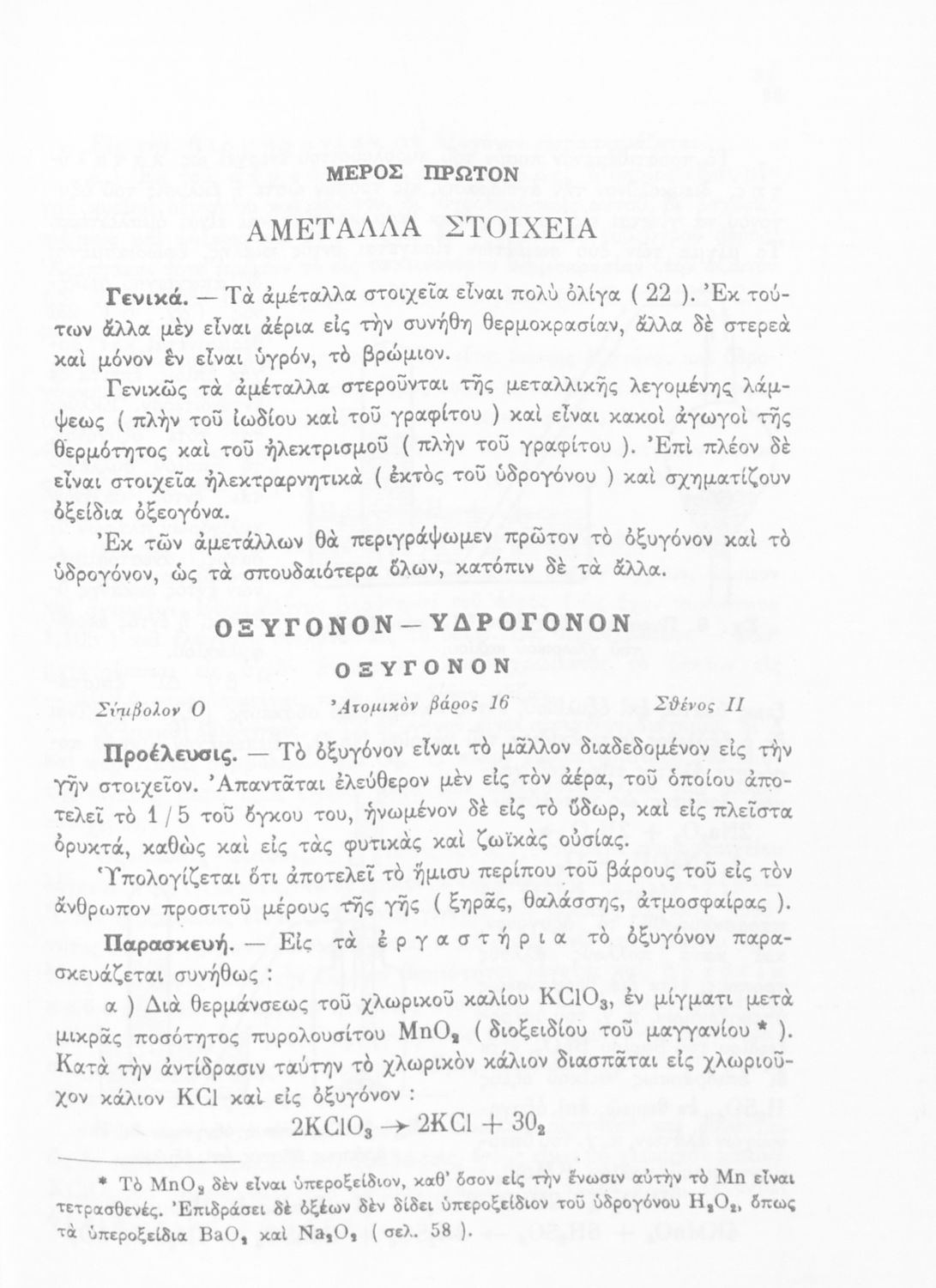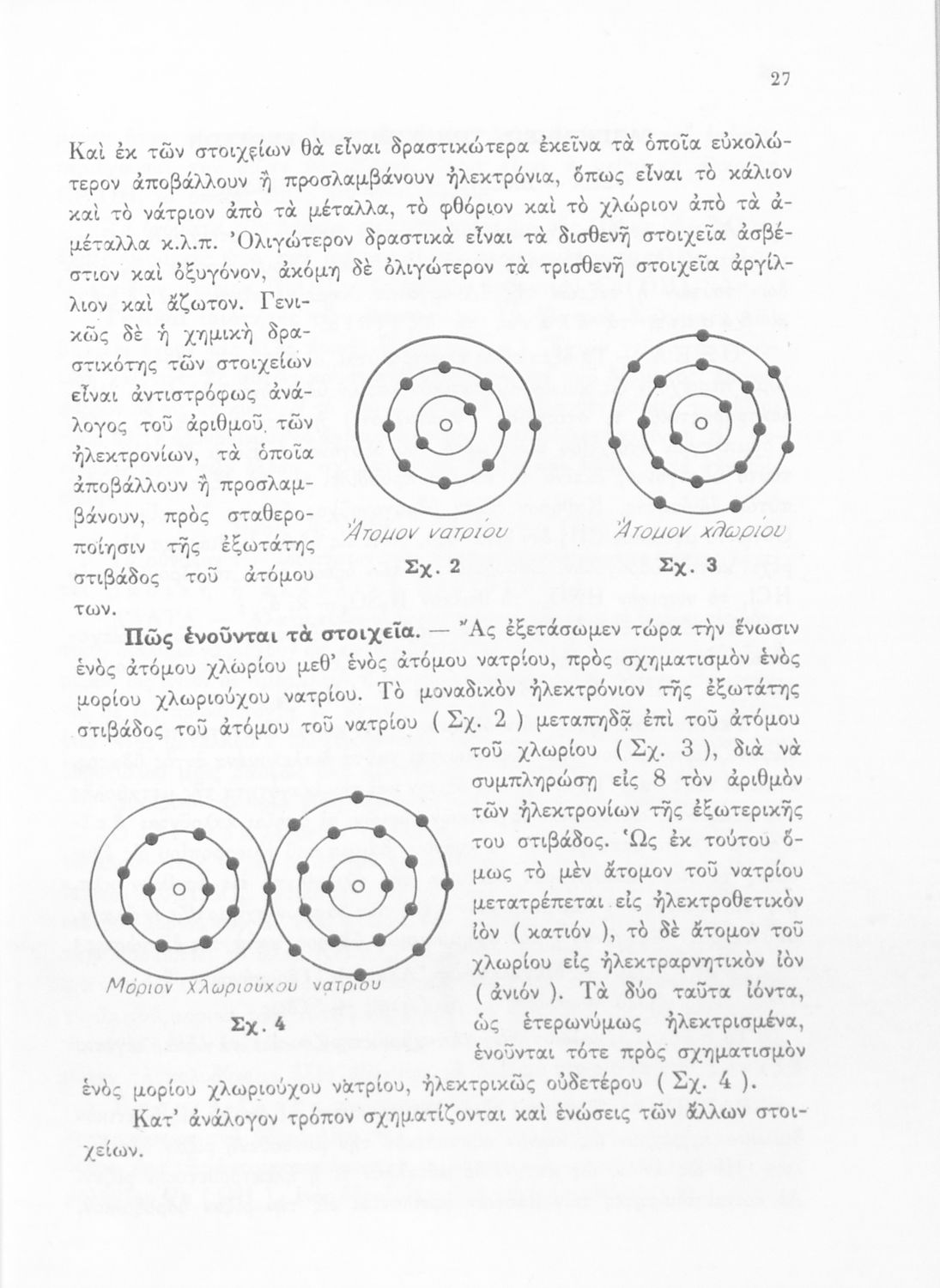Σχολικό εγχειρίδιο Χημείας για τους μαθητές της Δ' Γυμνασίου. Χωρίζεται σε τρία μέρη. Στο πρώτο μέρος είναι μια γενική εισαγωγή που παρουσιάζει τους θεμελιώδεις νόμους της Χημείας, τις χημικές αντιδράσεις, τα χημικά σύμβολα. Στο δεύτερο και το τρίτο μέρος υπάρχει η παρουσίαση των αμέταλλων στοιχείων όπως το οξυγόνο, το άζωτο και ο άνθρακας, τα παράγωγά και τις ιδιότητες τους. Στο τρίτο παρουσιάζονται τα μέταλλα και τα παράγωγά τους όπως ο χρυσός, ο αργύλιος, ο χαλκός. Τέλος, το βιβλίο ολοκληρώνει με μια σύντομη εισαγωγή στη ραδιενέργεια.