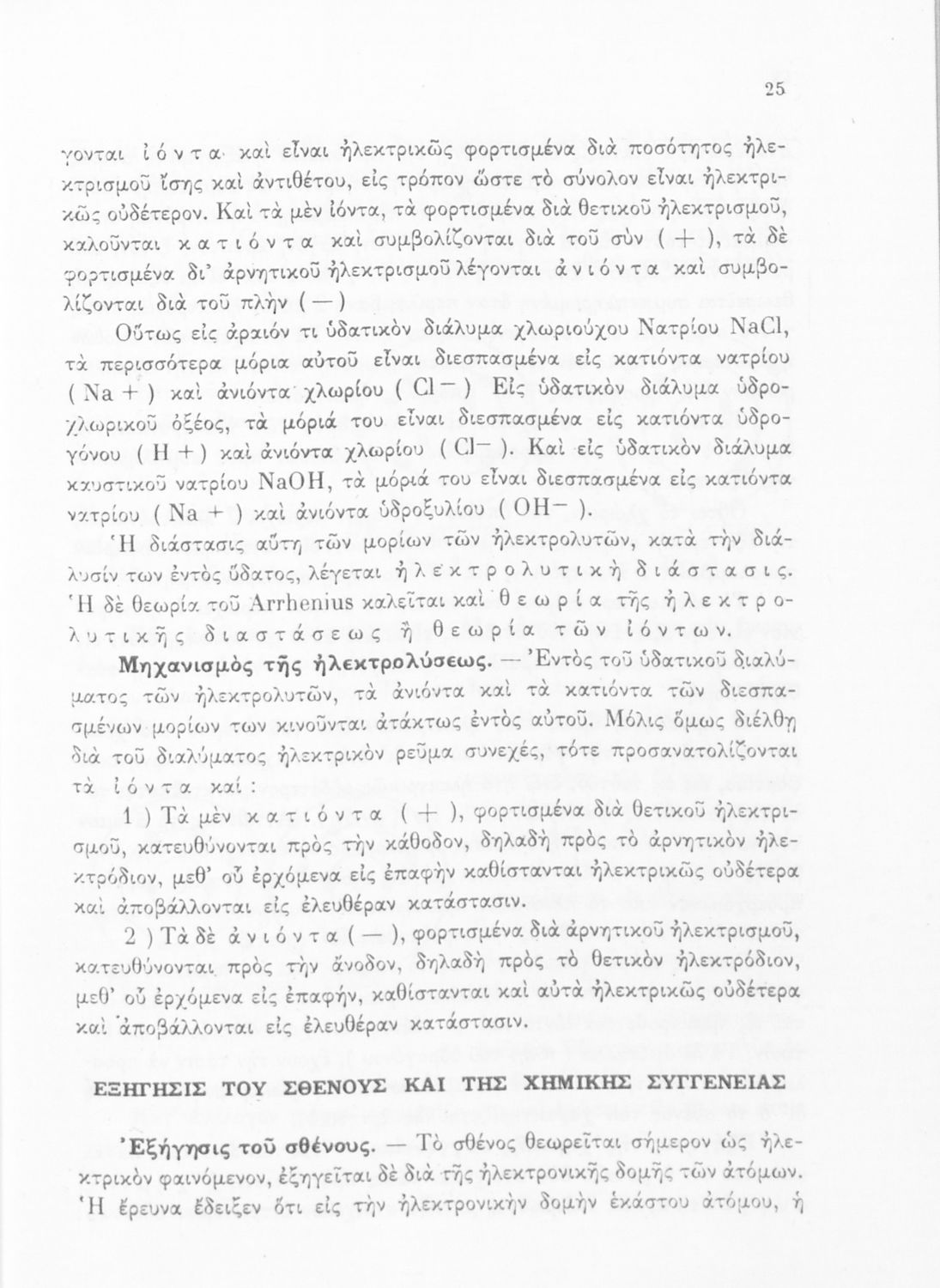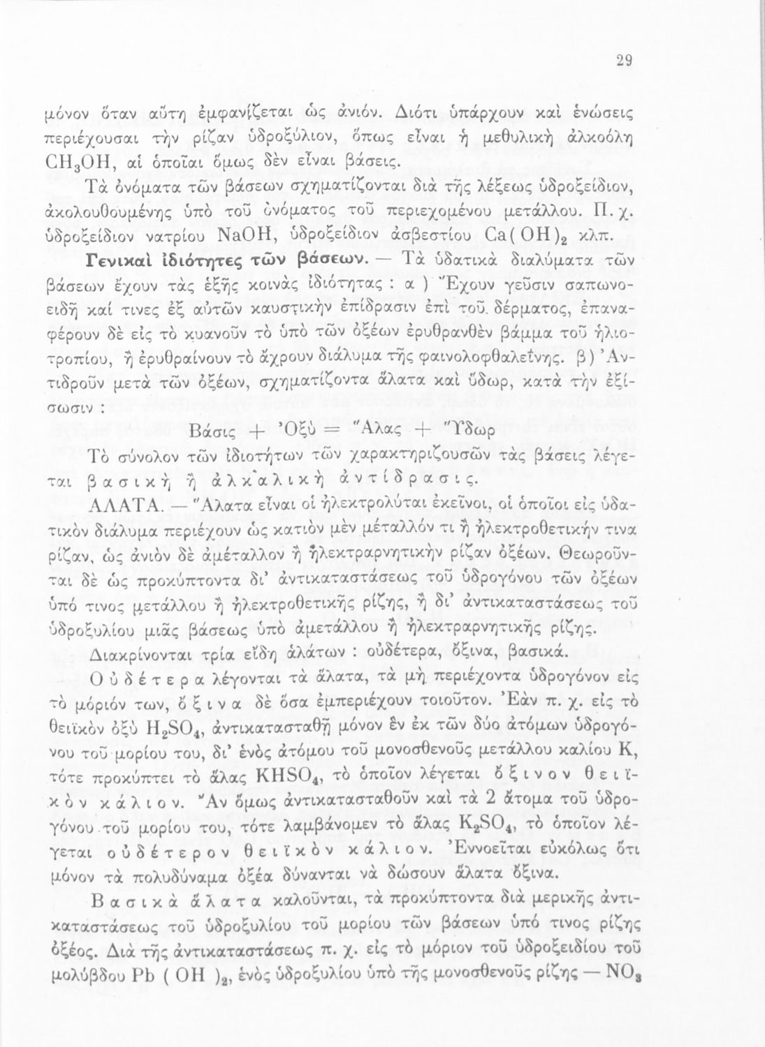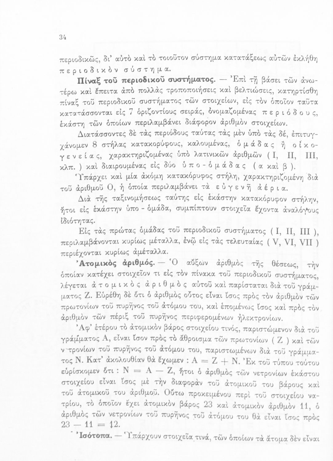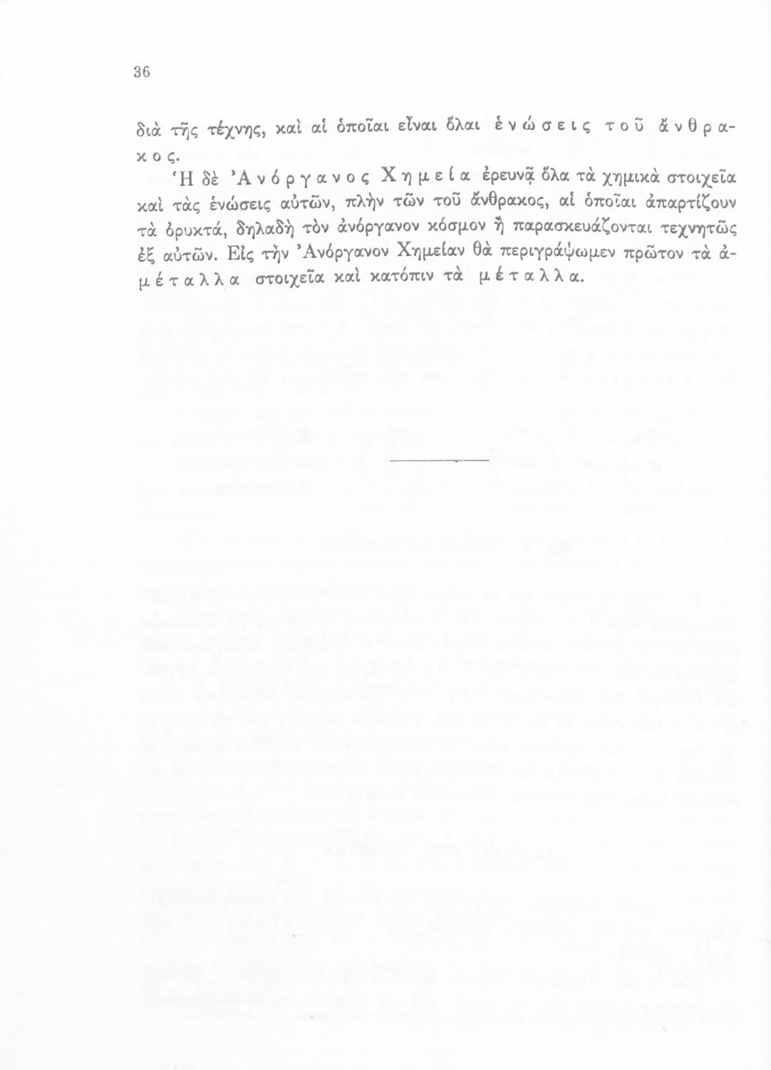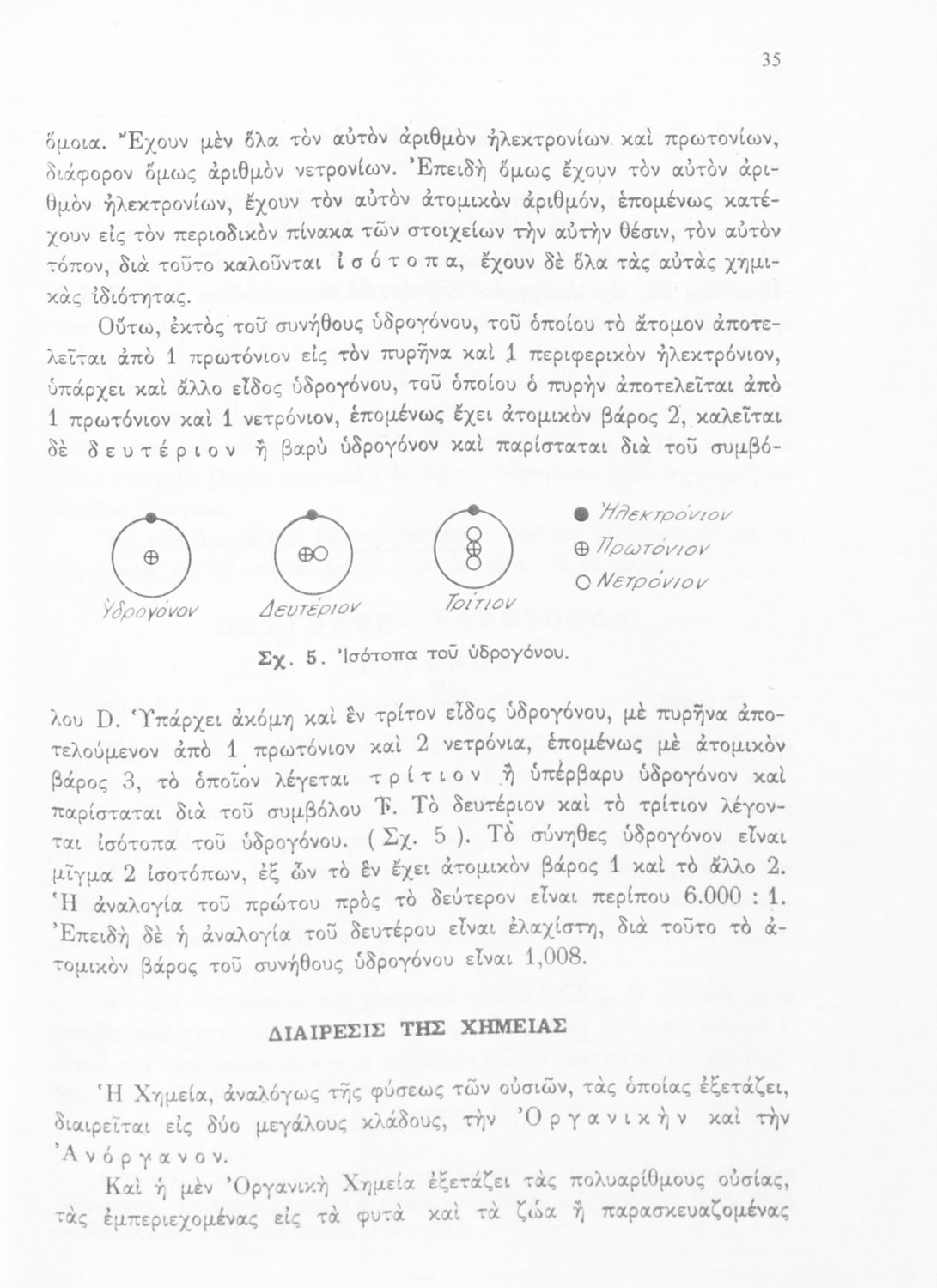 Σχολικό εγχειρίδιο Χημείας για τους μαθητές της Δ' Γυμνασίου. Χωρίζεται σε τρία μέρη. Στο πρώτο μέρος είναι μια γενική εισαγωγή που παρουσιάζει τους θεμελιώδεις νόμους της Χημείας, τις χημικές αντιδράσεις, τα χημικά σύμβολα. Στο δεύτερο και το τρίτο μέρος υπάρχει η παρουσίαση των αμέταλλων στοιχείων όπως το οξυγόνο, το άζωτο και ο άνθρακας, τα παράγωγά και τις ιδιότητες τους. Στο τρίτο παρουσιάζονται τα μέταλλα και τα παράγωγά τους όπως ο χρυσός, ο αργύλιος, ο χαλκός. Τέλος, το βιβλίο ολοκληρώνει με μια σύντομη εισαγωγή στη ραδιενέργεια.