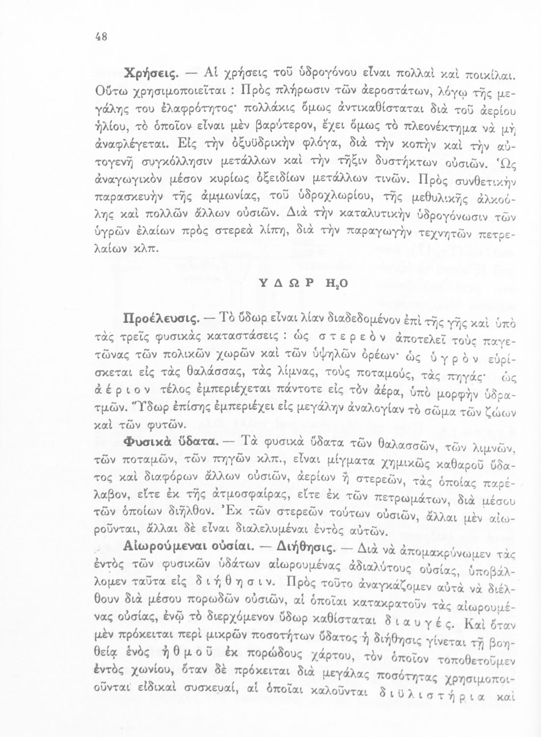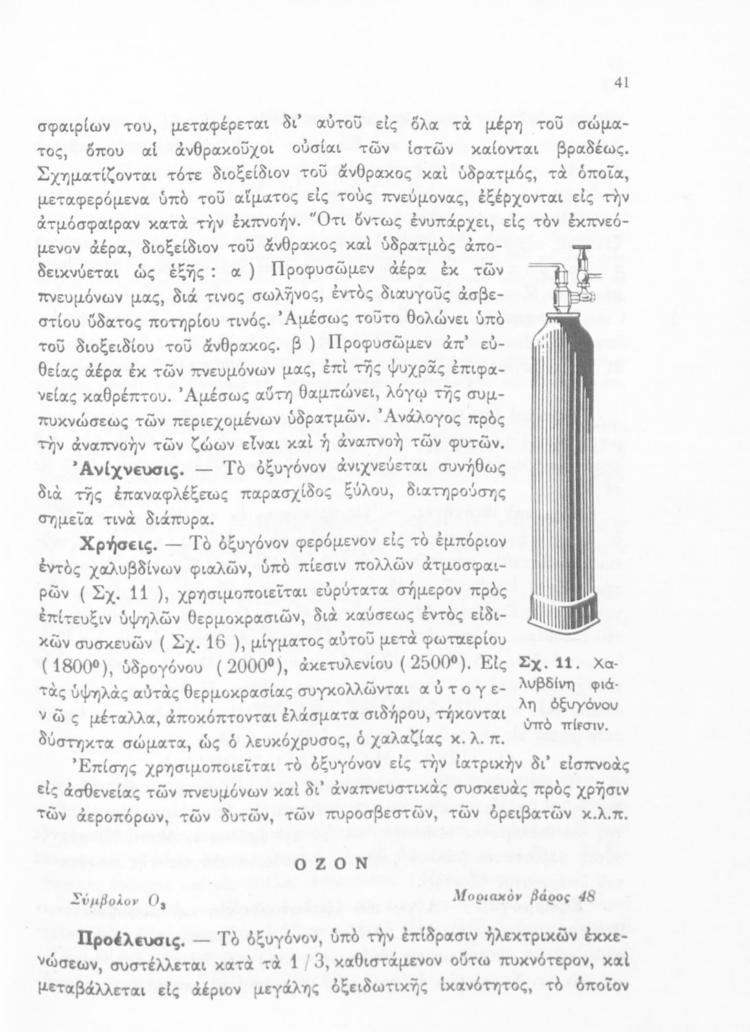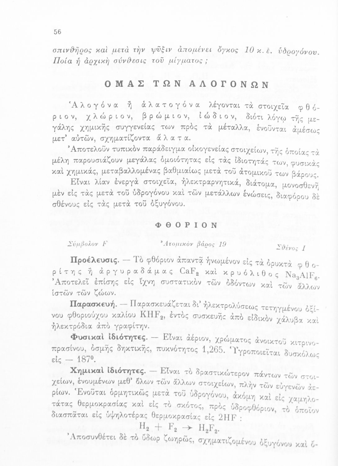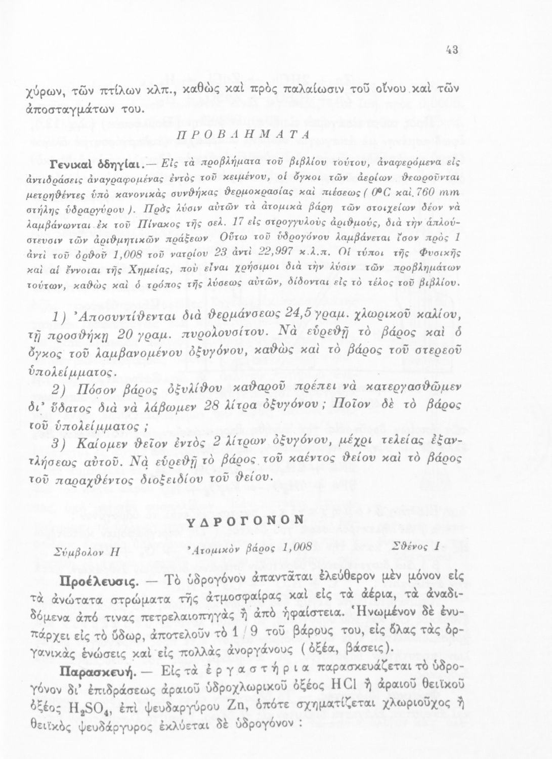 520 ## _aΣχολικό εγχειρίδιο Χημείας για τους μαθητές της Δ' Γυμνασίου. Χωρίζεται σε τρία μέρη. Στο πρώτο μέρος είναι μια γενική εισαγωγή που παρουσιάζει τους θεμελιώδεις νόμους της Χημείας, τις χημικές αντιδράσεις, τα χημικά σύμβολα. Στο δεύτερο και το τρίτο μέρος υπάρχει η παρουσίαση των αμέταλλων στοιχείων όπως το οξυγόνο, το άζωτο και ο άνθρακας, τα παράγωγά και τις ιδιότητες τους. Στο τρίτο παρουσιάζονται τα μέταλλα και τα παράγωγά τους όπως ο χρυσός, ο αργύλιος, ο χαλκός. Τέλος, το βιβλίο ολοκληρώνει με μια σύντομη εισαγωγή στη ραδιενέργεια.