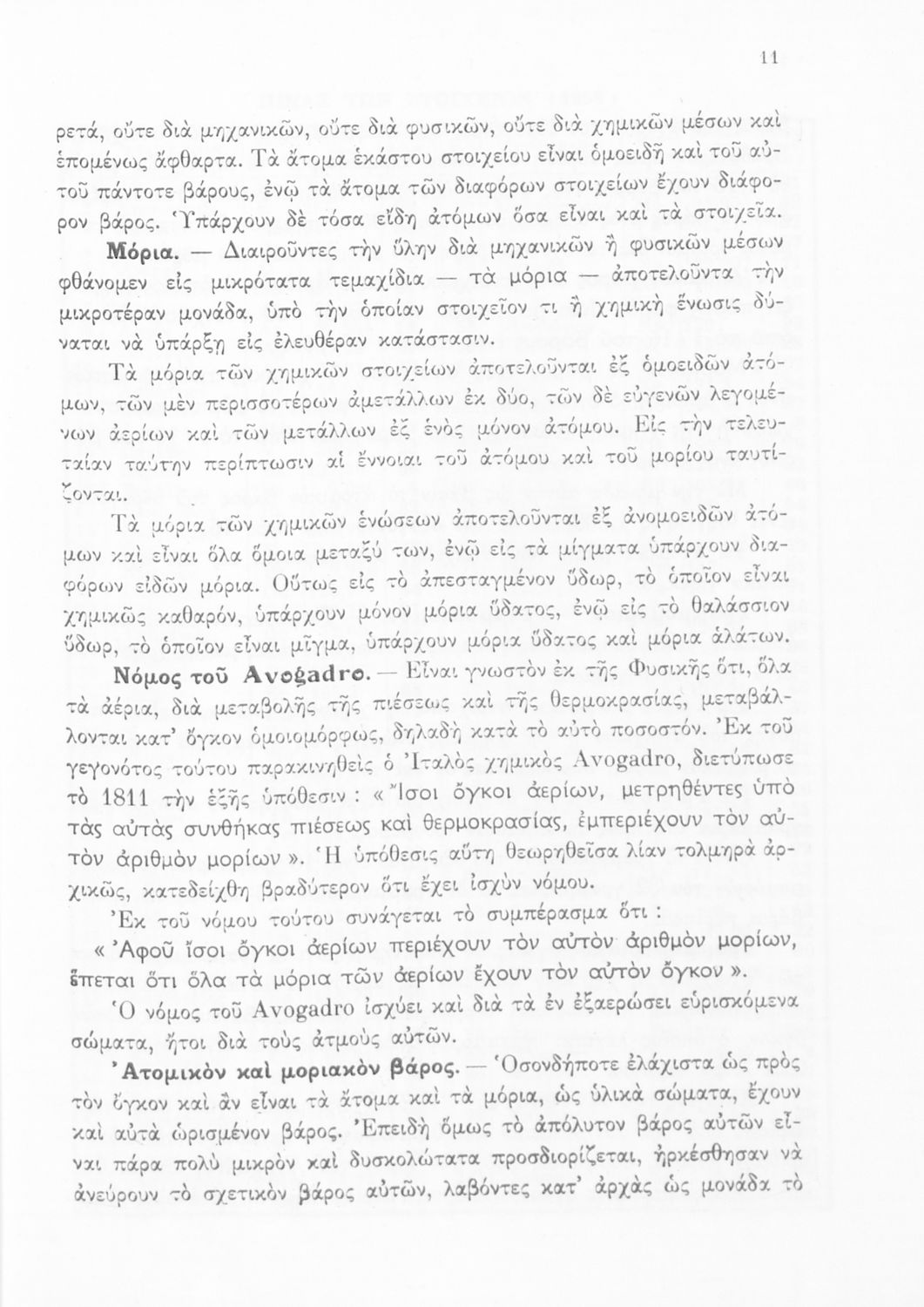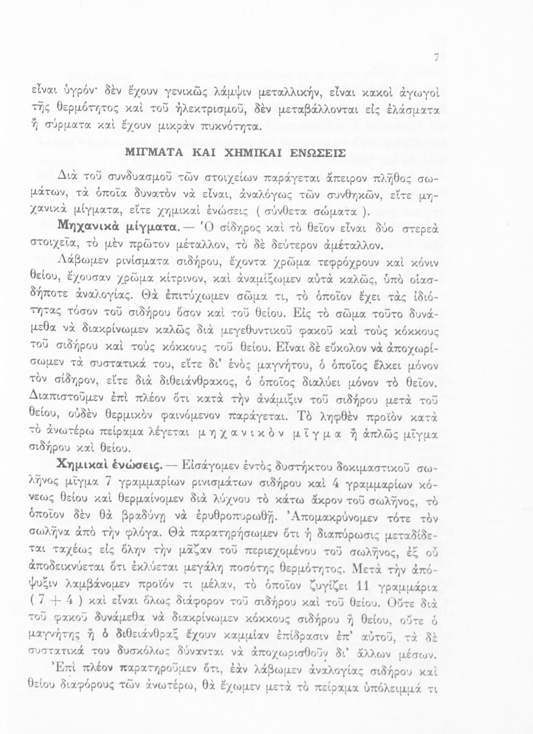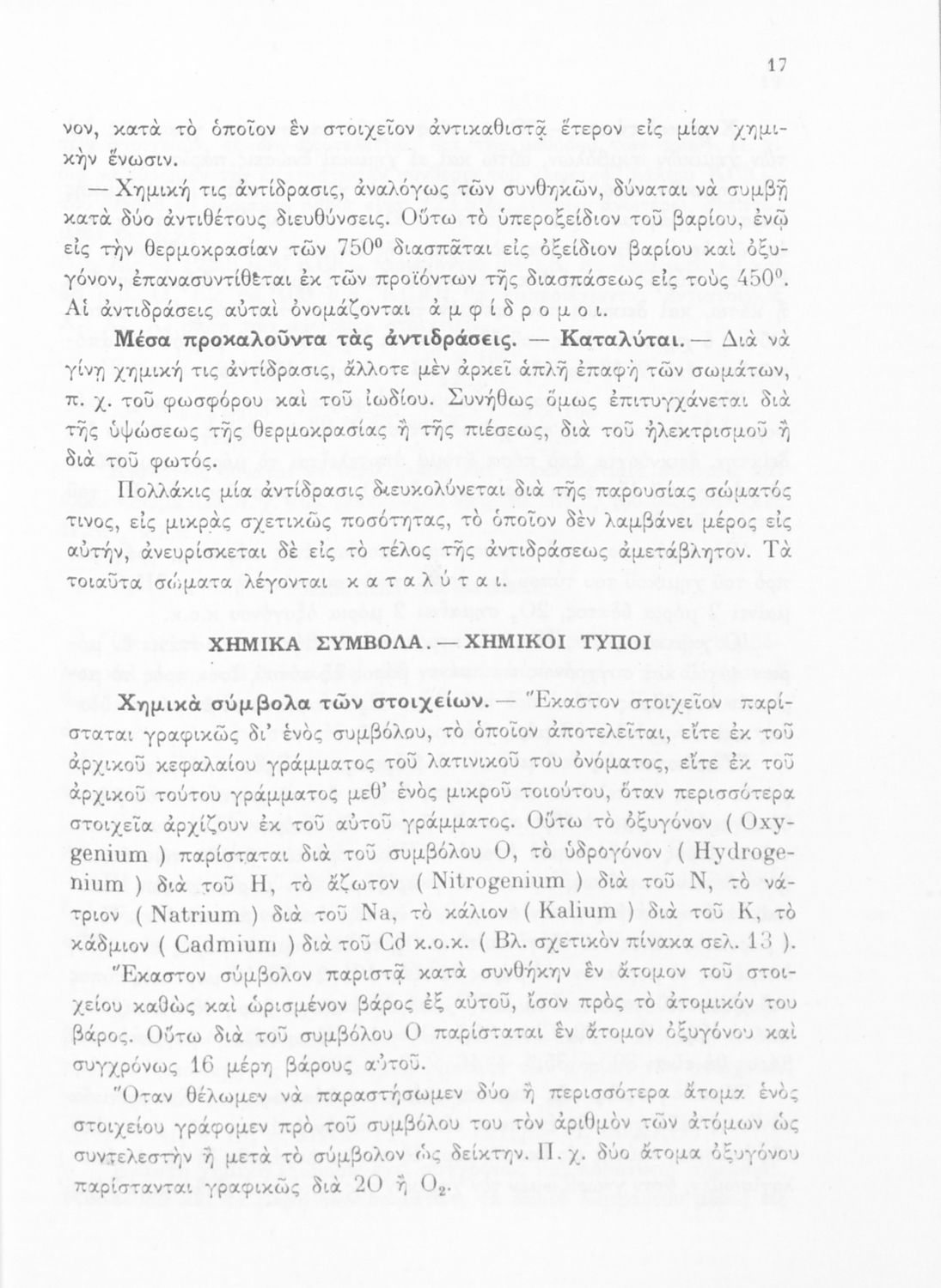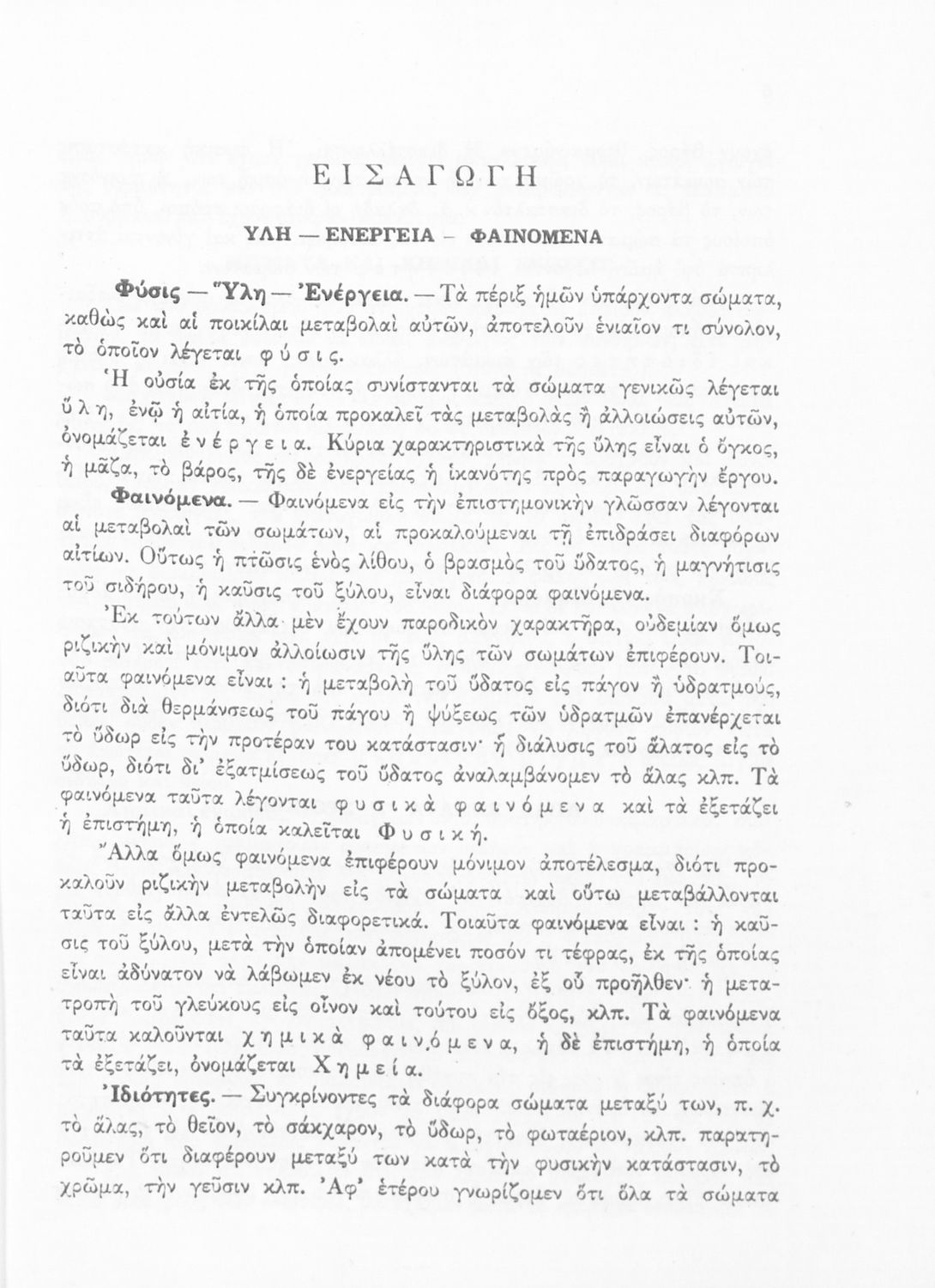 Σχολικό εγχειρίδιο Χημείας για τους μαθητές της Δ' Γυμνασίου. Χωρίζεται σε τρία μέρη. Στο πρώτο μέρος είναι μια γενική εισαγωγή που παρουσιάζει τους θεμελιώδεις νόμους της Χημείας, τις χημικές αντιδράσεις, τα χημικά σύμβολα. Στο δεύτερο και το τρίτο μέρος υπάρχει η παρουσίαση των αμέταλλων στοιχείων όπως το οξυγόνο, το άζωτο και ο άνθρακας, τα παράγωγά και τις ιδιότητες τους. Στο τρίτο παρουσιάζονται τα μέταλλα και τα παράγωγά τους όπως ο χρυσός, ο αργύλιος, ο χαλκός. Τέλος, το βιβλίο ολοκληρώνει με μια σύντομη εισαγωγή στη ραδιενέργεια.