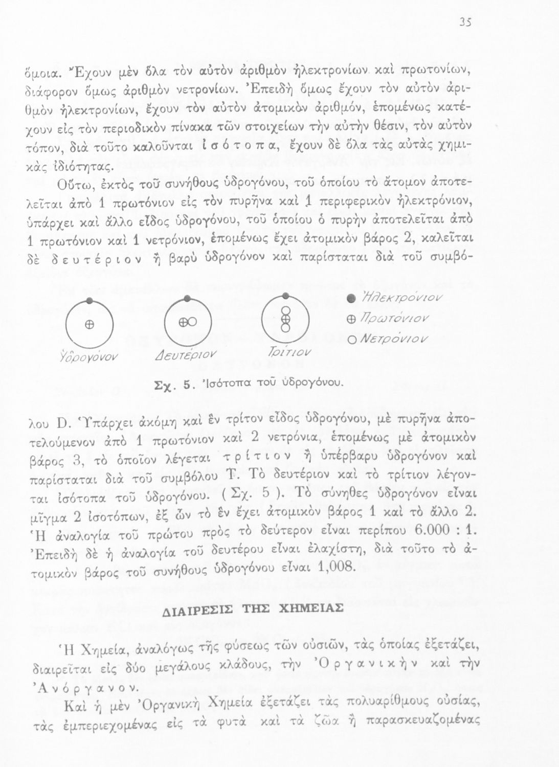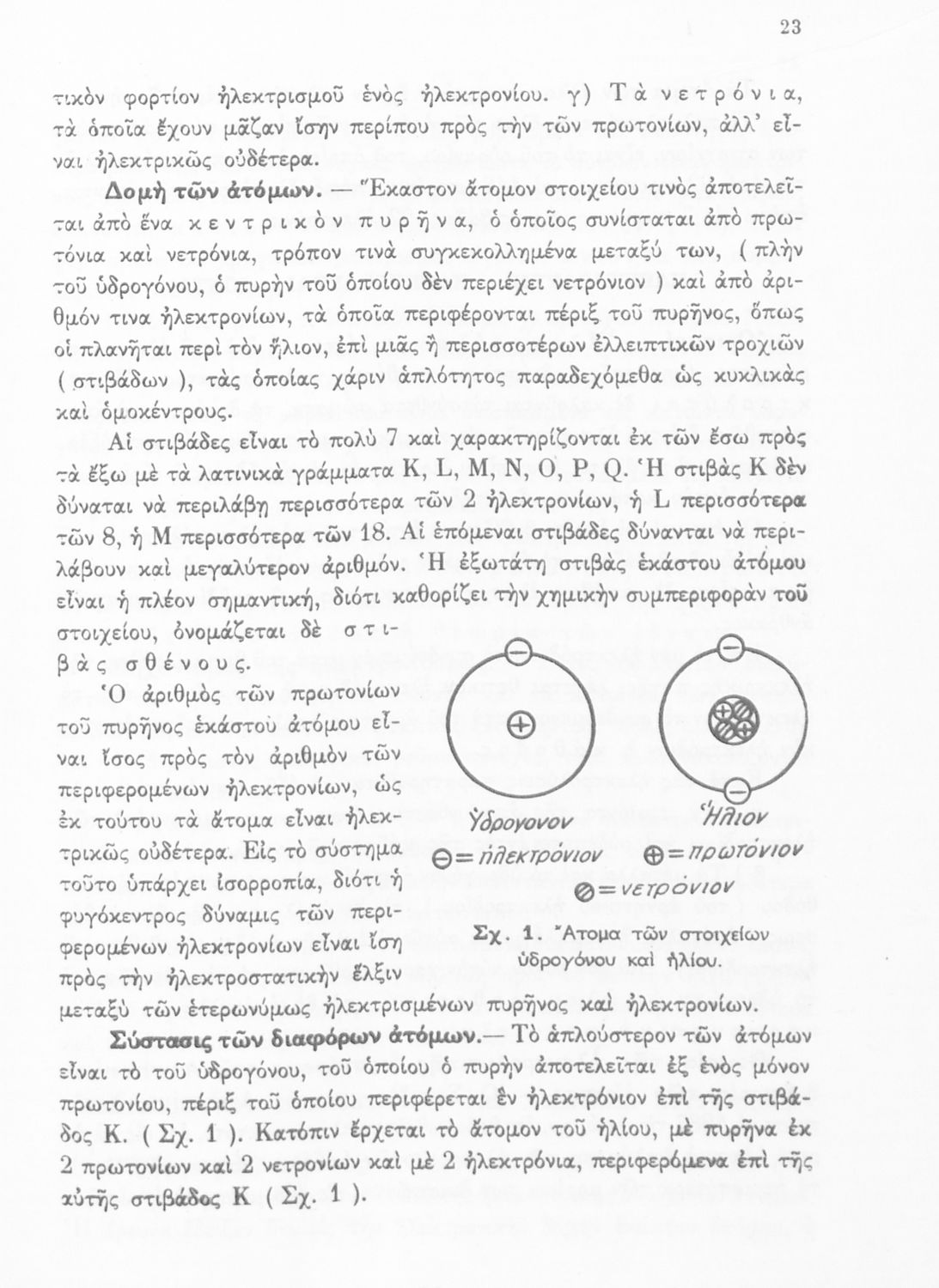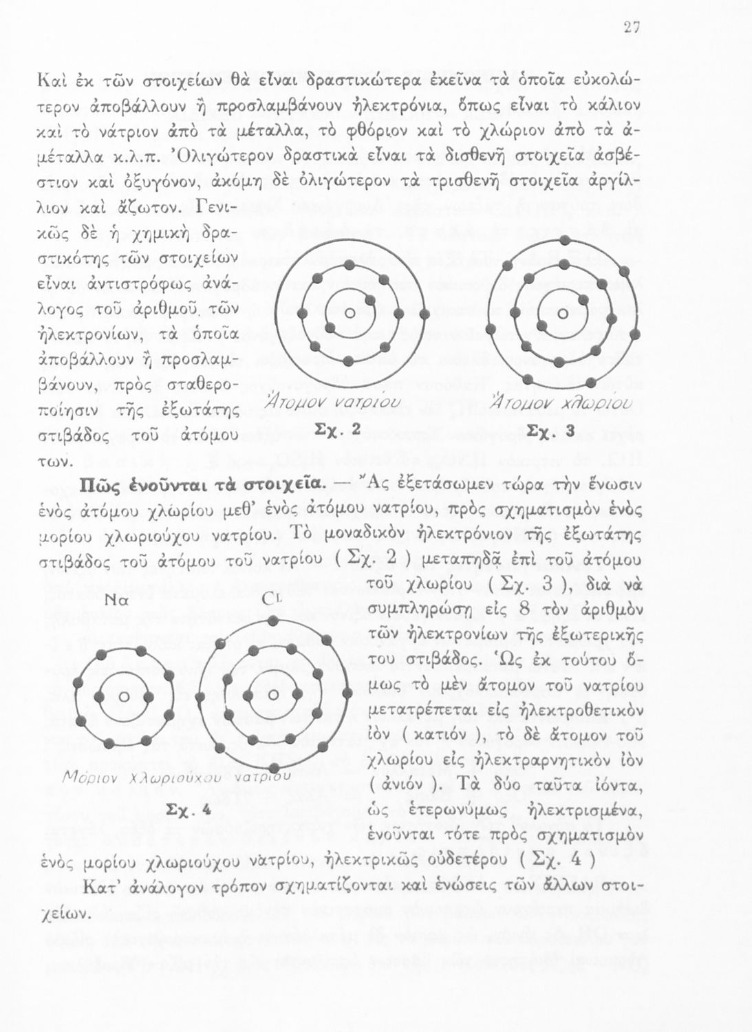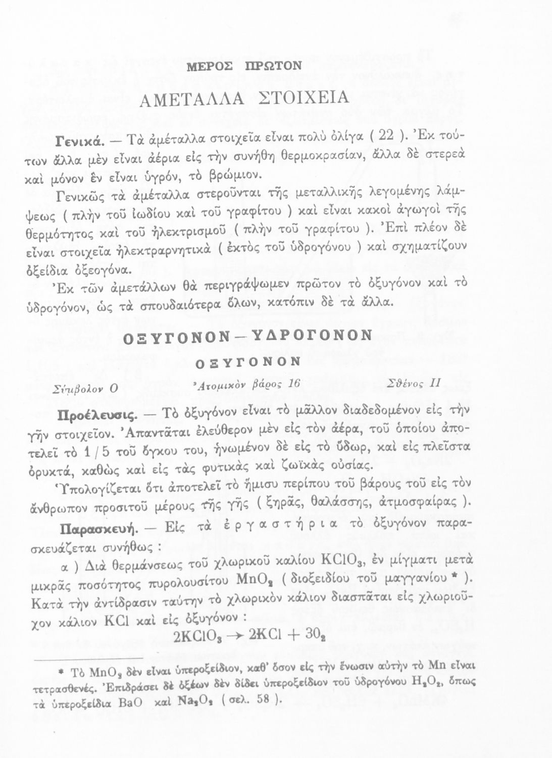 Σχολικό εγχειρίδιο Χημείας για τους μαθητές της Δ' και Ε' Γυμνασίου. Χωρίζεται σε τρία μέρη. Στο πρώτο μέρος είναι μια γενική εισαγωγή που παρουσιάζει τους θεμελιώδεις νόμους της Χημείας, τις χημικές αντιδράσεις, τα χημικά σύμβολα. Στο δεύτερο και το τρίτο μέρος υπάρχει η παρουσίαση των αμέταλλων στοιχείων όπως το οξυγόνο, το άζωτο και ο άνθρακας, τα παράγωγά και τις ιδιότητες τους. Στο τρίτο παρουσιάζονται τα μέταλλα και τα παράγωγά τους όπως ο χρυσός, ο αργύλιος, ο χαλκός. Τέλος, το βιβλίο ολοκληρώνει με μια σύντομη εισαγωγή στη ραδιενέργεια.