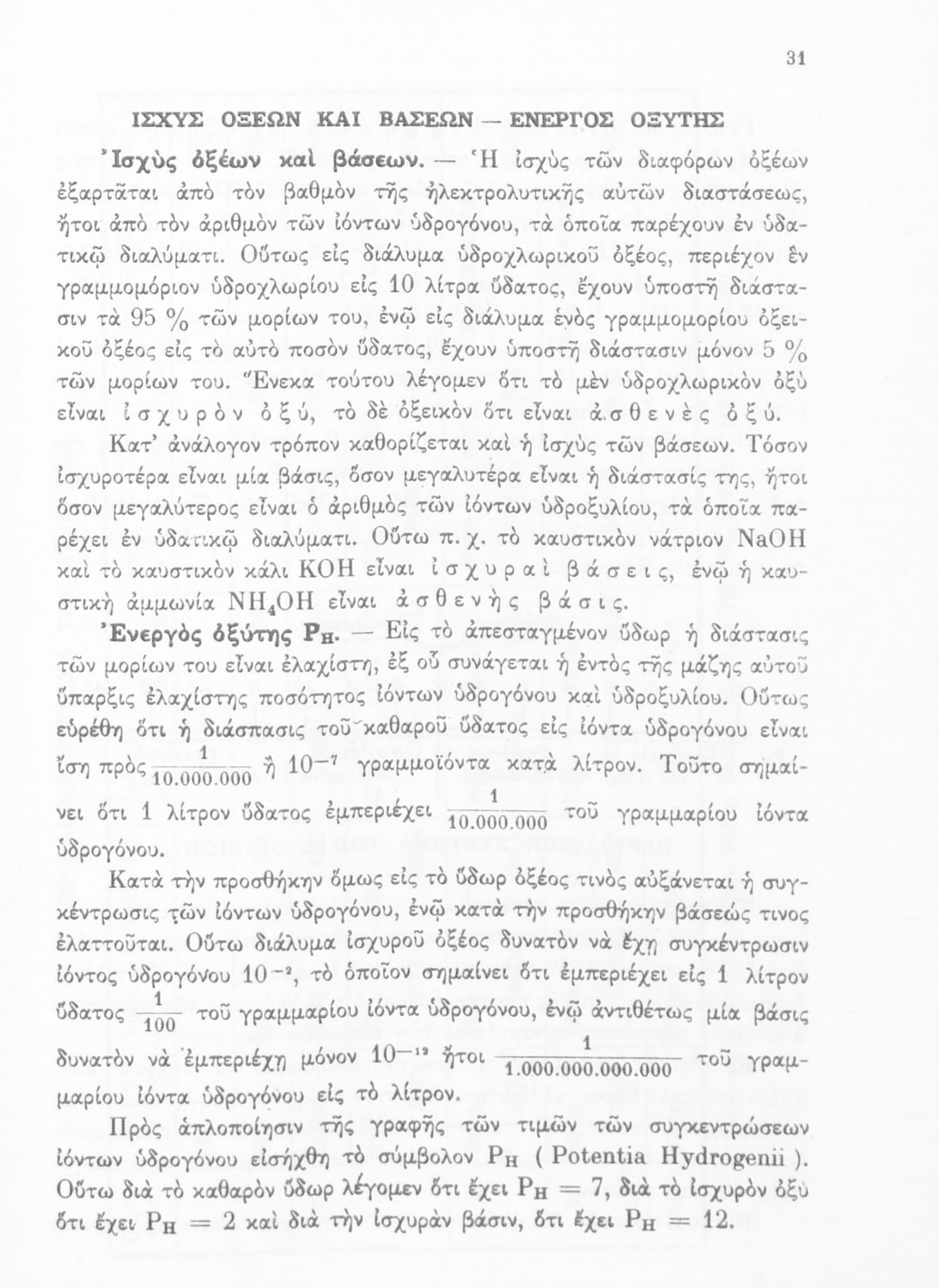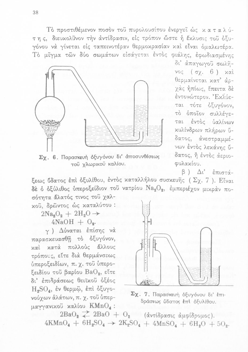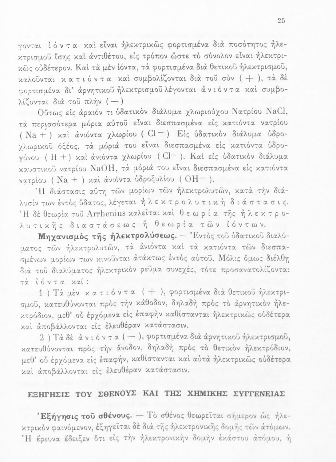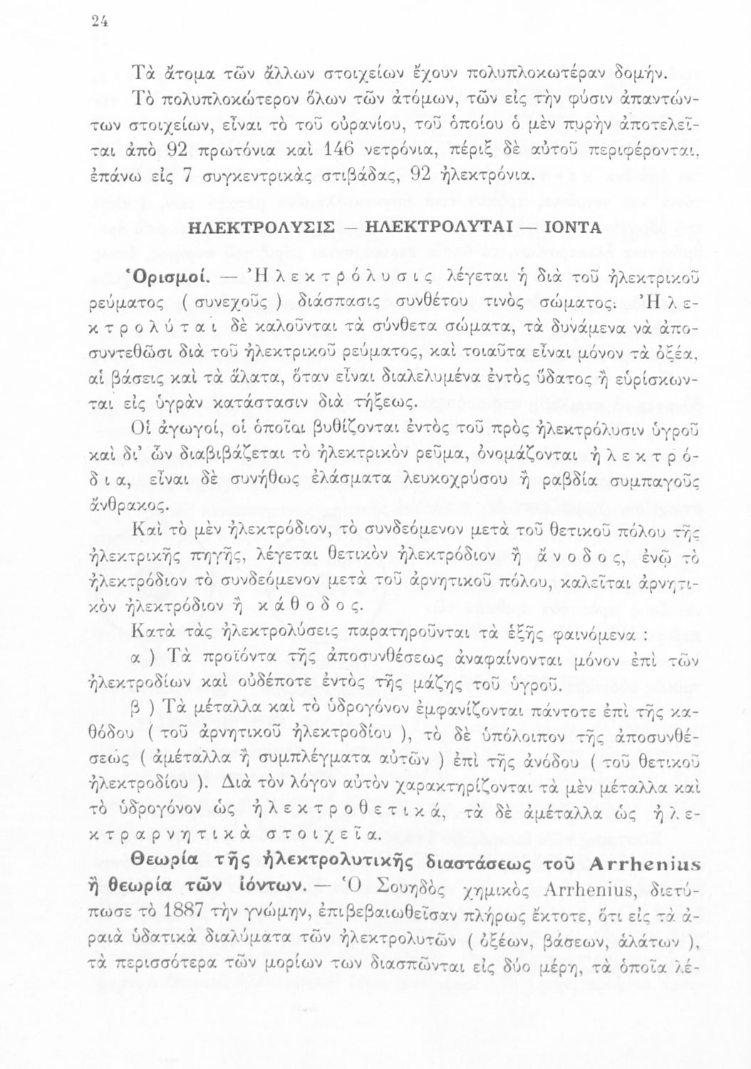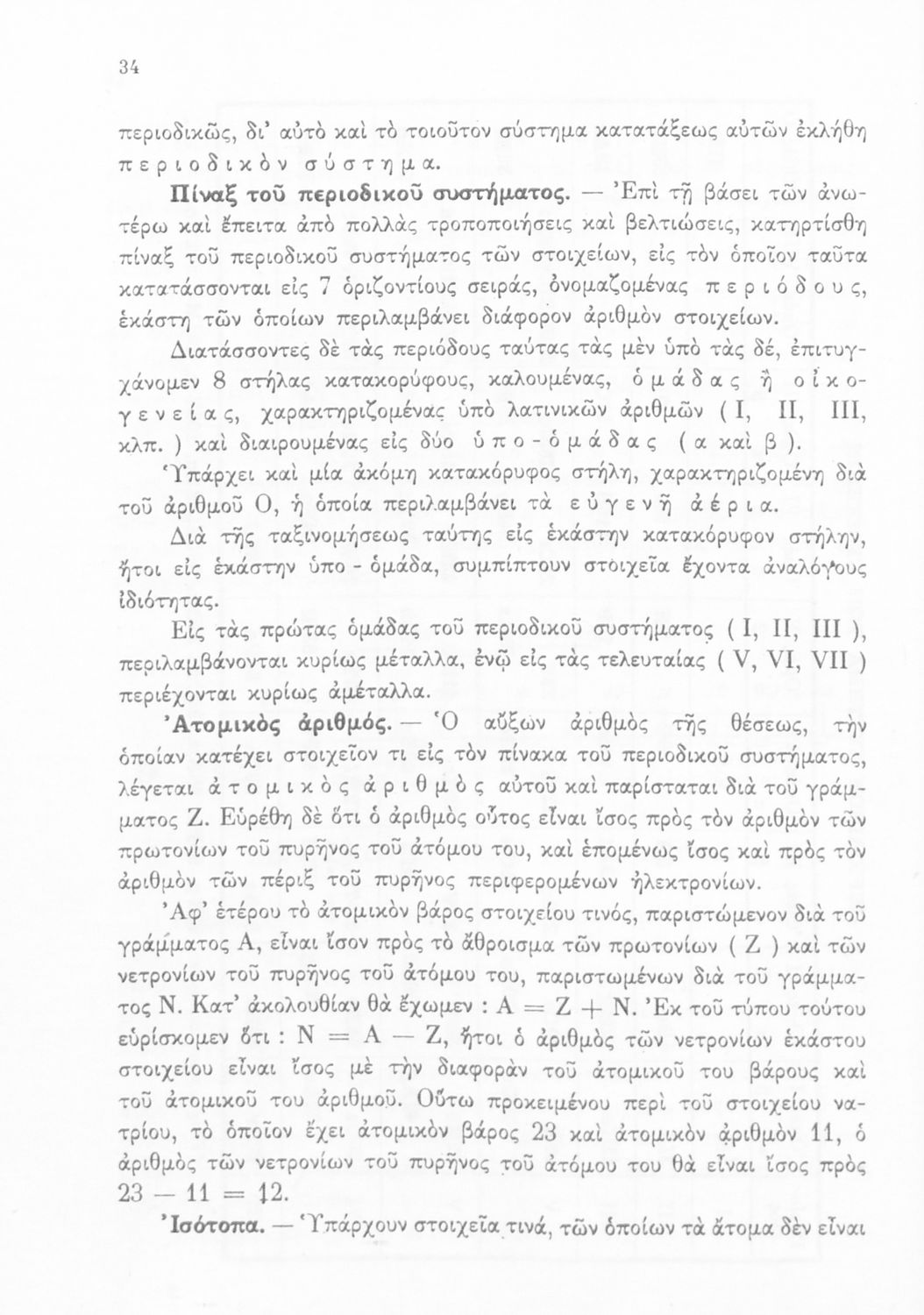 Σχολικό εγχειρίδιο Χημείας για τους μαθητές της Δ' και Ε' Γυμνασίου. Χωρίζεται σε τρία μέρη. Στο πρώτο μέρος είναι μια γενική εισαγωγή που παρουσιάζει τους θεμελιώδεις νόμους της Χημείας, τις χημικές αντιδράσεις, τα χημικά σύμβολα. Στο δεύτερο και το τρίτο μέρος υπάρχει η παρουσίαση των αμέταλλων στοιχείων όπως το οξυγόνο, το άζωτο και ο άνθρακας, τα παράγωγά και τις ιδιότητες τους. Στο τρίτο παρουσιάζονται τα μέταλλα και τα παράγωγά τους όπως ο χρυσός, ο αργύλιος, ο χαλκός. Τέλος, το βιβλίο ολοκληρώνει με μια σύντομη εισαγωγή στη ραδιενέργεια.