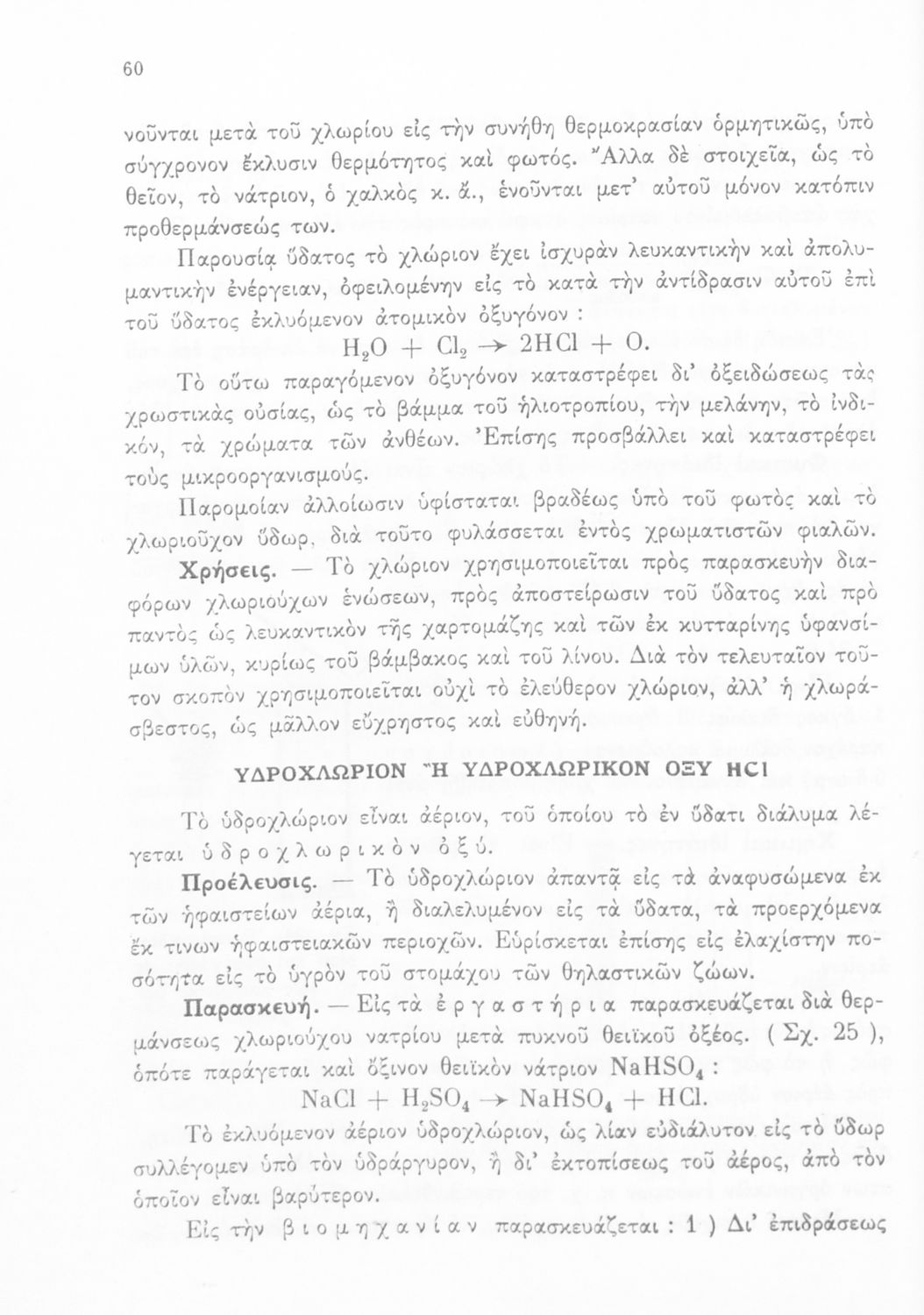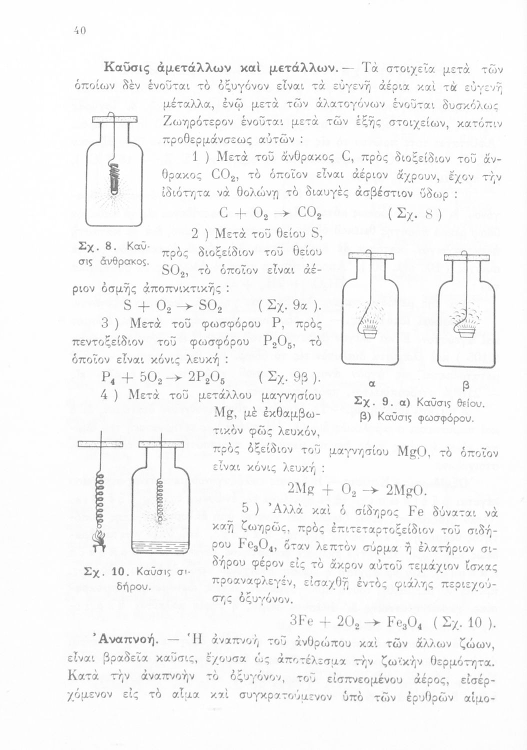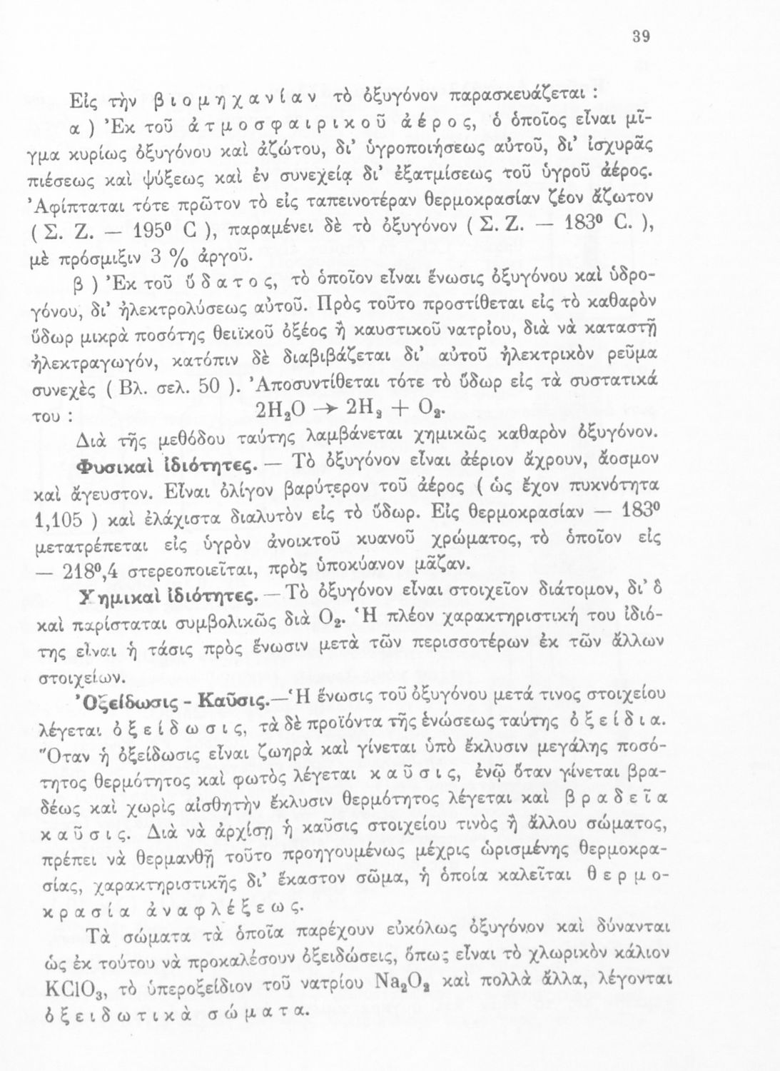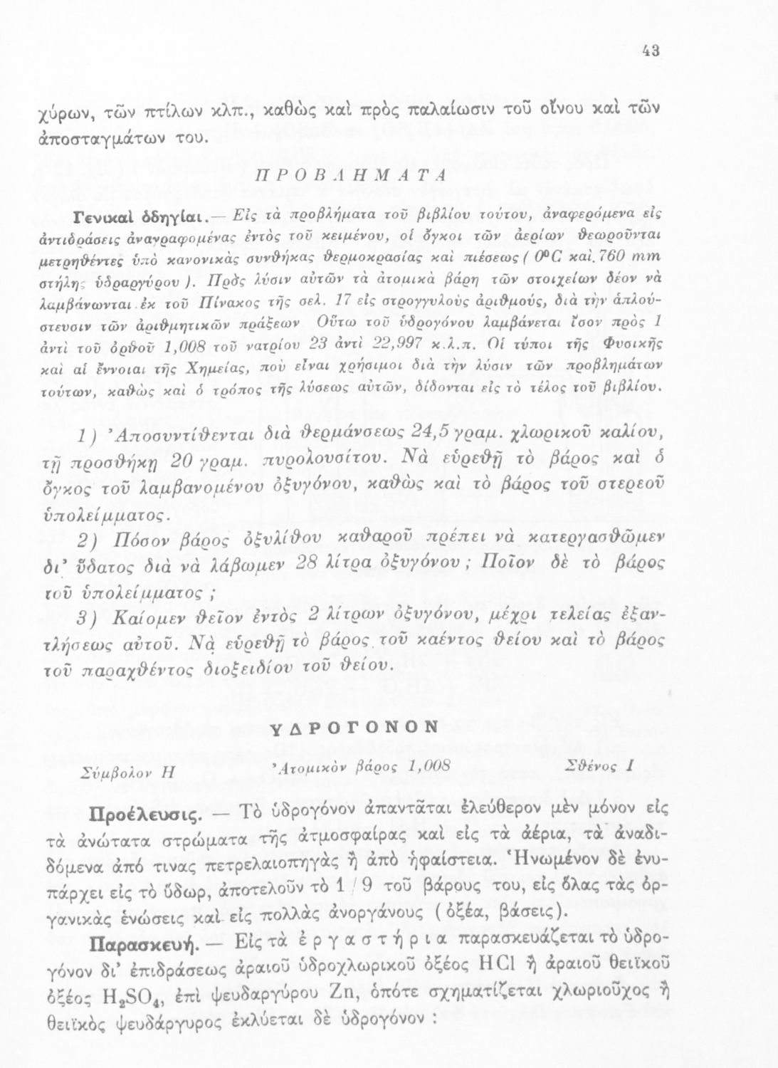 Σχολικό εγχειρίδιο Χημείας για τους μαθητές της Δ' και Ε' Γυμνασίου. Χωρίζεται σε τρία μέρη. Στο πρώτο μέρος είναι μια γενική εισαγωγή που παρουσιάζει τους θεμελιώδεις νόμους της Χημείας, τις χημικές αντιδράσεις, τα χημικά σύμβολα. Στο δεύτερο και το τρίτο μέρος υπάρχει η παρουσίαση των αμέταλλων στοιχείων όπως το οξυγόνο, το άζωτο και ο άνθρακας, τα παράγωγά και τις ιδιότητες τους. Στο τρίτο παρουσιάζονται τα μέταλλα και τα παράγωγά τους όπως ο χρυσός, ο αργύλιος, ο χαλκός. Τέλος, το βιβλίο ολοκληρώνει με μια σύντομη εισαγωγή στη ραδιενέργεια.
