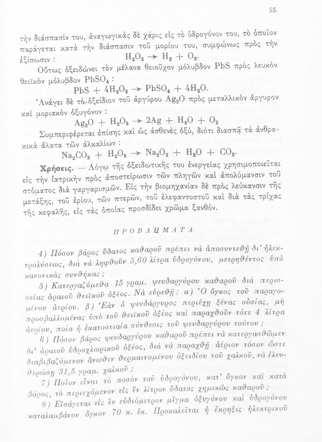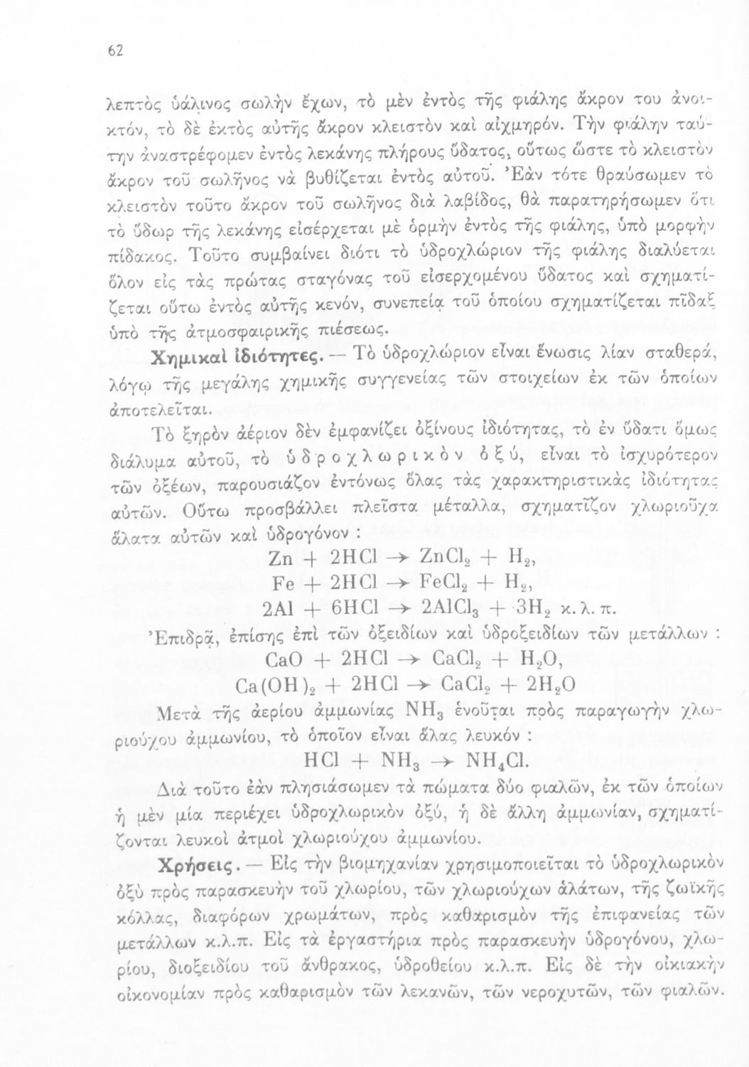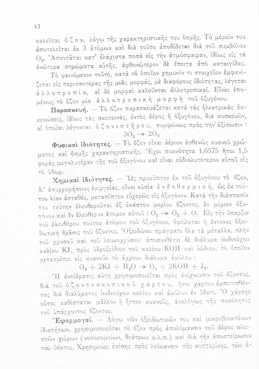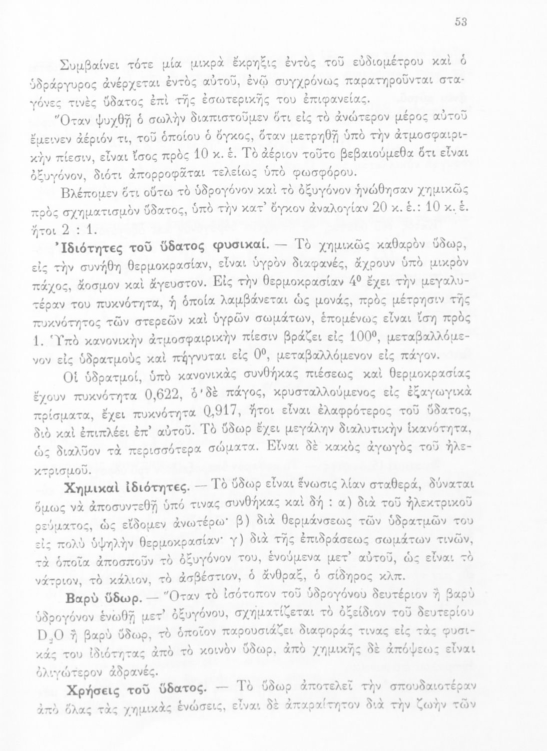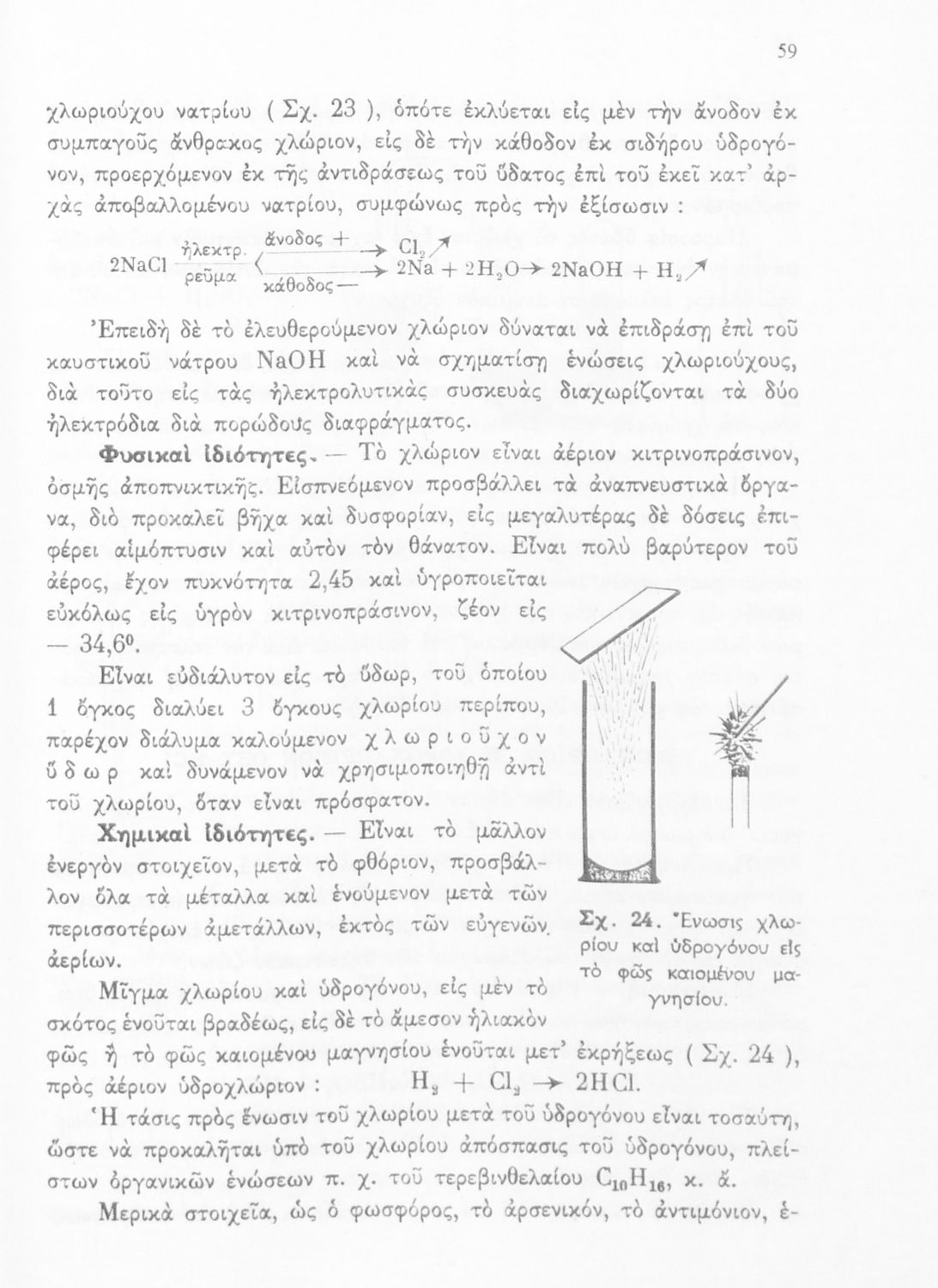 Σχολικό εγχειρίδιο Χημείας για τους μαθητές της Δ' και Ε' Γυμνασίου. Χωρίζεται σε τρία μέρη. Στο πρώτο μέρος είναι μια γενική εισαγωγή που παρουσιάζει τους θεμελιώδεις νόμους της Χημείας, τις χημικές αντιδράσεις, τα χημικά σύμβολα. Στο δεύτερο και το τρίτο μέρος υπάρχει η παρουσίαση των αμέταλλων στοιχείων όπως το οξυγόνο, το άζωτο και ο άνθρακας, τα παράγωγά και τις ιδιότητες τους. Στο τρίτο παρουσιάζονται τα μέταλλα και τα παράγωγά τους όπως ο χρυσός, ο αργύλιος, ο χαλκός. Τέλος, το βιβλίο ολοκληρώνει με μια σύντομη εισαγωγή στη ραδιενέργεια.