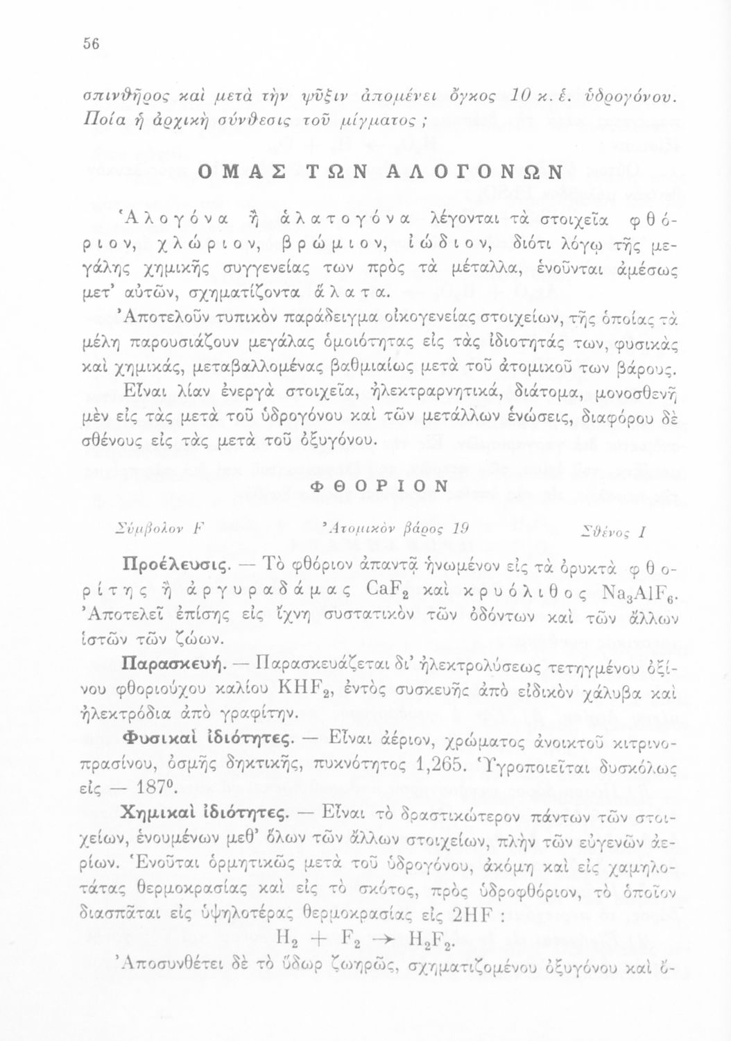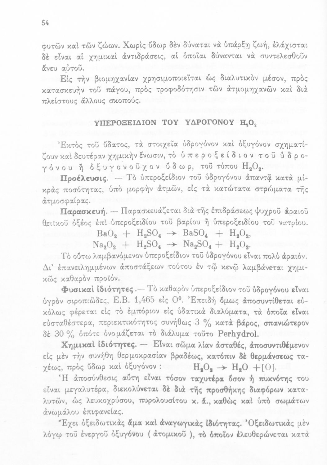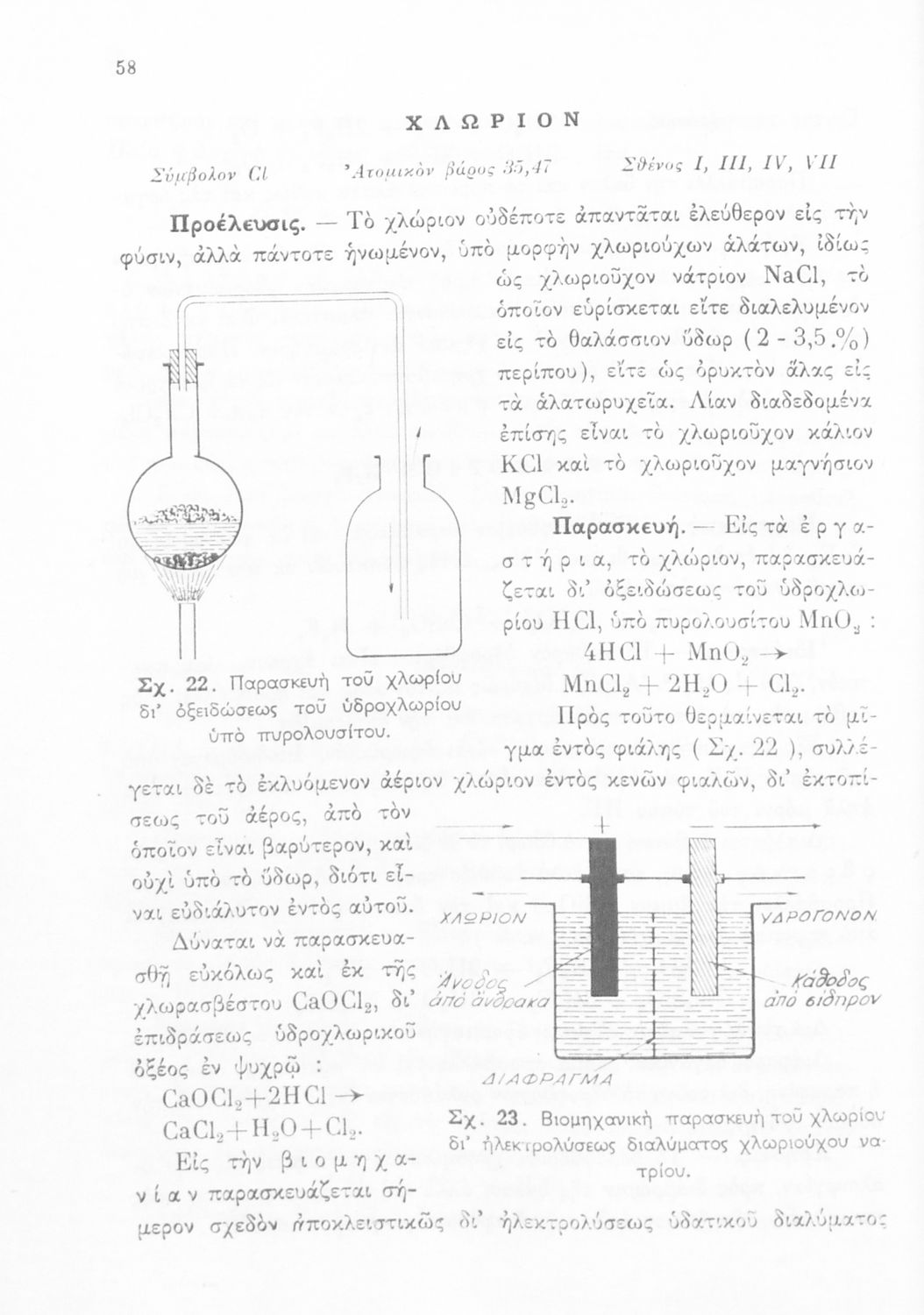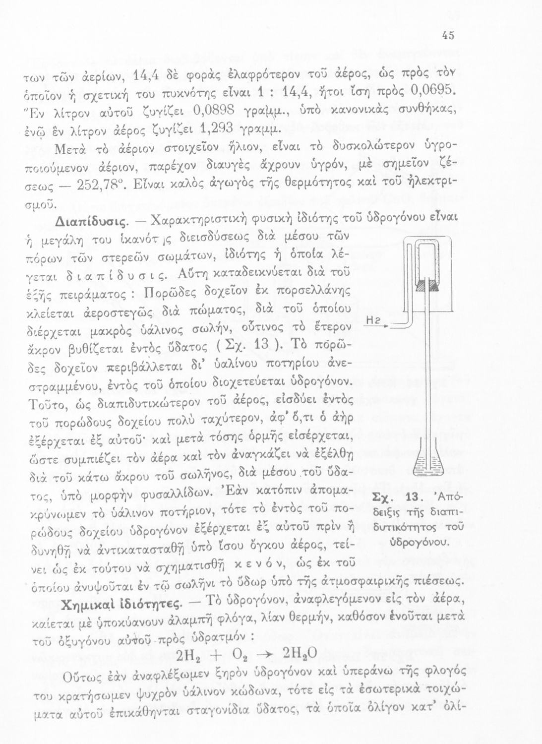 Σχολικό εγχειρίδιο Χημείας για τους μαθητές της Δ' και Ε' Γυμνασίου. Χωρίζεται σε τρία μέρη. Στο πρώτο μέρος είναι μια γενική εισαγωγή που παρουσιάζει τους θεμελιώδεις νόμους της Χημείας, τις χημικές αντιδράσεις, τα χημικά σύμβολα. Στο δεύτερο και το τρίτο μέρος υπάρχει η παρουσίαση των αμέταλλων στοιχείων όπως το οξυγόνο, το άζωτο και ο άνθρακας, τα παράγωγά και τις ιδιότητες τους. Στο τρίτο παρουσιάζονται τα μέταλλα και τα παράγωγά τους όπως ο χρυσός, ο αργύλιος, ο χαλκός. Τέλος, το βιβλίο ολοκληρώνει με μια σύντομη εισαγωγή στη ραδιενέργεια.