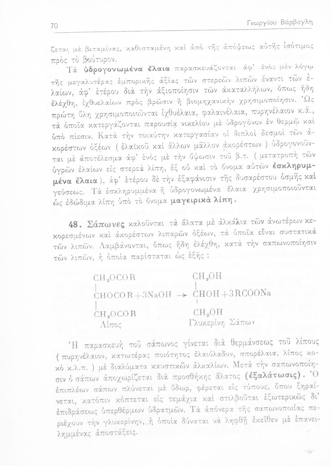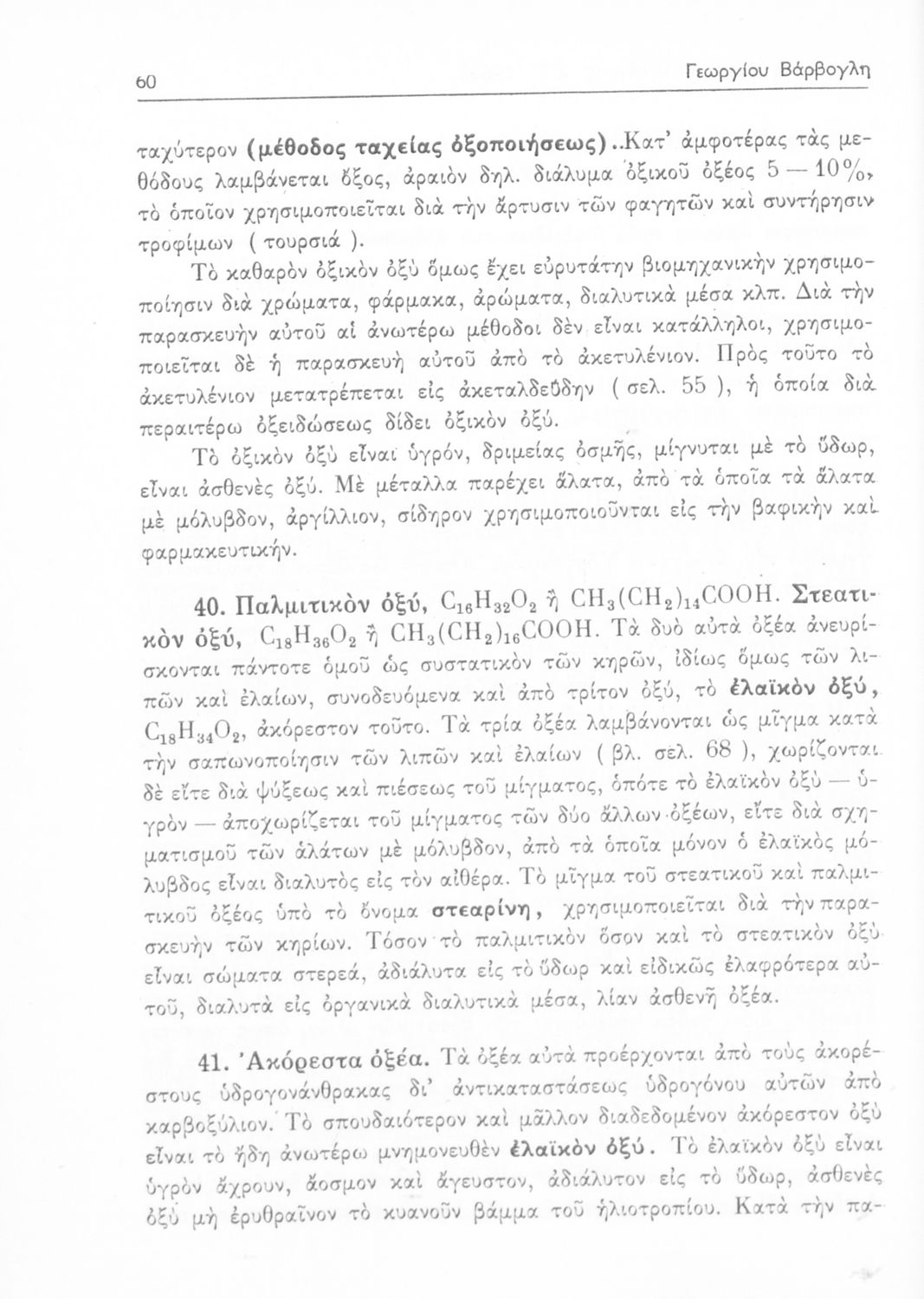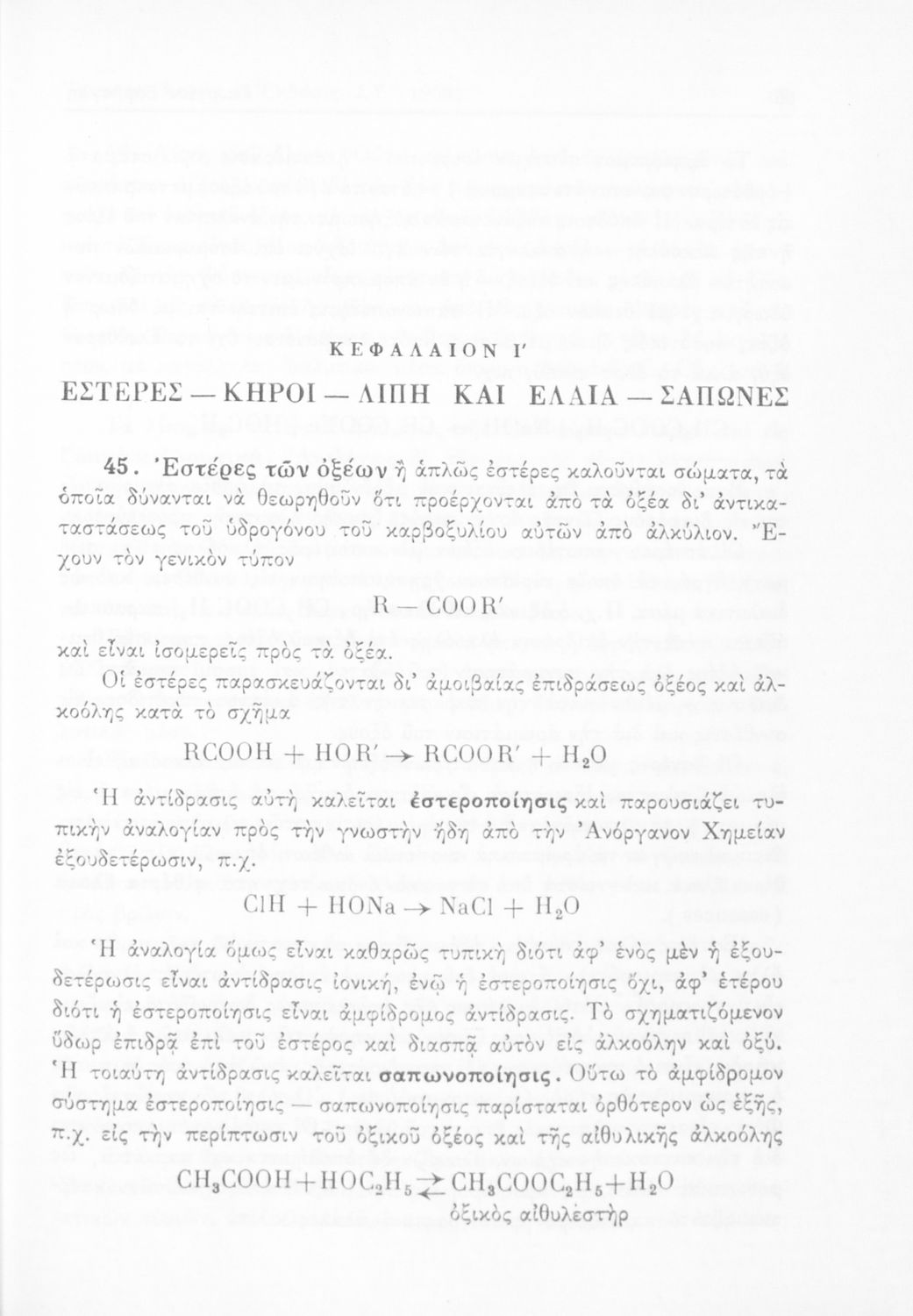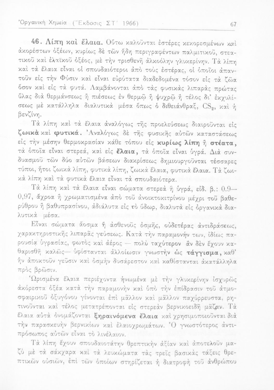 Σχολικό εγχειρίδιο Χημείας που προσδιορίζει τη σύσταση οργανικών ουσιών και τη μοριακή σύσταση τους. Περιγράφονται αναλυτικά οι οργανικές ενώσεις, οι ιδιότητες και η παρασκευή των οξέων-ελαίων-λιπών, η σύσταση