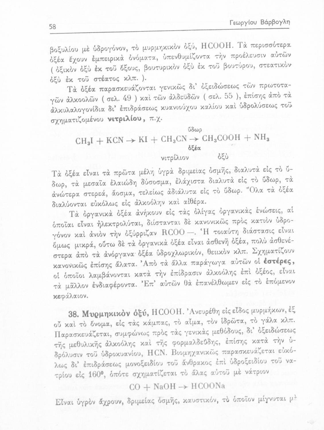 Βαθμίδα εκπαίδευσης: Δευτεροβάθμια Τάξη: ΣΤ' Γυμνασίου Μάθημα: Χημεία Γλώσσα: Καθαρεύουσα Παρουσίαση περιεχομένου: Σχολικό εγχειρίδιο Χημείας για τους μαθητές της ΣΤ΄ τάξης του Γυμνασίου. Το βιβλίο εισάγει τους μαθητές στην οργανική χημεία, εξετάζει τις οργανικές ενώσεις του άνθρακα τις πρωτεΐνες και τα οξέα. Κλείνει παρουσιάζοντας εφαρμογές των χημικών ενώσεων σε καθημερινά προϊόντα όπως είναι οι συνθετικές υφαντικές ύλες και τα πλαστικά. |