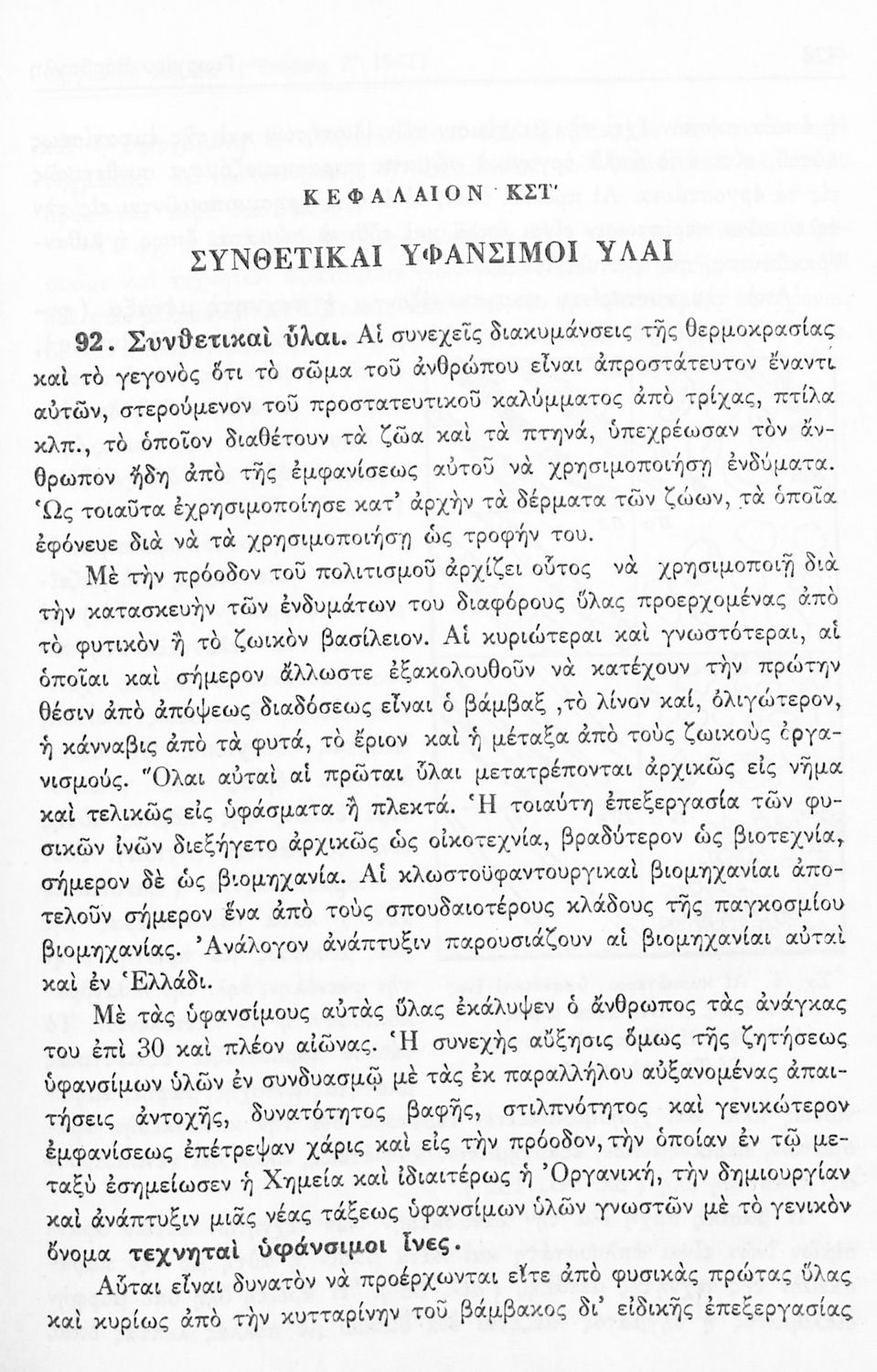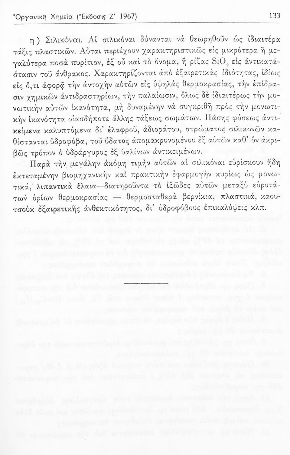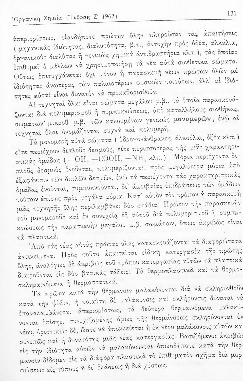Σχολικό εγχειρίδιο Χημείας για τους μαθητές της Γ΄ Λυκείου. Το βιβλίο εισάγει τους μαθητές στην οργανική χημεία, εξετάζει τις οργανικές ενώσεις του άνθρακα τις πρωτεΐνες και τα οξέα. Κλείνει παρουσιάζοντας εφαρμογές των χημικών ενώσεων σε καθημερινά προϊόντα όπως είναι οι συνθετικές υφαντικές ύλες και τα πλαστικά.