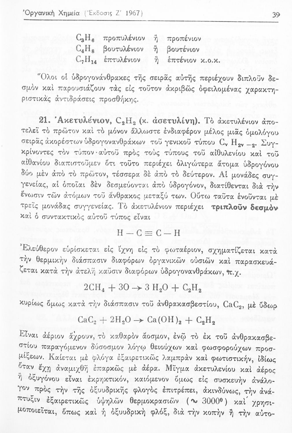 Βαθμίδα εκπαίδευσης: Δευτεροβάθμια Τάξη: Γ' Λυκείου Μάθημα: Χημεία Γλώσσα: Απλή καθαρεύουσα Παρουσίαση περιεχομένου: Σχολικό εγχειρίδιο Χημείας για τους μαθητές της Γ΄ Λυκείου. Το βιβλίο εισάγει τους μαθητές στην οργανική χημεία, εξετάζει τις οργανικές ενώσεις του άνθρακα τις πρωτεΐνες και τα οξέα. Κλείνει παρουσιάζοντας εφαρμογές των χημικών ενώσεων σε καθημερινά προϊόντα όπως είναι οι συνθετικές υφαντικές ύλες και τα πλαστικά. |