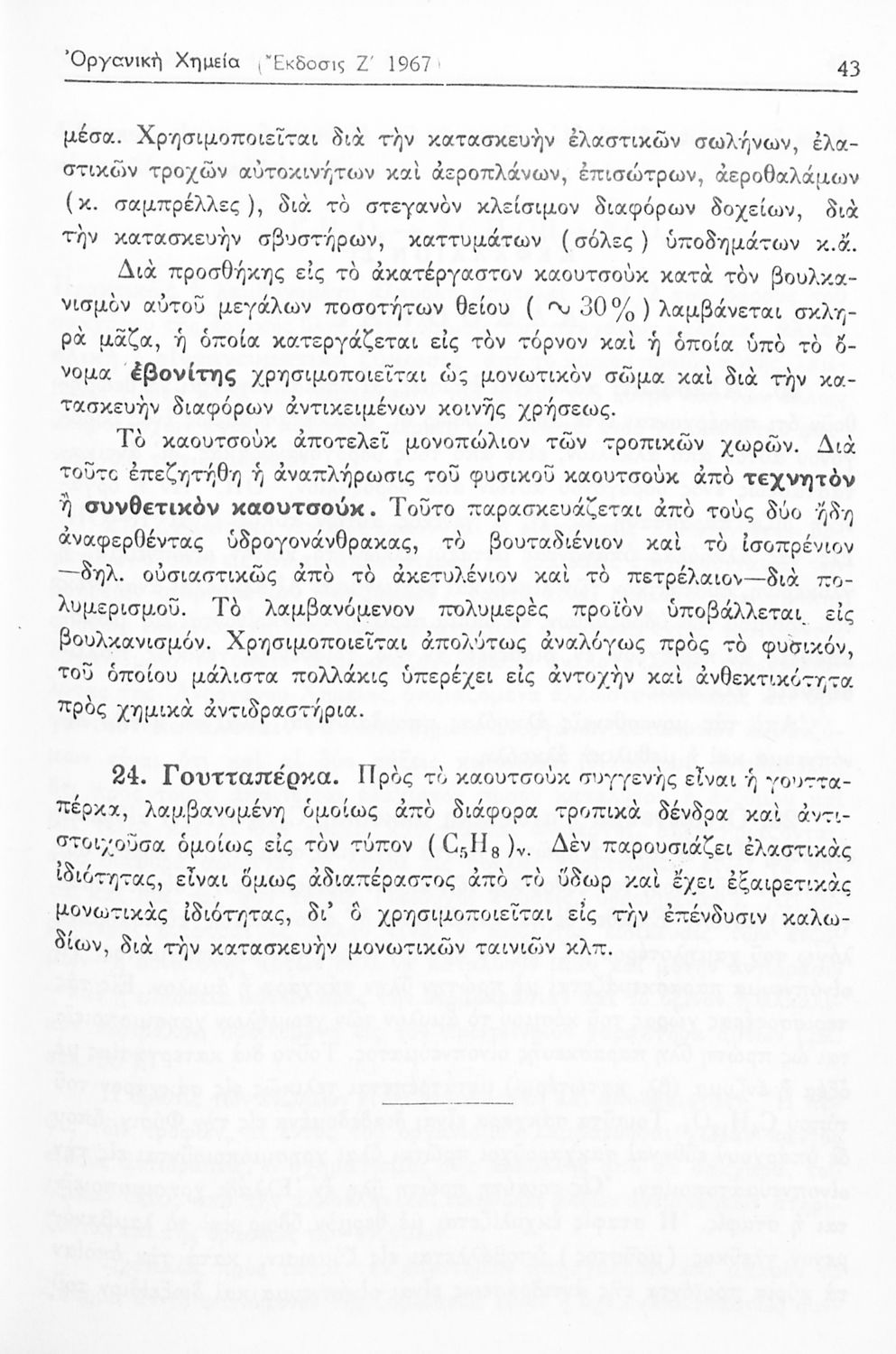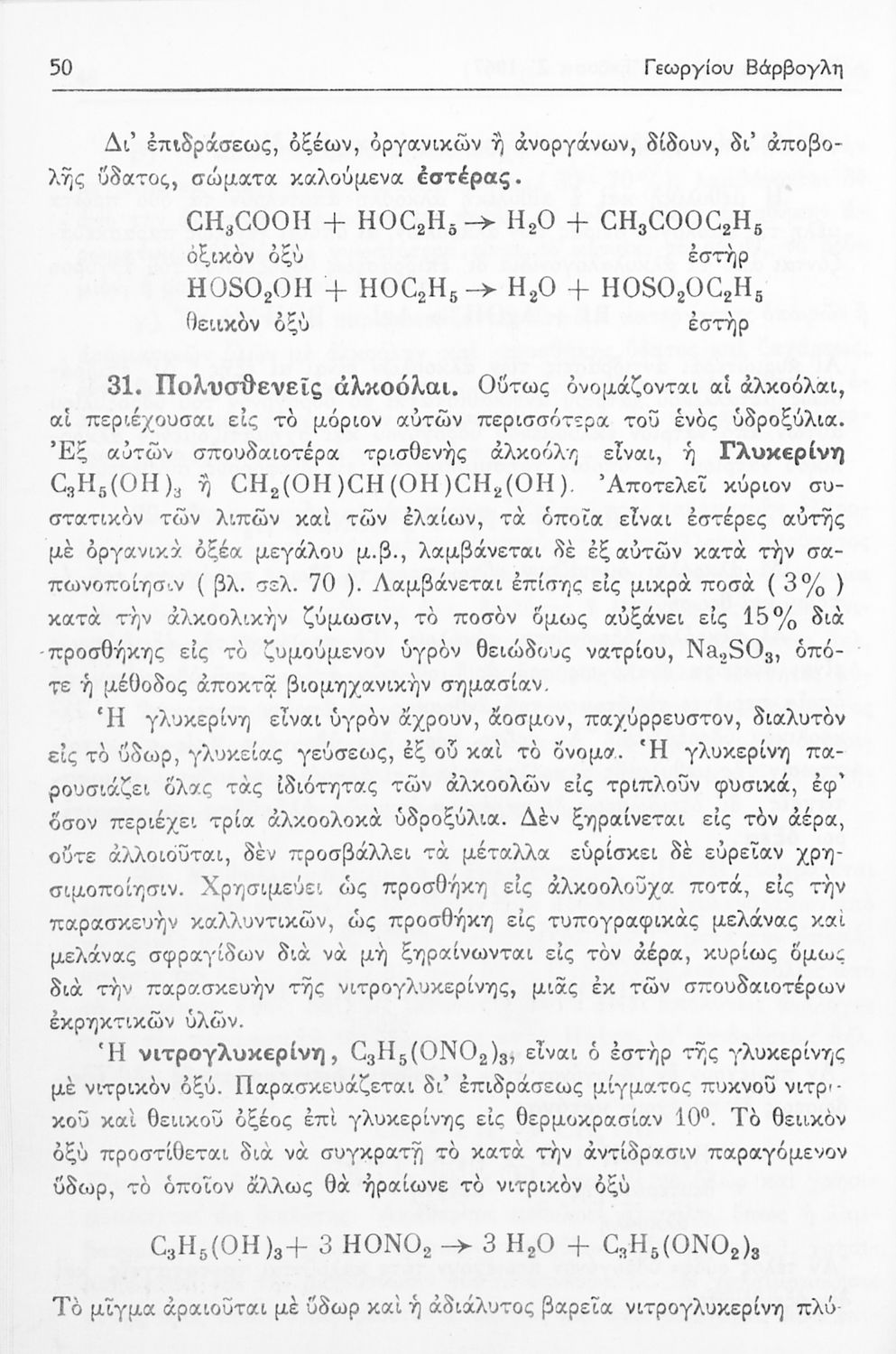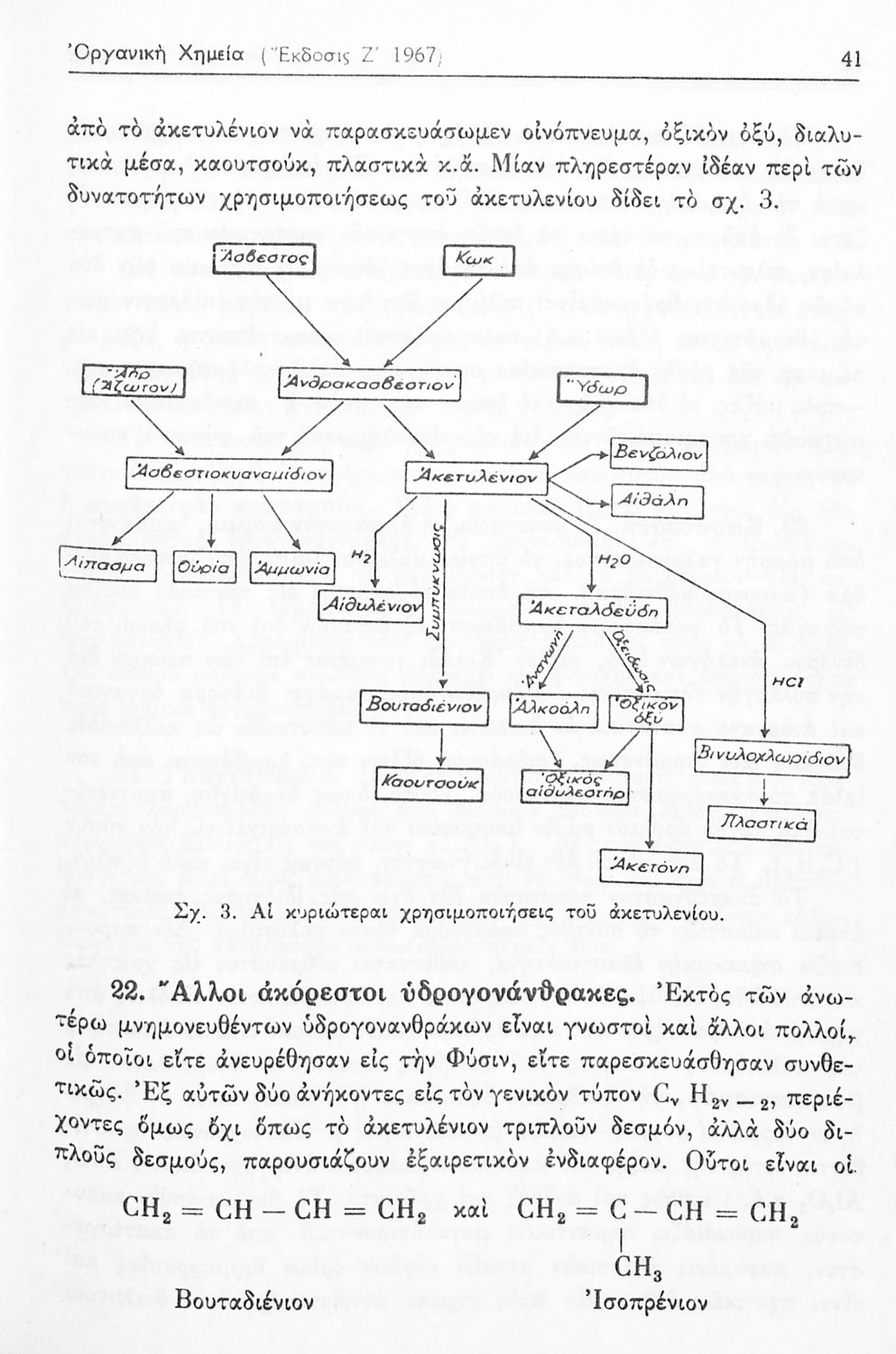 Σχολικό εγχειρίδιο Χημείας για τους μαθητές της Γ΄ Λυκείου. Το βιβλίο εισάγει τους μαθητές στην οργανική χημεία, εξετάζει τις οργανικές ενώσεις του άνθρακα τις πρωτεΐνες και τα οξέα. Κλείνει παρουσιάζοντας εφαρμογές των χημικών ενώσεων σε καθημερινά προϊόντα όπως είναι οι συνθετικές υφαντικές ύλες και τα πλαστικά.