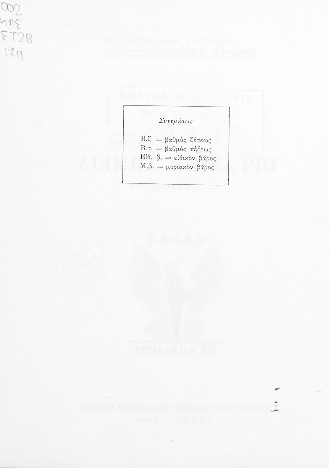 Εκδότης: Οργανισμός Εκδόσεως Διδακτικών Βιβλίων Έτος έκδοσης: 1969 Τόπος έκδοσης: Αθήνα Έκδοση: 9η Υπουργική απόφαση / Σύμβαση: 1886/ 31-5-1969 Έτος έγκρισης: 1969 |