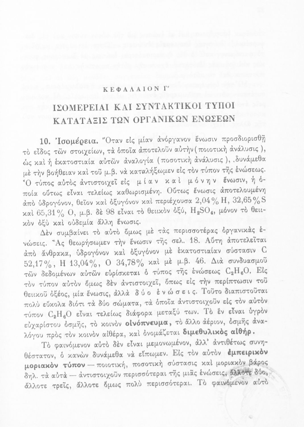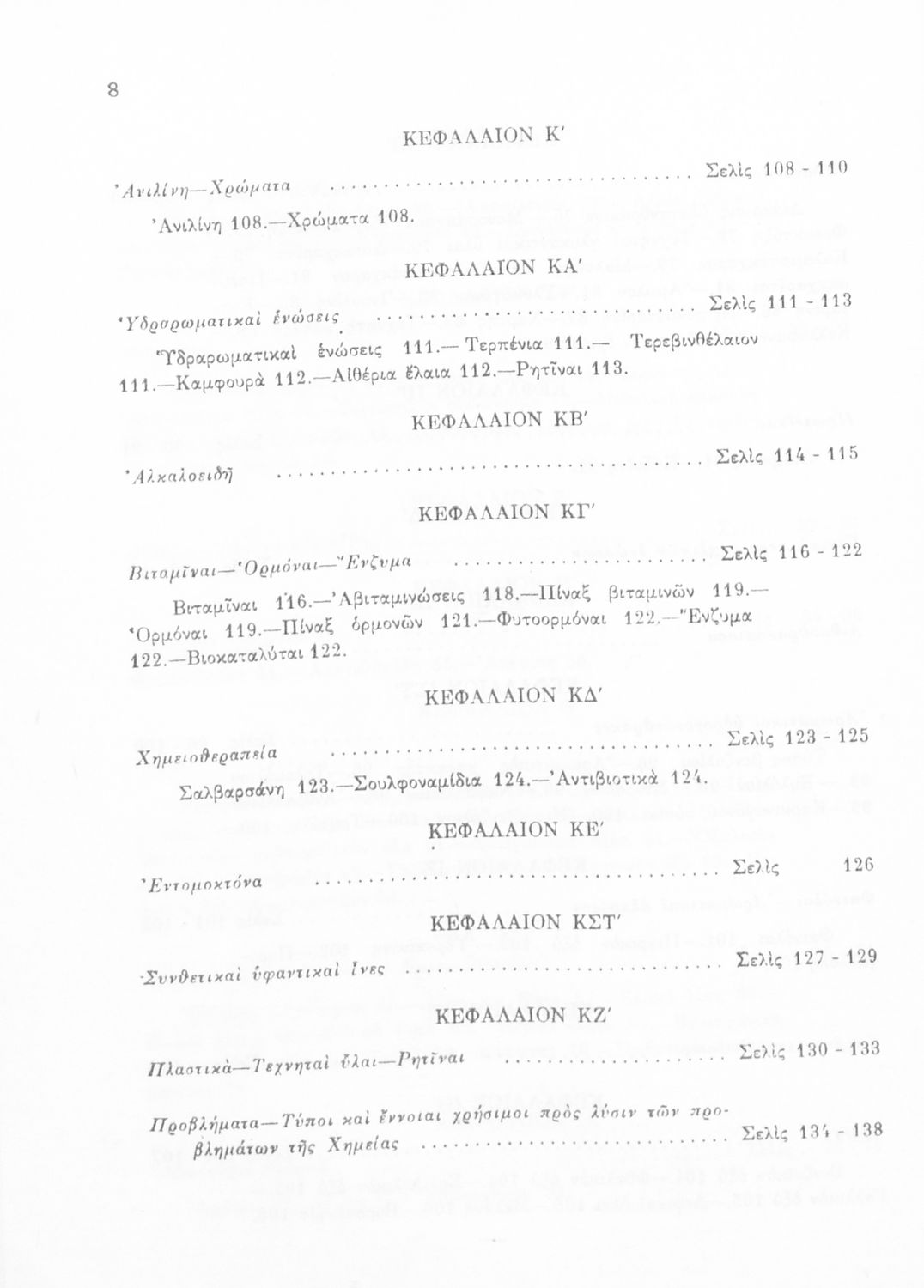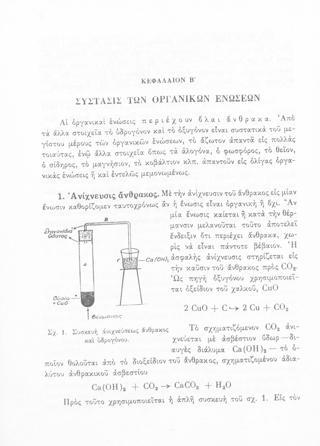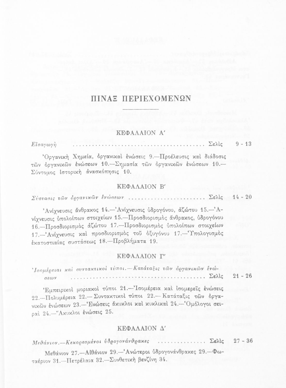 Βαθμίδα εκπαίδευσης: Δευτεροβάθμια Τάξη: ΣΤ' Γυμνασίου Μάθημα: Χημεία Γλώσσα: Καθαρεύουσα Παρουσίαση περιεχομένου: Σχολικό εγχειρίδιο για την ΣΤ΄ Γυμνασίου για το μάθημα της Χημείας. Το εγχειρίδιο περιλαμβάνει εισαγωγικά γενικές γνώσεις της οργανικής χημείας, της σύστασης των οργανικών ενώσεων, τους υδρογονάνθρακες, τις αλκοόλες, τους αιθέρες, τα οξέα, τις πρωτεΐνες, τα αλκαλοειδή, τα εντομοκτόνα, τα πλαστικά και τις ρητίνες. |