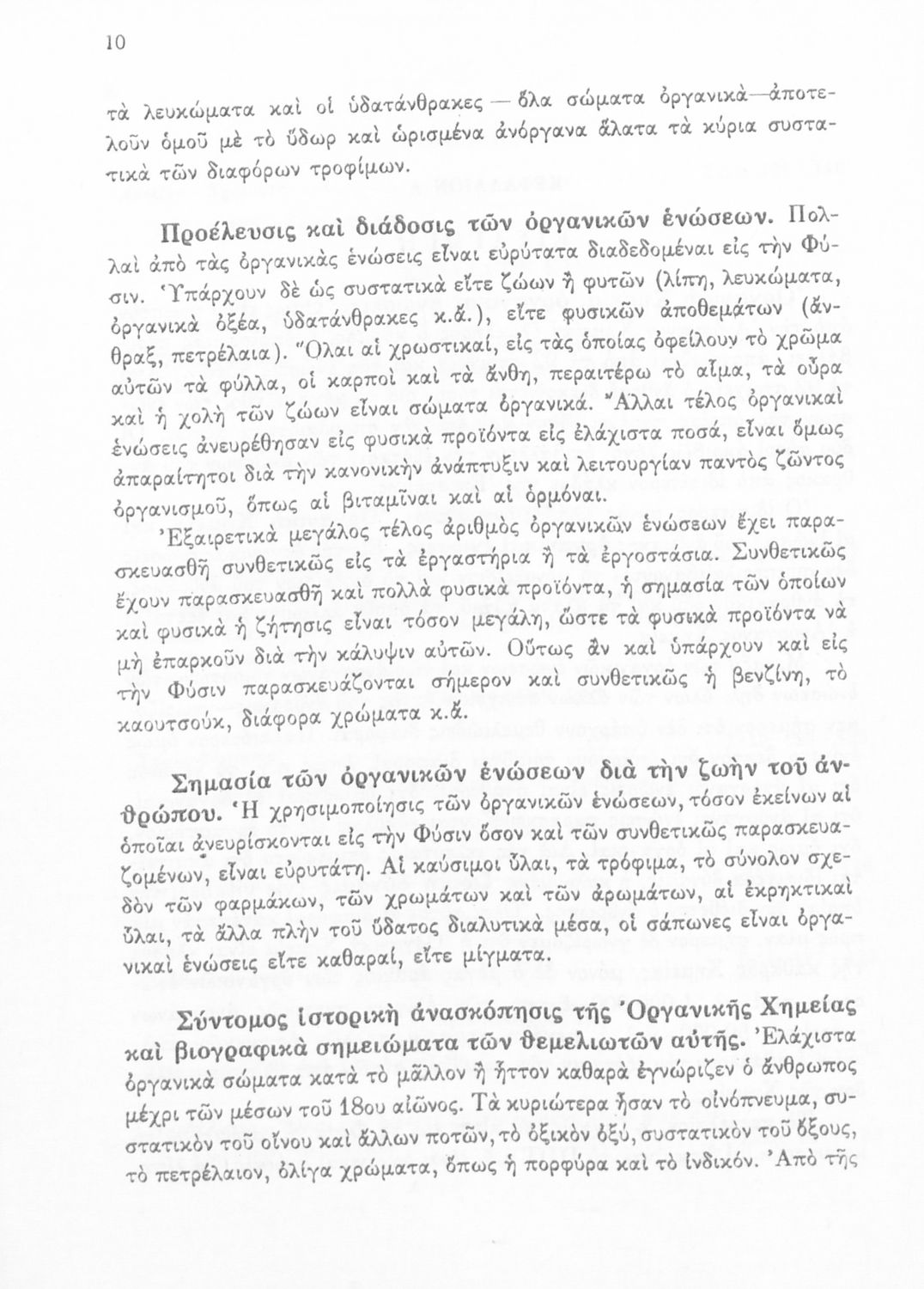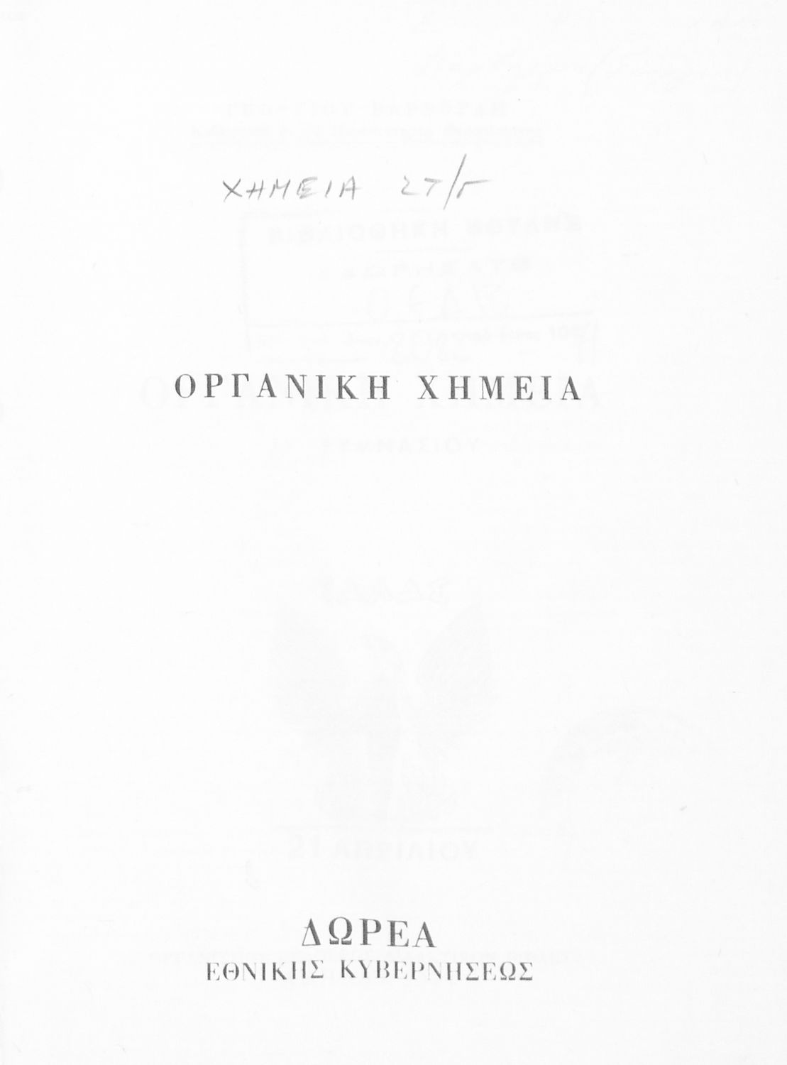 Σχολικό εγχειρίδιο για την ΣΤ΄ Γυμνασίου για το μάθημα της Χημείας. Το εγχειρίδιο περιλαμβάνει εισαγωγικά γενικές γνώσεις της οργανικής χημείας, της σύστασης των οργανικών ενώσεων, τους υδρογονάνθρακες, τις αλκοόλες, τους αιθέρες, τα οξέα, τις πρωτεΐνες, τα αλκαλοειδή, τα εντομοκτόνα, τα πλαστικά και τις ρητίνες.