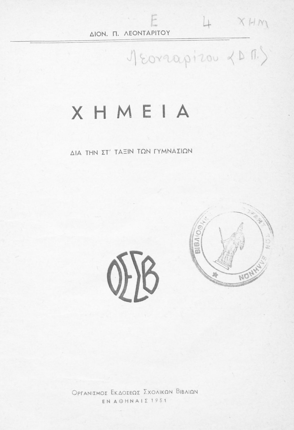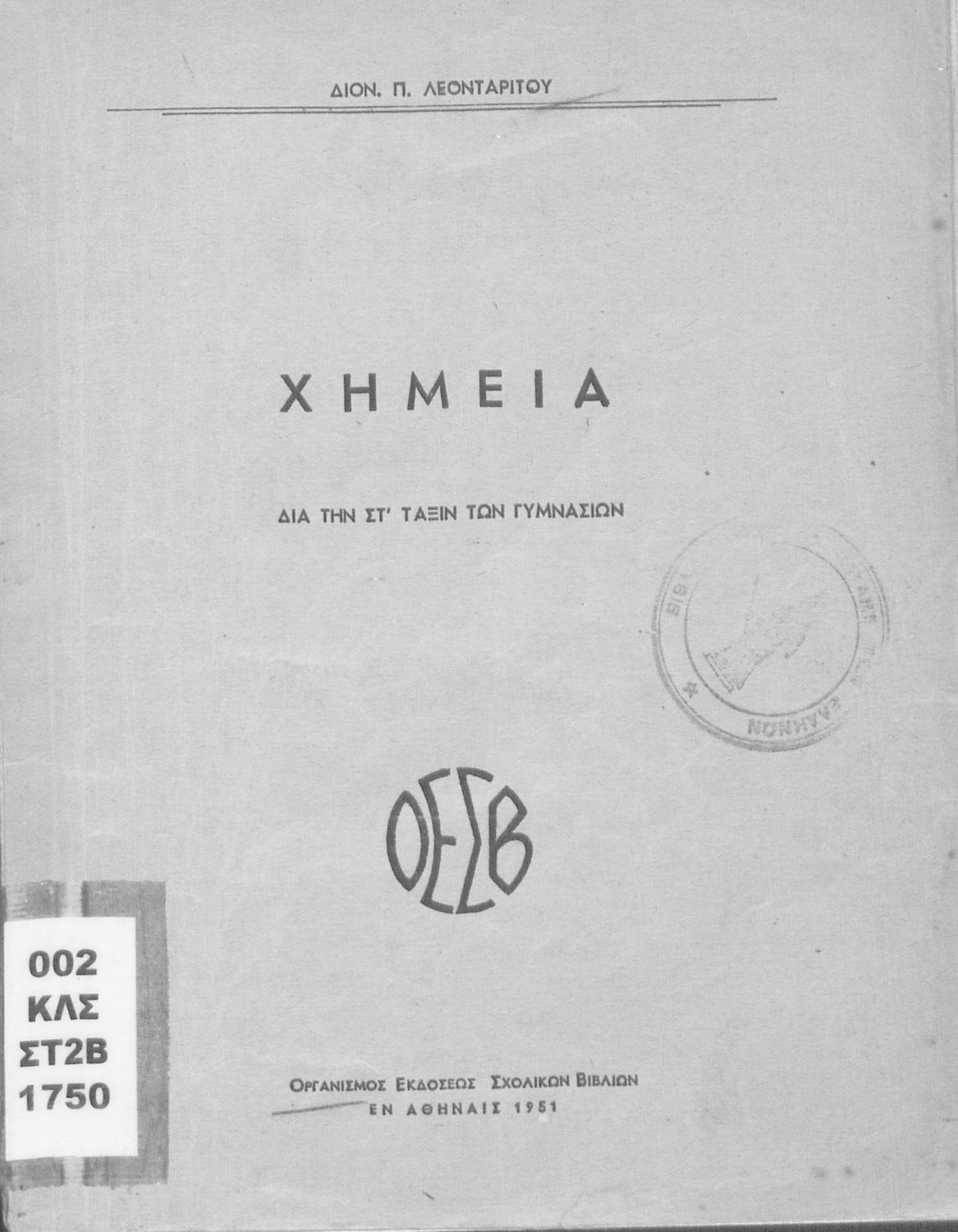Τίτλος: Χημεία δια την ΣΤ΄ τάξιν των Γυμνασίων