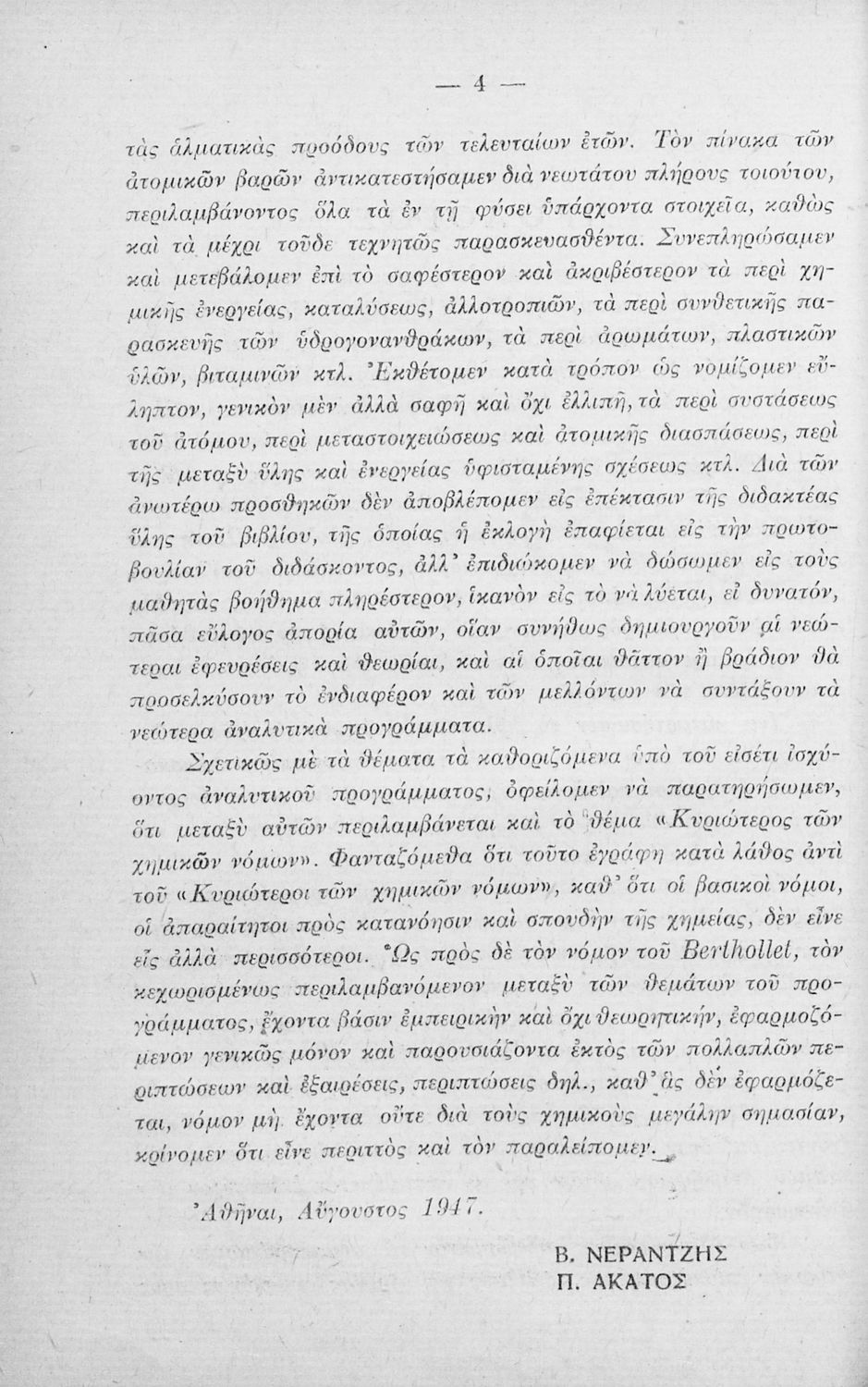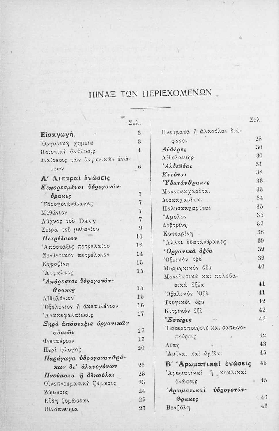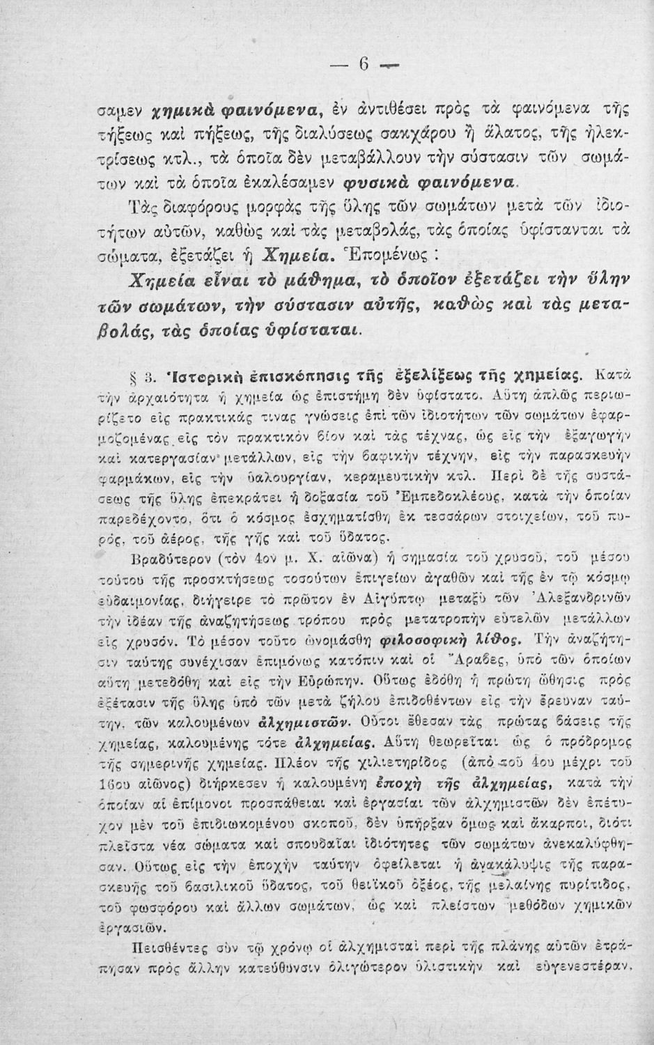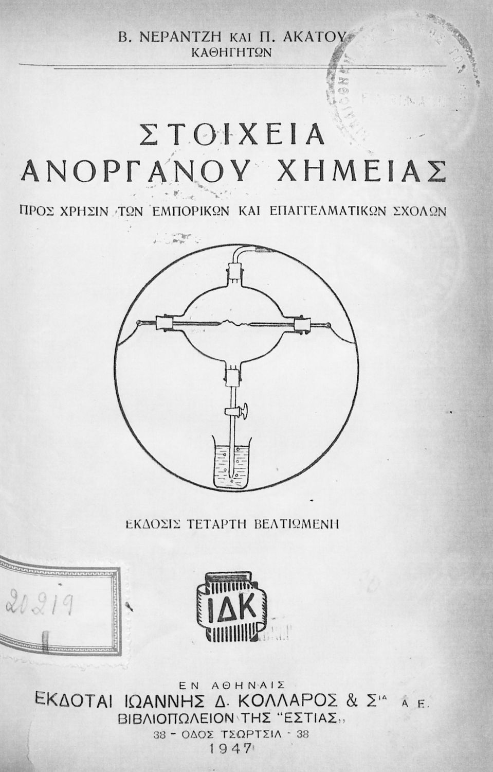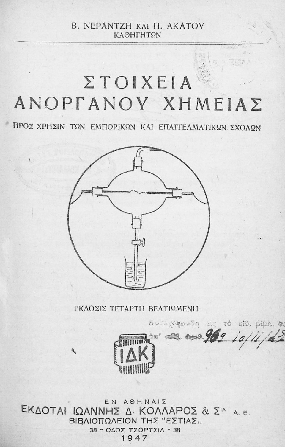 Βαθμίδα εκπαίδευσης: Δευτεροβάθμια Τάξη: Εμπορικές και Επαγγελματικές Σχολές Μάθημα: Χημεία Γλώσσα: Απλή καθαρεύουσα Παρουσίαση περιεχομένου: Σχολικό εγχειρίδιο Ανόργανης Χημείας για τους μαθητές των Εμπορικών και Επαγγελματικών Σχολών. Το βιβλίο είναι χωρισμένο σε τρία μέρη. Στο πρώτο μέρος εξετάζει τη δομή και τις ιδιότητες των μορίων και των ατόμων, για να συνεχίσει με τις ιδιότητες και τα χαρακτηριστικά των αμέταλλων. Το τρίτο μέρος, εξετάζει τις ενώσεις των μετάλλων. |