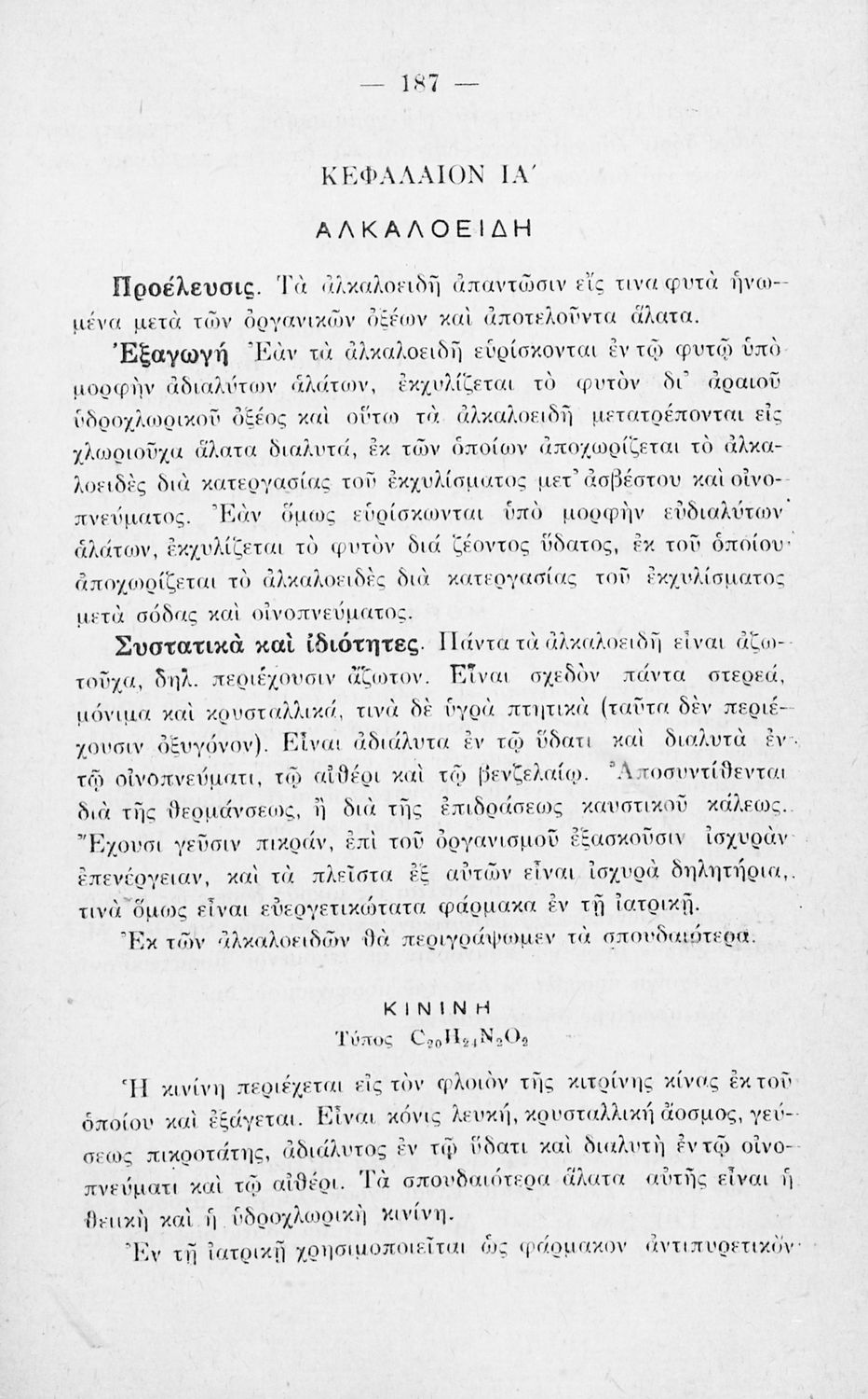Βαθμίδα εκπαίδευσης: Δευτεροβάθμια Τάξη: Γ' Γυμνασίου / Δ' Γυμνασίου Μάθημα: Χημεία Γλώσσα: Καθαρεύουσα Παρουσίαση περιεχομένου: Σχολικό εγχειρίδιο των Γ΄ και Δ΄ τάξεων του τετραταξίου Γυμνασίου για το μάθημα της Χημείας. Το εγχειρίδιο περιλαμβάνει τις βασικές γνώσεις και θεωρητικά στοιχεία της ανόργανης και οργανικής χημείας, οξέα, βάσεις, άλατα, ενώσεις θείου, υδρογόνου, οργανικές ουσίες, ανάλυση και ταξινόμηση οργανικών ουσιών, αλκαλοειδή κ.α. |
