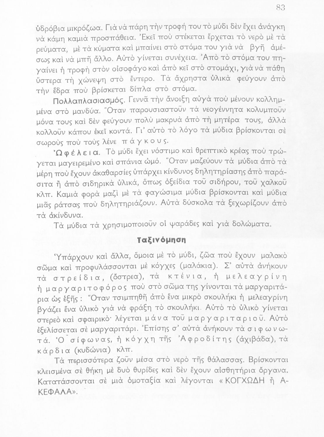 Σχολικό εγχειρίδιο Φυτολογίας - Ζωολογίας Α' Γυμνασίου που παρουσιάζει τα θηλαστικά, τα μαλάκια, τα πτηνά και τα ερπετά, αναλύει τα μέρη των φυτών, τα χαρακτηριστικά τους και τις ιδιότητές τους και τις σχέσεις αλληλεξάρτησης μεταξύ ζώων και φυτών.