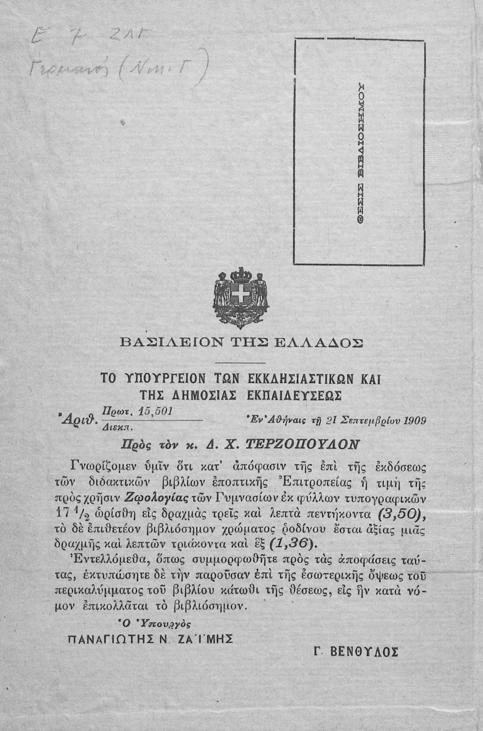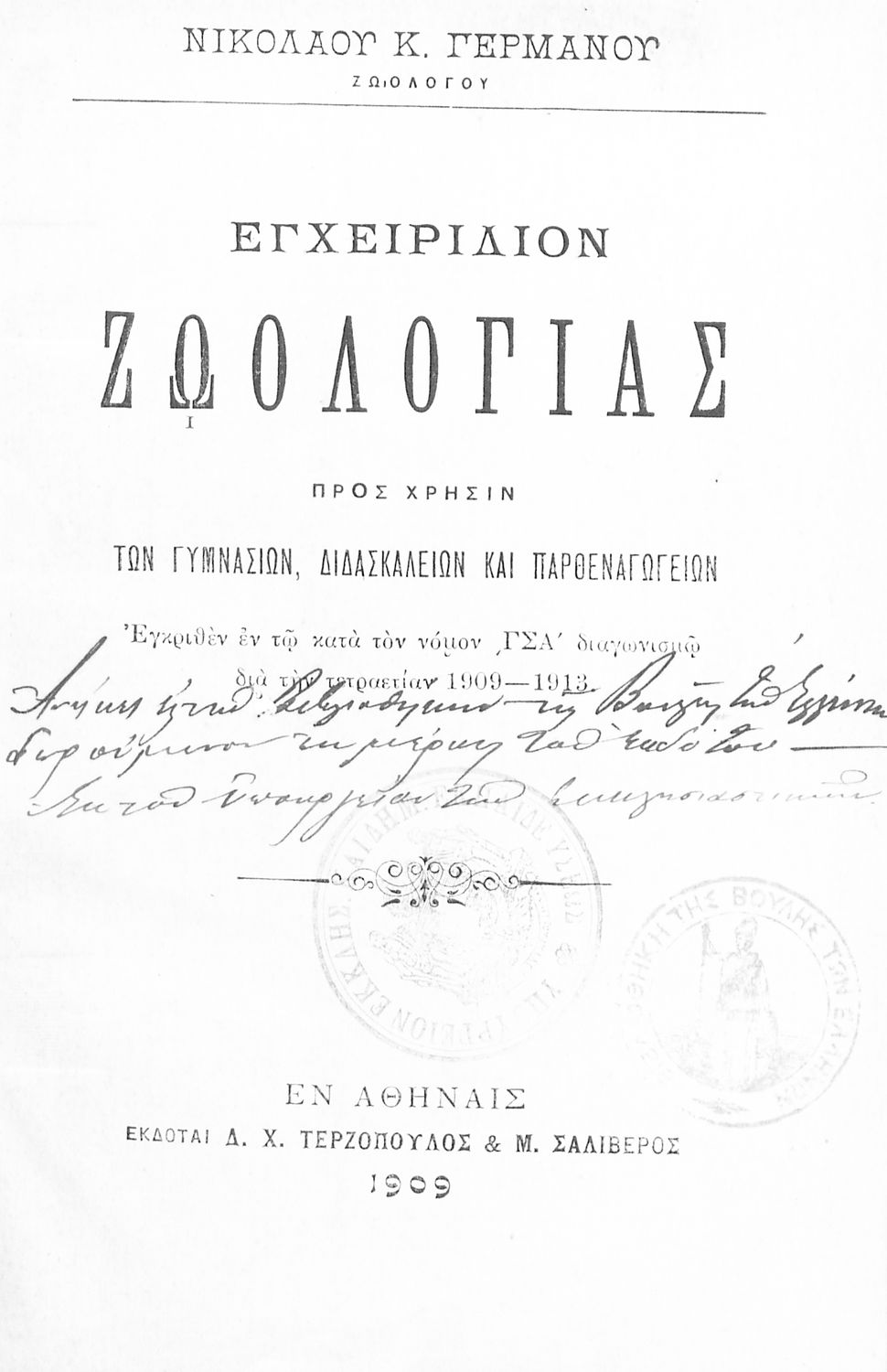 Εκδότης: Δ.Χ. Τερζόπουλος, Μ. Σαλίβερος Έτος έκδοσης: 1909 Τόπος έκδοσης: Αθήνα Υπουργική απόφαση / Σύμβαση: 15,501/21-9-1909 Έτος έγκρισης: 1909 |