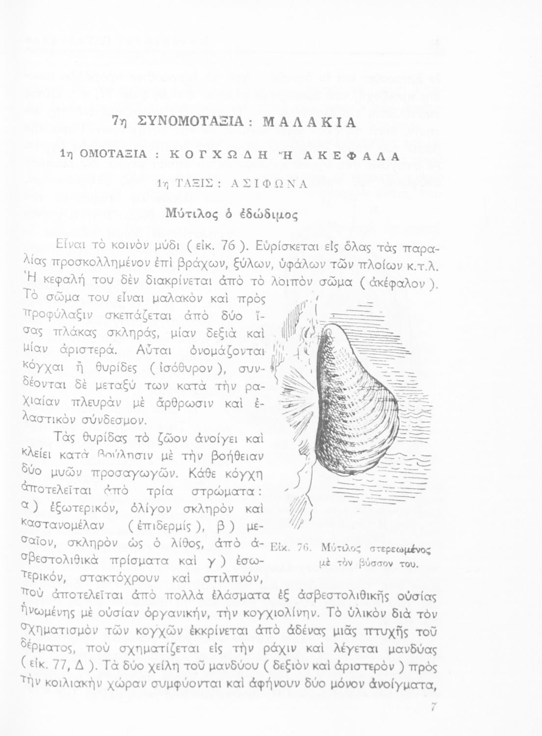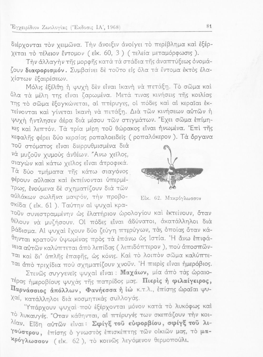 Σχολικό εγχειρίδιο Ζωολογίας Α΄ Γυμνασίου που εστιάζει στη φυσιολογία και ανατομία και παρουσιάζει τα διάφορα ζώα ανάλογα με την συνομοταξία στην οποία ανήκουν. Φέρει το σύμβολο της δικτατορίας.