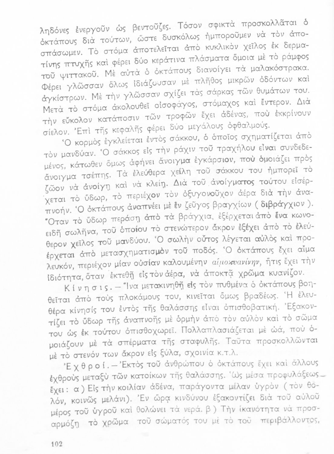 Σχολικό εγχειρίδιο Ζωολογίας Α΄ Γυμνασίου που εστιάζει στη φυσιολογία και ανατομία και παρουσιάζει τα διάφορα ζώα ανάλογα με την συνομοταξία στην οποία ανήκουν. Φέρει το σύμβολο της δικτατορίας.