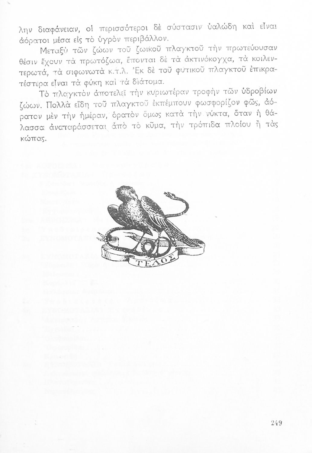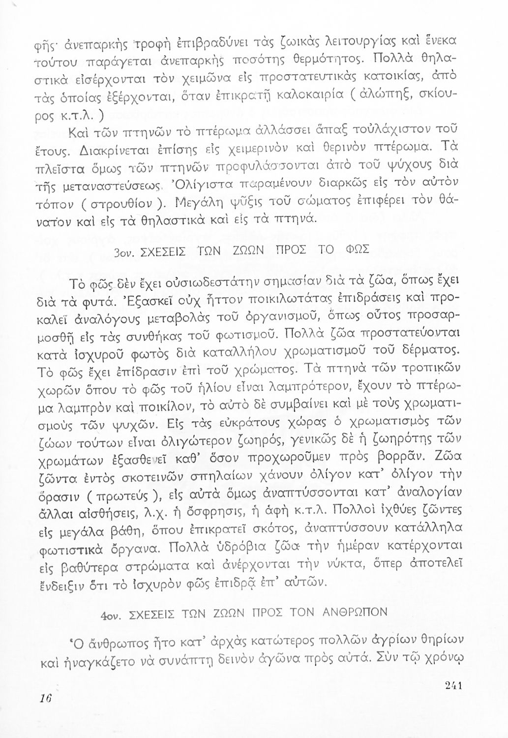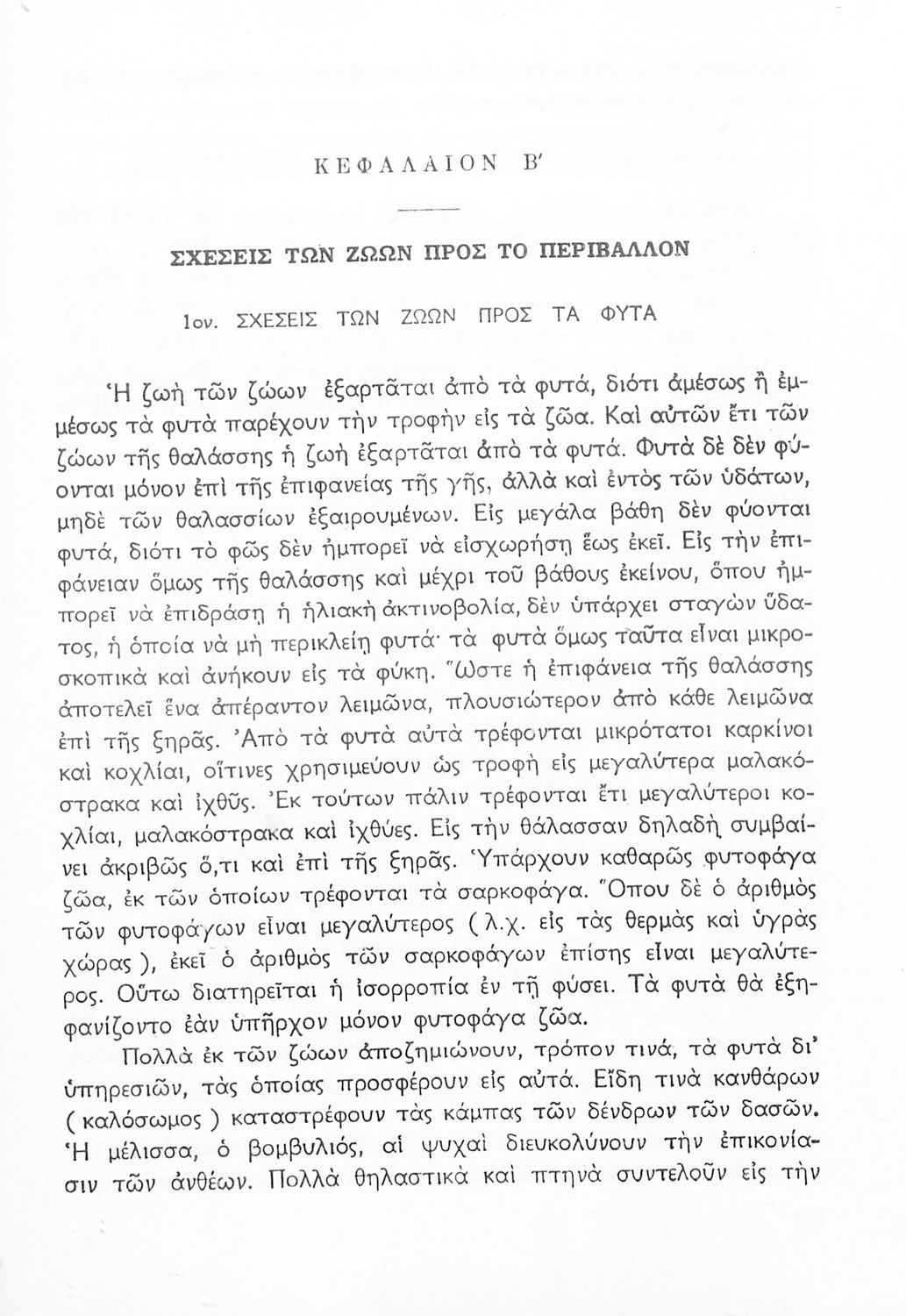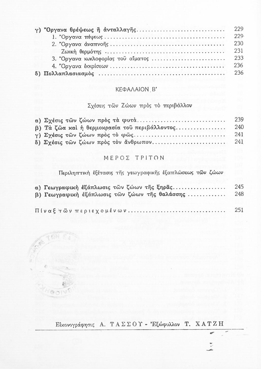 Σχολικό εγχειρίδιο Ζωολογίας Α΄ Γυμνασίου που εστιάζει στη φυσιολογία και ανατομία και παρουσιάζει τα διάφορα ζώα ανάλογα με την συνομοταξία στην οποία ανήκουν. Φέρει το σύμβολο της δικτατορίας.