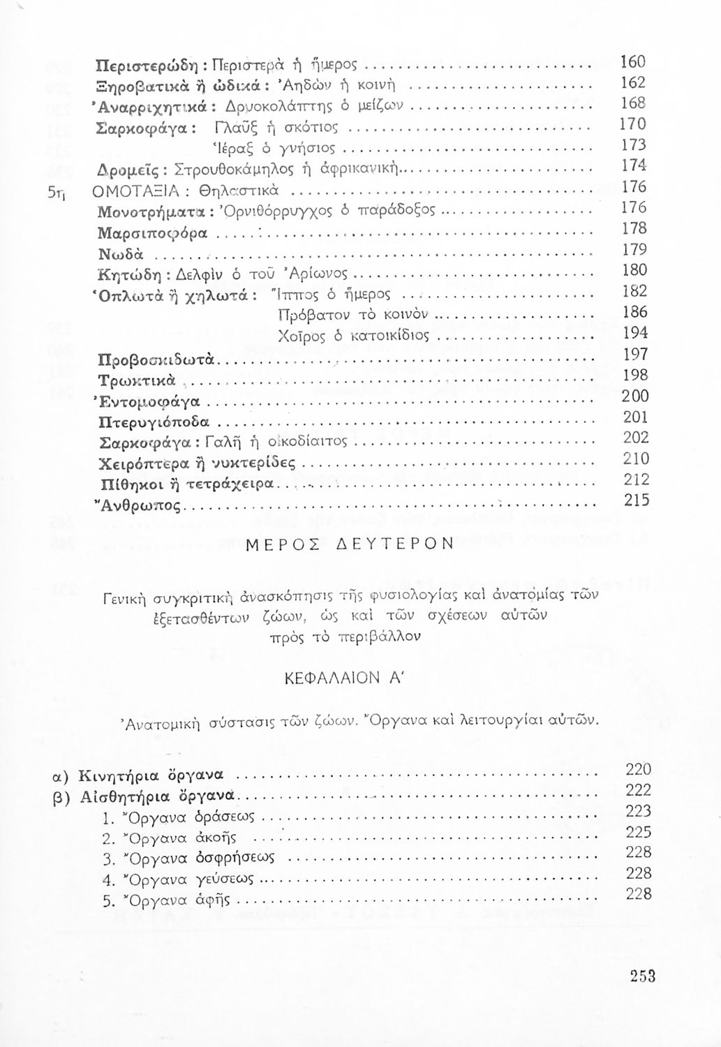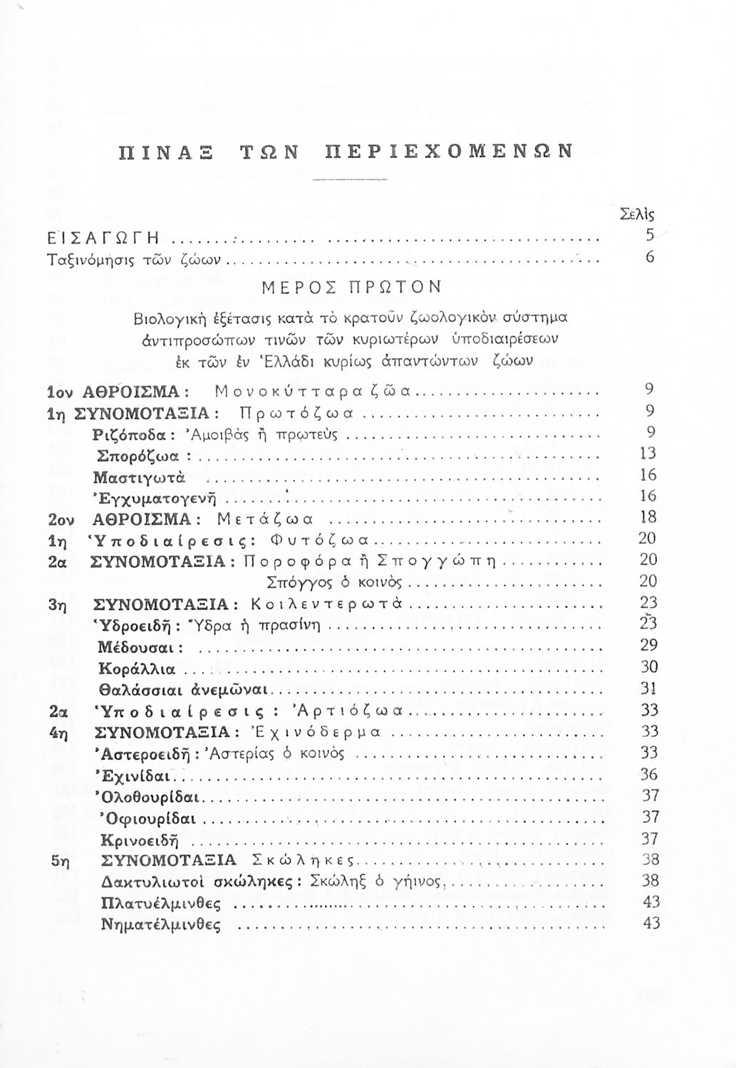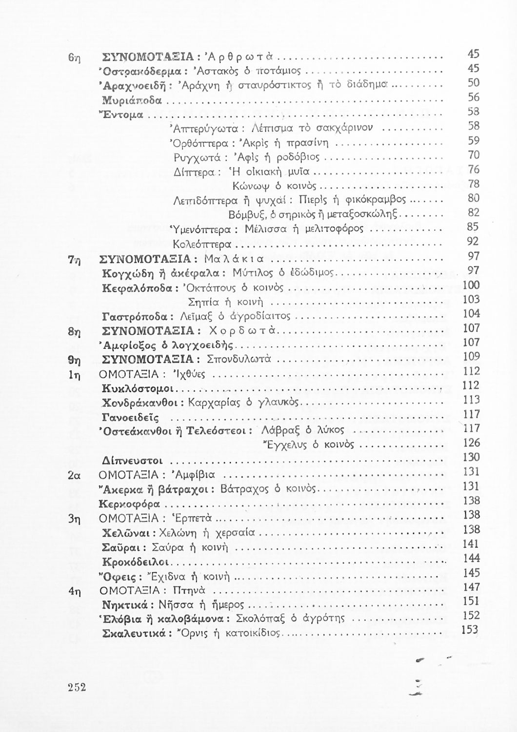 Σχολικό εγχειρίδιο Ζωολογίας για την Γ΄ τάξη των Εξαταξίων Γυμνασίων που παρουσιάζει τα διάφορα ζώα ανάλογα με την συνομοταξία στην οποία ανήκουν.