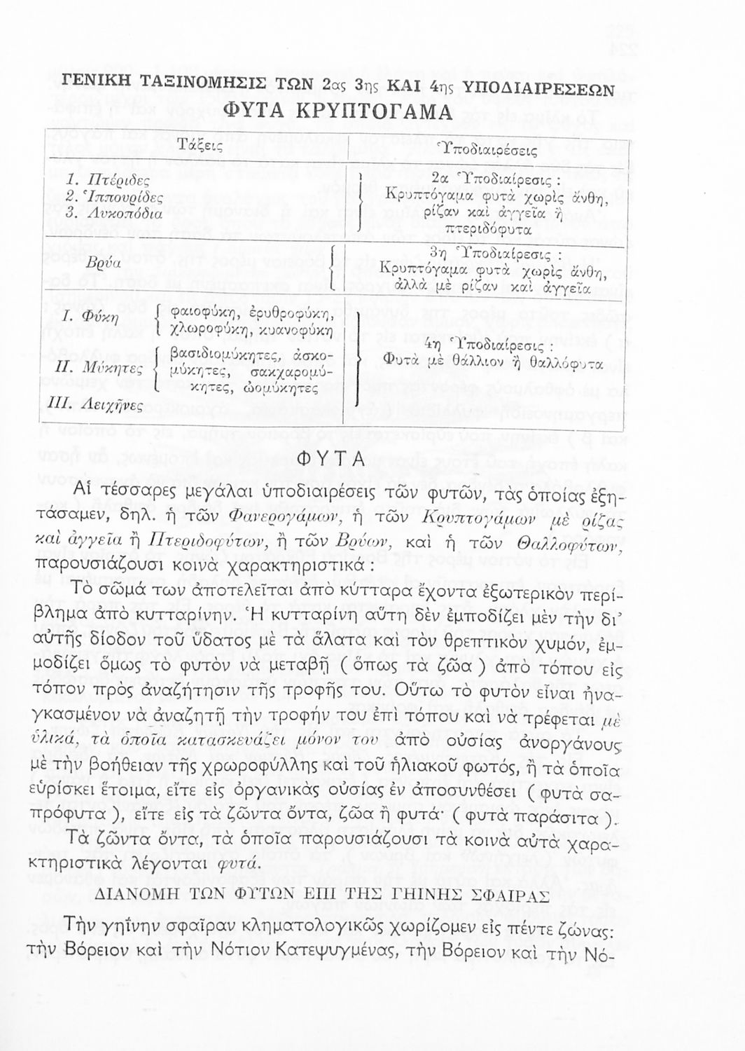 Σχολικό εγχειρίδιο Φυτολογίας Β΄ Γυμνασίου που παρουσιάζει τα φυτά ανάλογα με την συνομοταξία στην οποία ανήκουν.