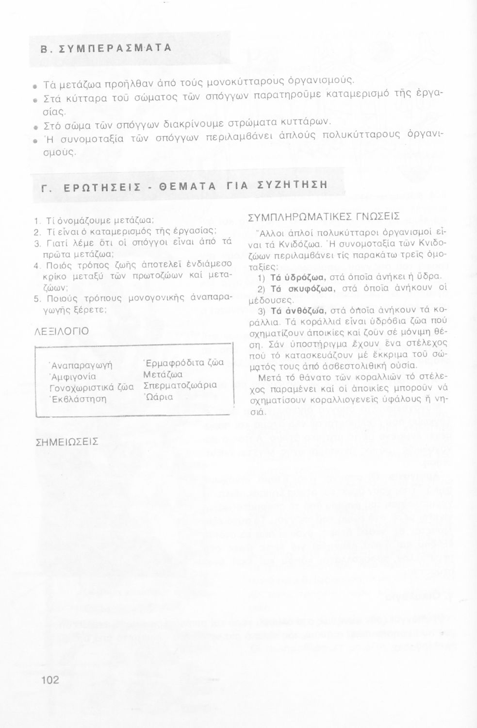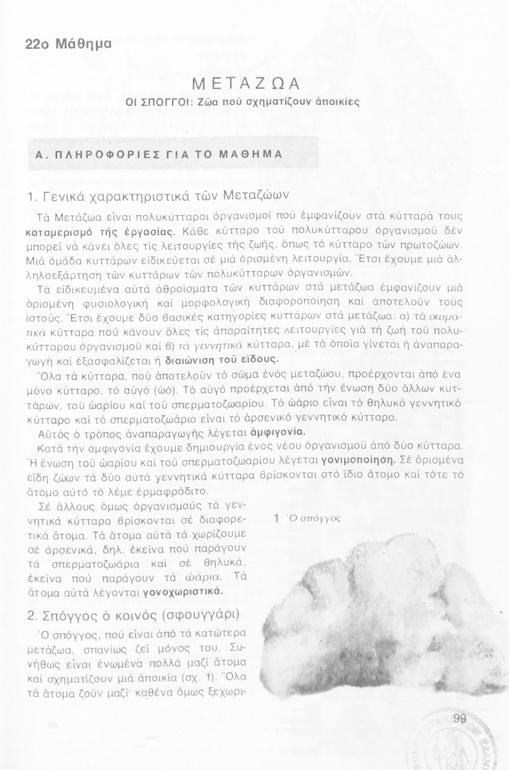 Σχολικό εγχειρίδιο Ζωολογίας Α΄ Γυμνασίου που εστιάζει στη φυσιολογία και ανατομία και παρουσιάζει τα διάφορα ζώα ανάλογα με την συνομοταξία στην οποία ανήκουν. Φέρει το σύμβολο της δικτατορίας.