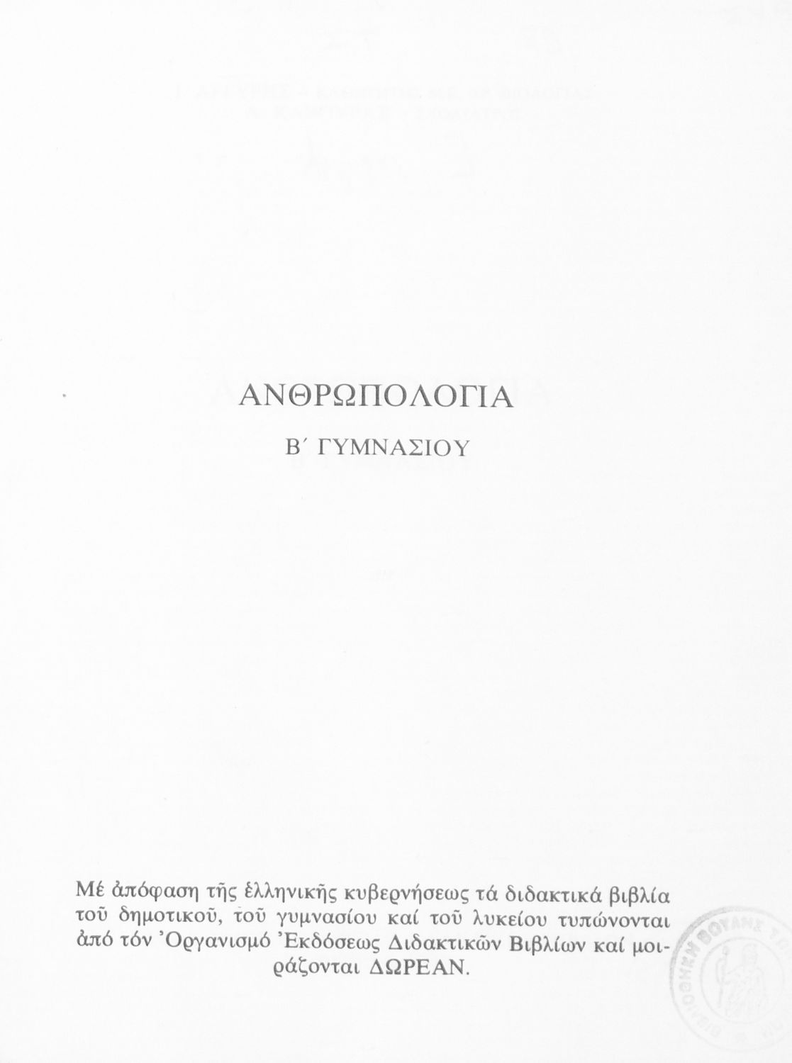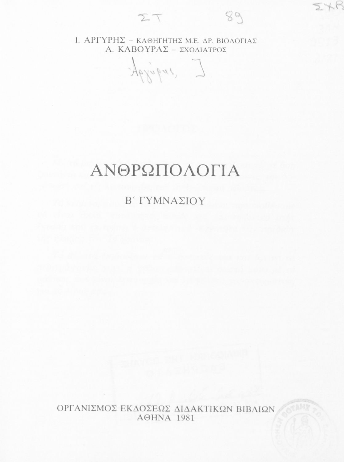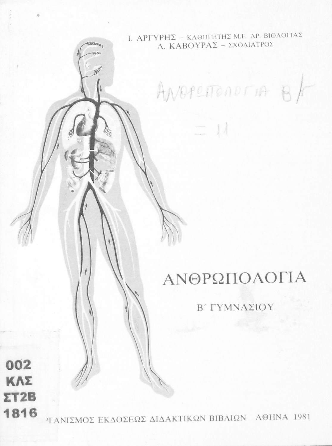 Σχολικό εγχειρίδιο Ανθρωπολογίας Β΄ Γυμνασίου που εστιάζει στην κατασκευή, ανάπτυξη και λειτουργία του ανθρώπινου οργανισμού, και τη σχέση του ανθρώπου με το φυσικό και το κοινωνικό περιβάλλον.