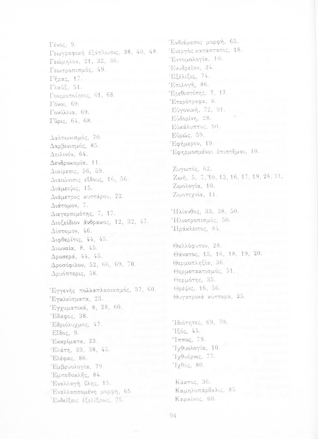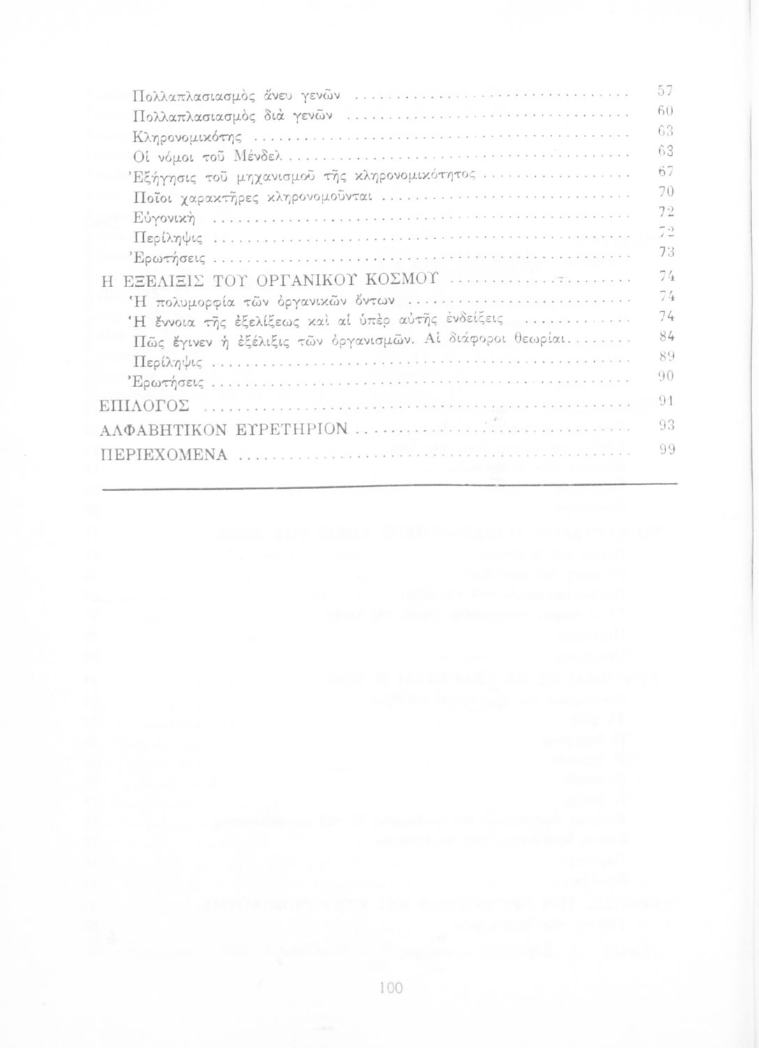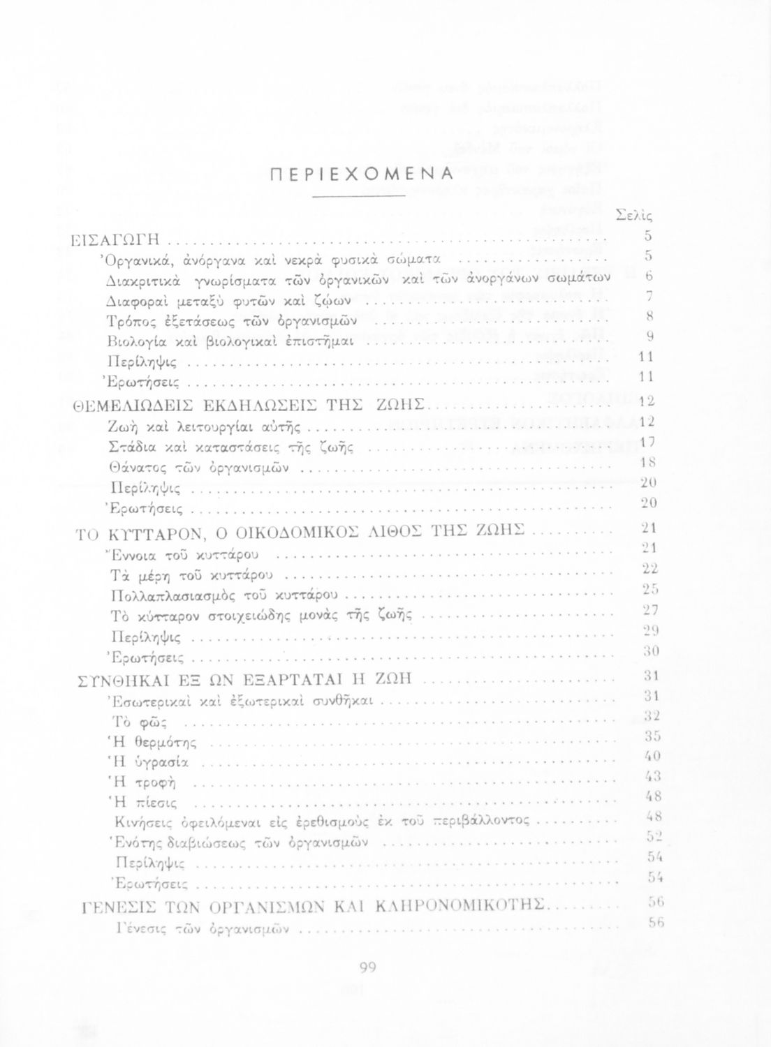 Σχολικό εγχειρίδιο Βιολογίας για τους μαθητές της Γ' Γυμνασίου. Περιέχει μια γενική επισκόπηση της Βιολογίας αρχίζοντας με τα βασικά δομικά στοιχεία κάθε οργανισμού, τα ανόργανα και οργανικά σώματα και τα γνωρίσματά τους, τις συνθήκες στις οποίες αναπτύσσονται και εξελίσσονται οι μορφές ζωής, όπως θερμότητα, πίεση, υγρασία. Τέλος το βιβλίο ασχολείται με ζητήματα κληρονομικότητας και την έννοια της εξέλιξης.