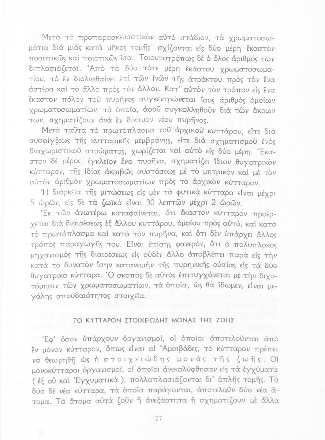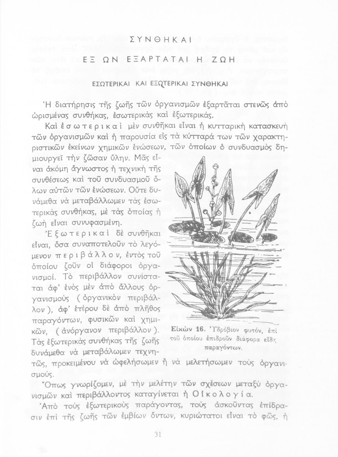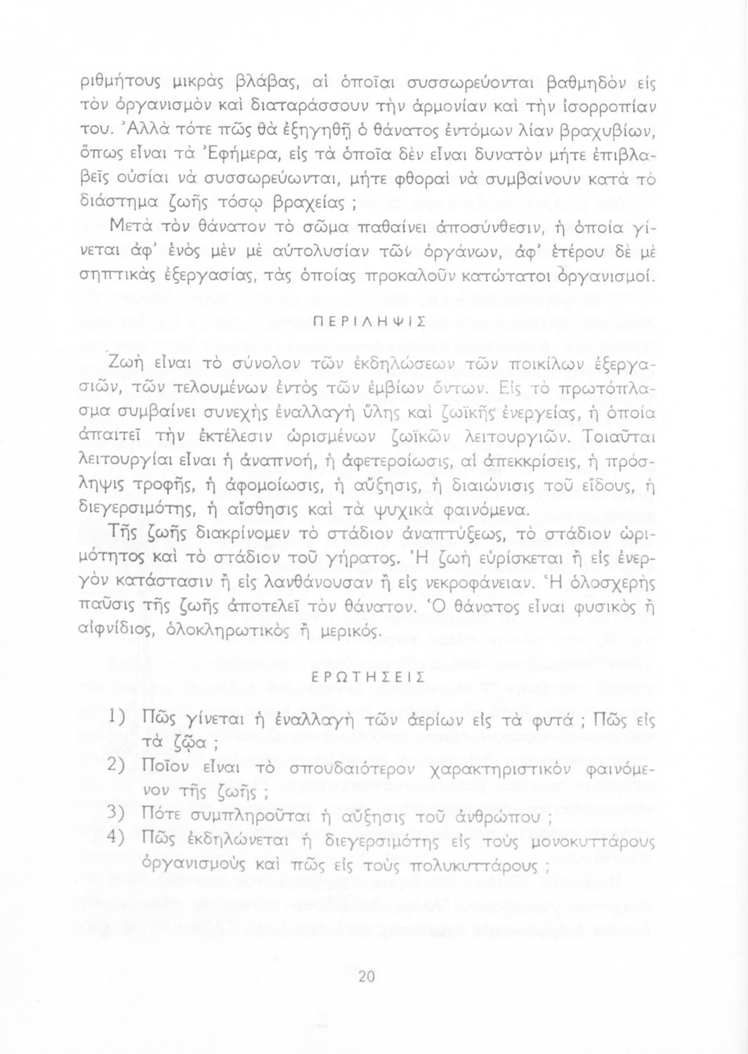 Σχολικό εγχειρίδιο Βιολογίας για τους μαθητές της Γ' Γυμνασίου. Περιέχει μια γενική επισκόπηση της Βιολογίας αρχίζοντας με τα βασικά δομικά στοιχεία κάθε οργανισμού, τα ανόργανα και οργανικά σώματα και τα γνωρίσματά τους, τις συνθήκες στις οποίες αναπτύσσονται και εξελίσσονται οι μορφές ζωής, όπως θερμότητα, πίεση, υγρασία. Τέλος το βιβλίο ασχολείται με ζητήματα κληρονομικότητας και την έννοια της εξέλιξης.