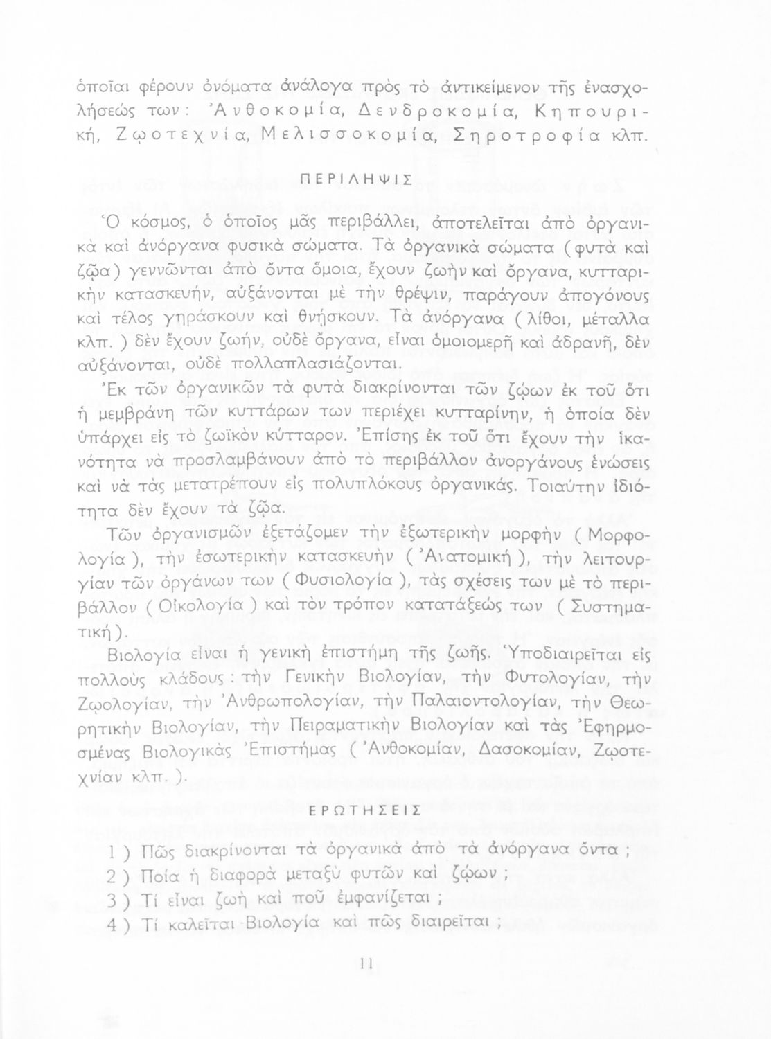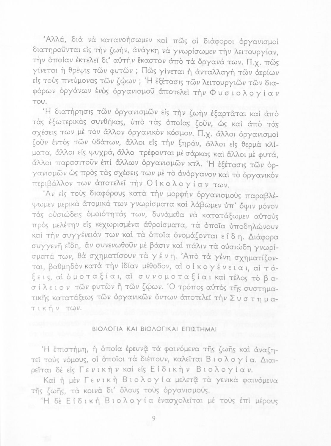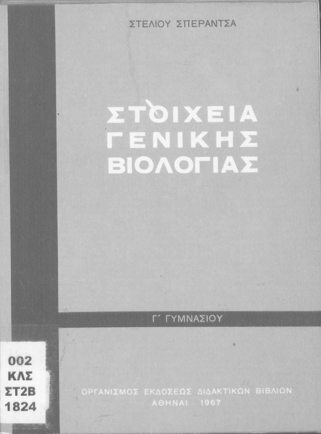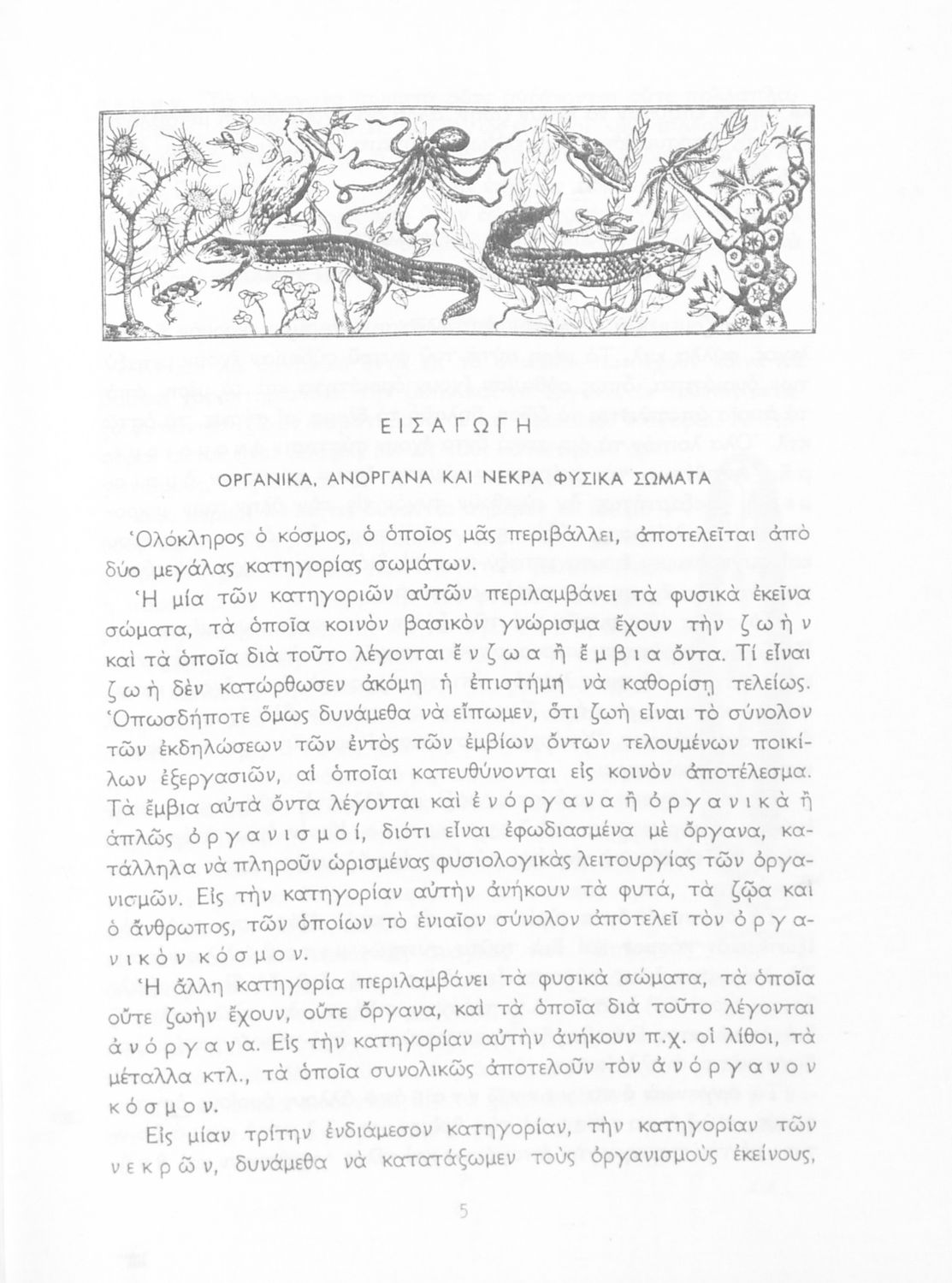 Σχολικό εγχειρίδιο Βιολογίας για τους μαθητές της Γ' Γυμνασίου. Περιέχει μια γενική επισκόπηση της Βιολογίας αρχίζοντας με τα βασικά δομικά στοιχεία κάθε οργανισμού, τα ανόργανα και οργανικά σώματα και τα γνωρίσματά τους, τις συνθήκες στις οποίες αναπτύσσονται και εξελίσσονται οι μορφές ζωής, όπως θερμότητα, πίεση, υγρασία. Τέλος το βιβλίο ασχολείται με ζητήματα κληρονομικότητας και την έννοια της εξέλιξης.