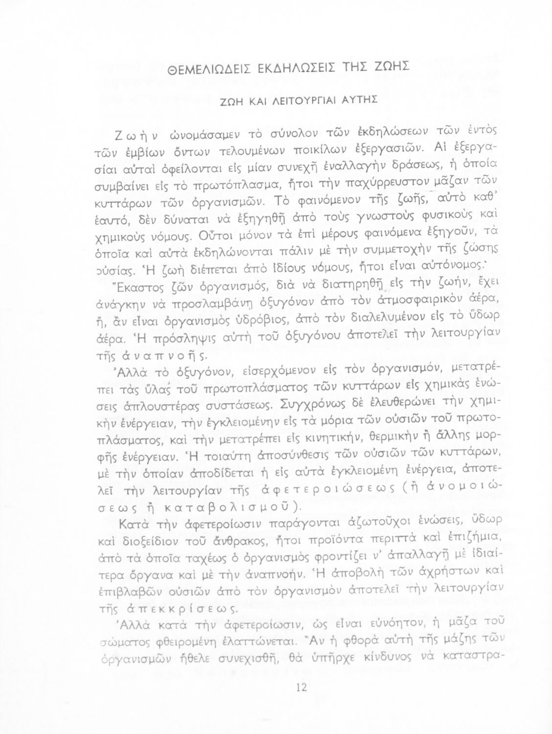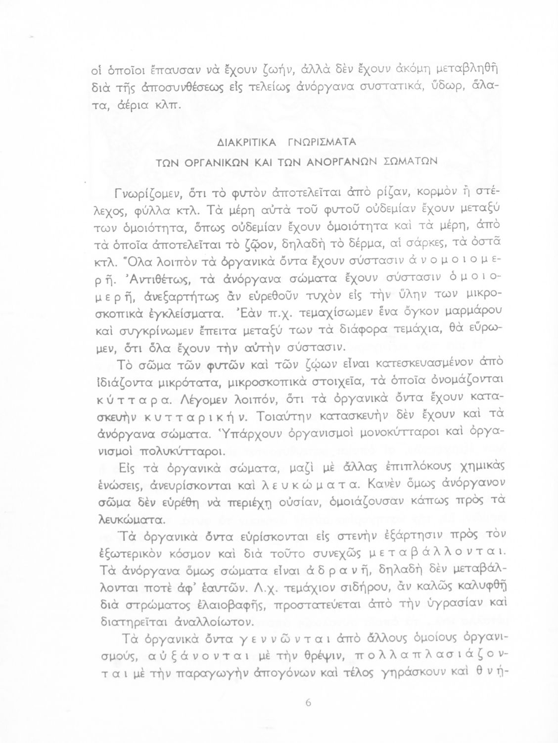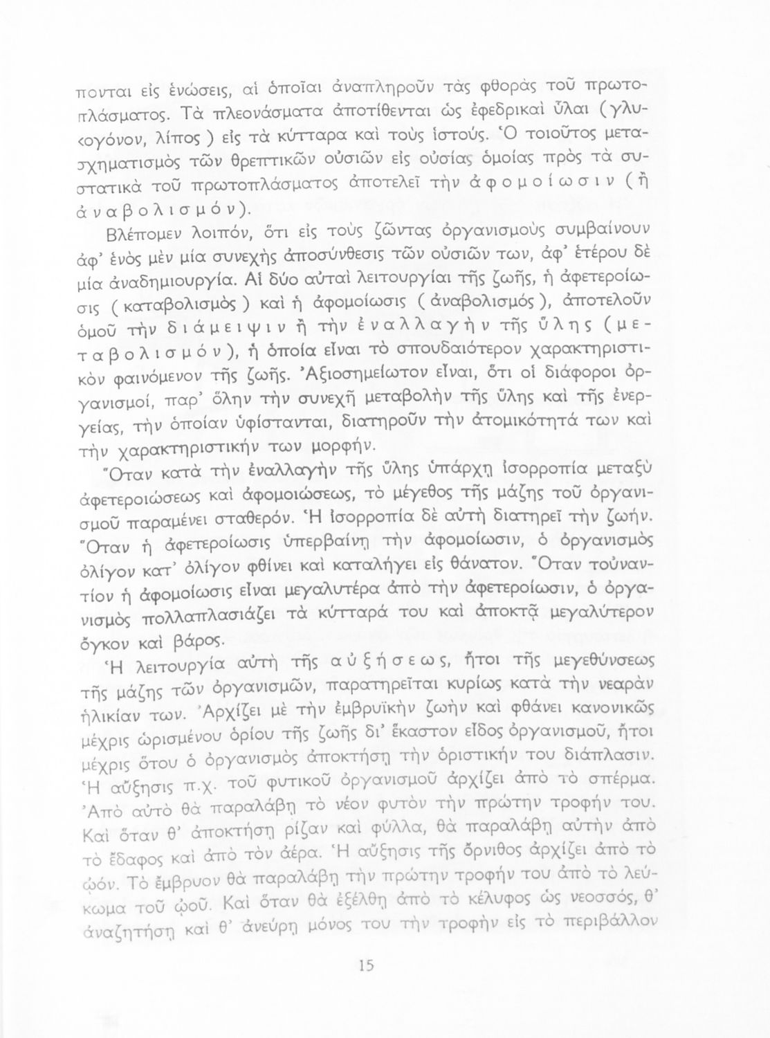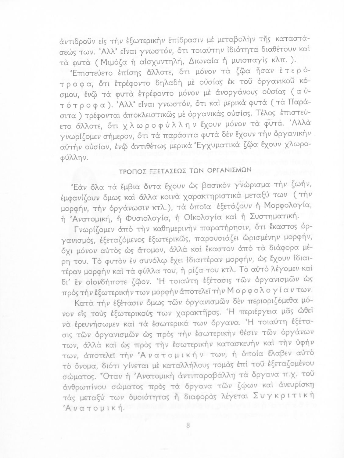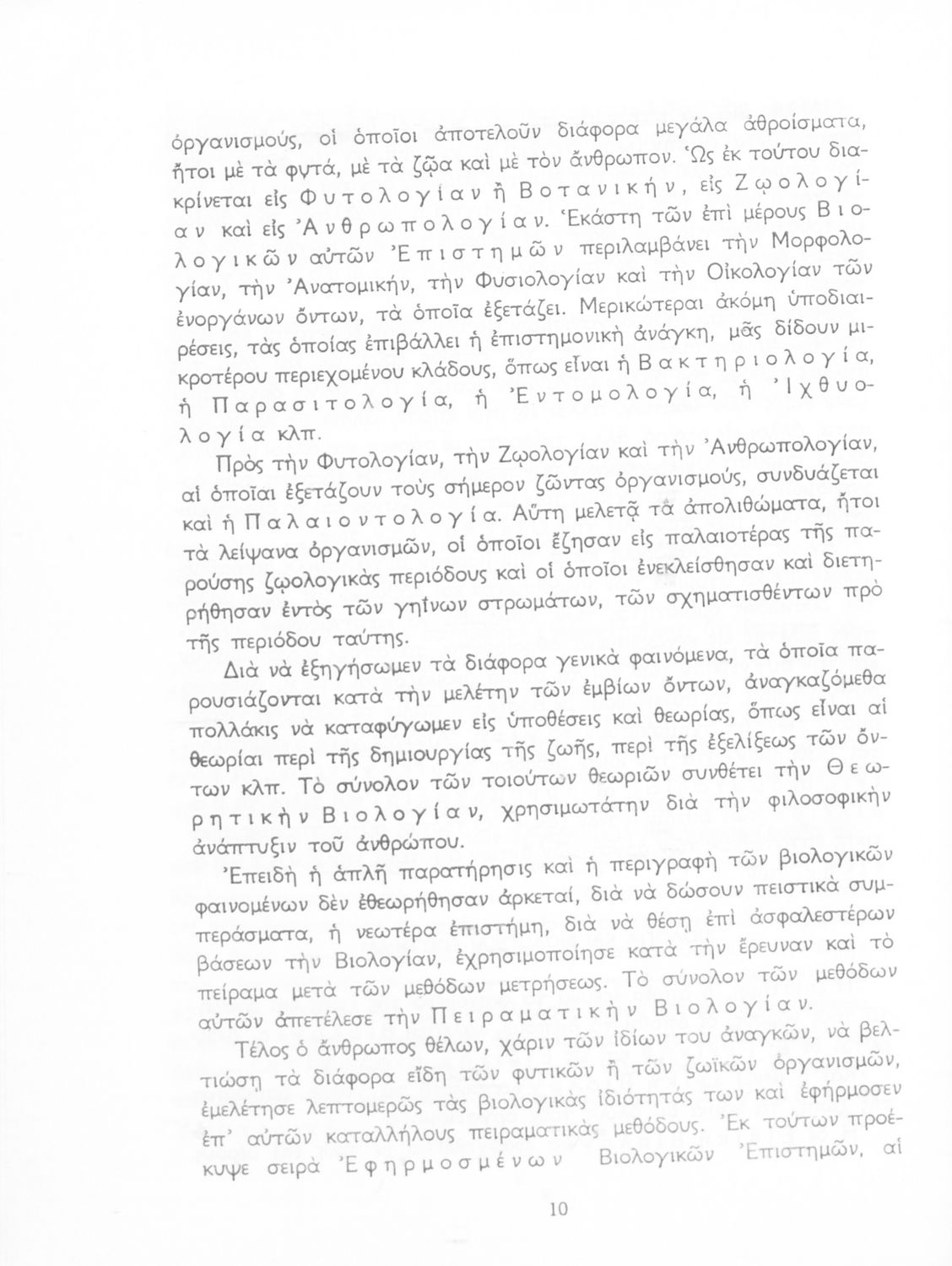 Σχολικό εγχειρίδιο Βιολογίας για τους μαθητές της Γ' Γυμνασίου. Περιέχει μια γενική επισκόπηση της Βιολογίας αρχίζοντας με τα βασικά δομικά στοιχεία κάθε οργανισμού, τα ανόργανα και οργανικά σώματα και τα γνωρίσματά τους, τις συνθήκες στις οποίες αναπτύσσονται και εξελίσσονται οι μορφές ζωής, όπως θερμότητα, πίεση, υγρασία. Τέλος το βιβλίο ασχολείται με ζητήματα κληρονομικότητας και την έννοια της εξέλιξης.