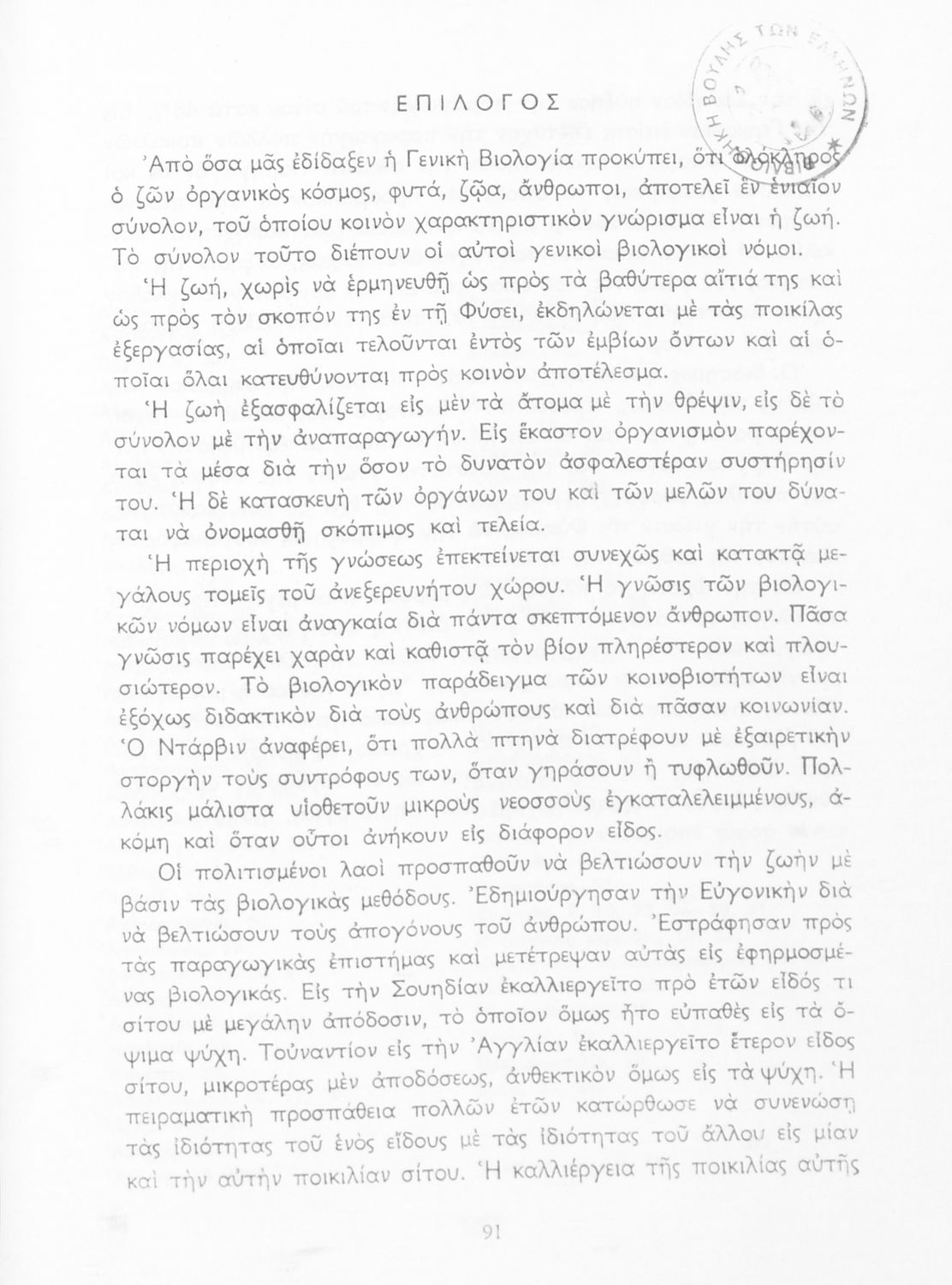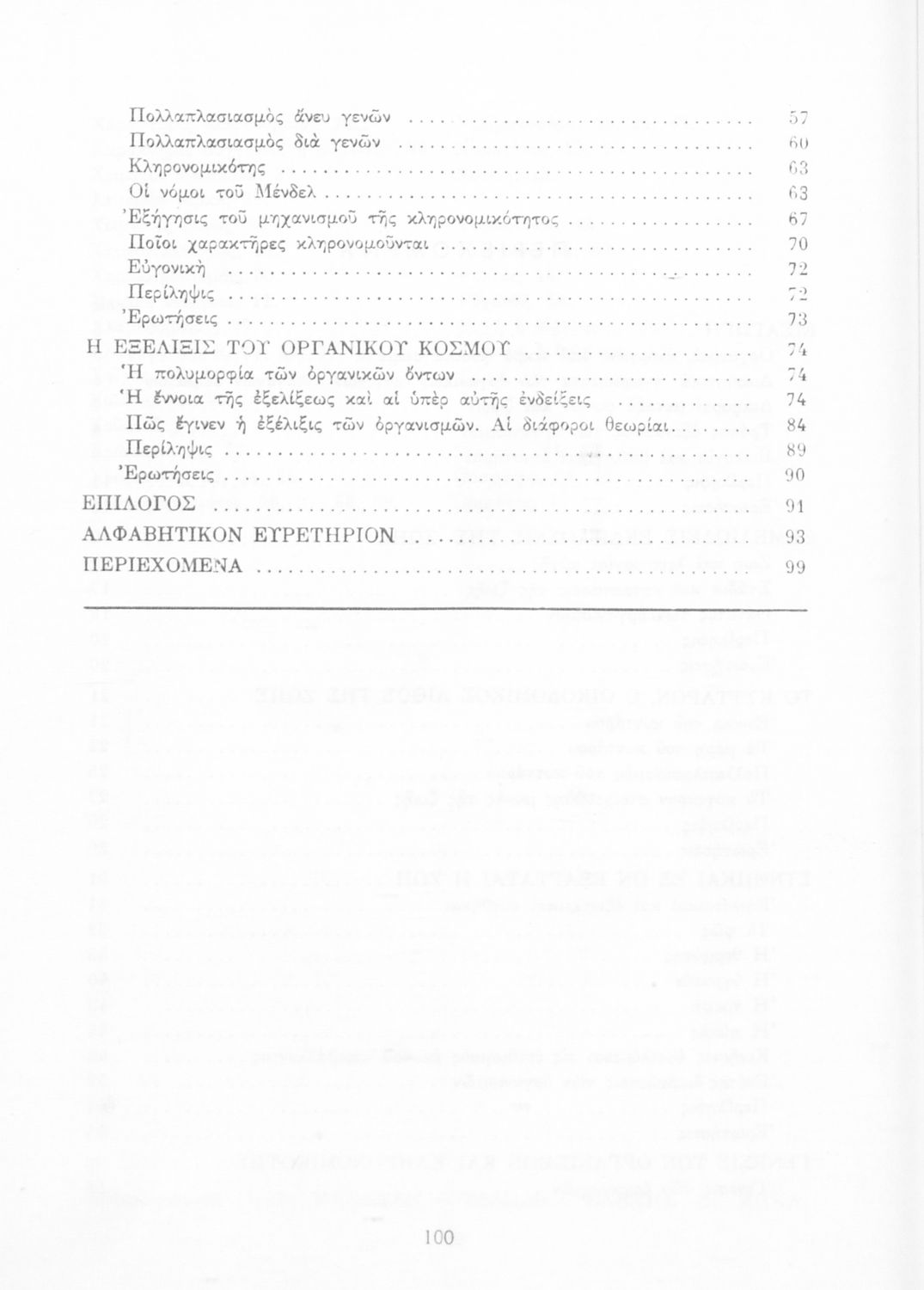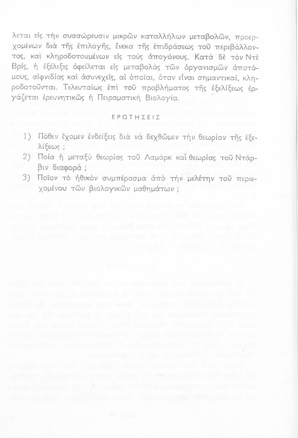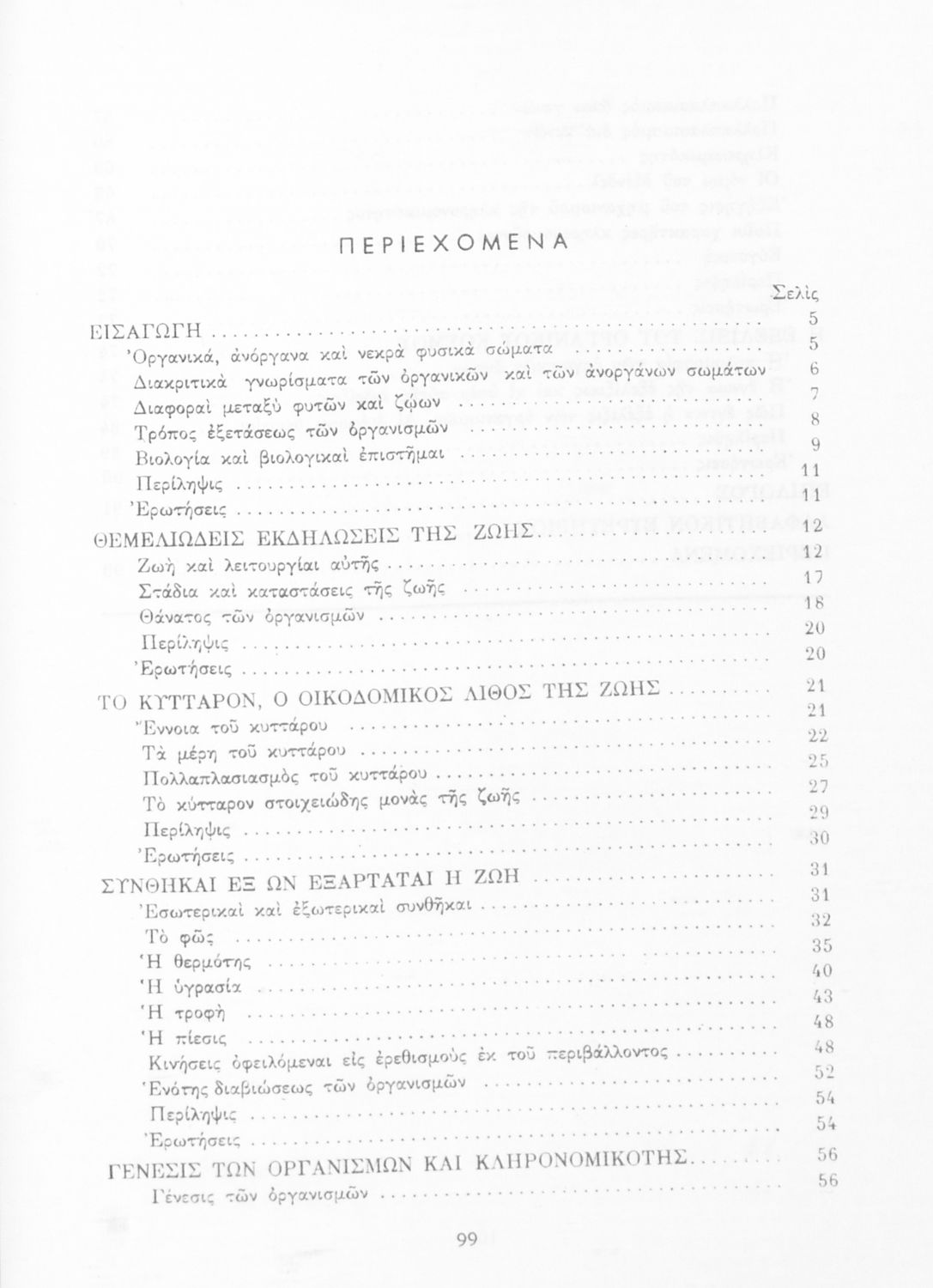 Σχολικό εγχειρίδιο Βιολογίας για τους μαθητές της Γ΄ Γυμνασίου. Περιέχει μια γενική επισκόπηση της Βιολογίας αρχίζοντας με τα βασικά δομικά στοιχεία κάθε οργανισμού, τα ανόργανα και οργανικά σώματα και τα γνωρίσματά τους, τις συνθήκες στις οποίες αναπτύσσονται και εξελίσσονται οι μορφές ζωής, όπως θερμότητα, πίεση, υγρασία. Τέλος το βιβλίο ασχολείται με ζητήματα κληρονομικότητας και την έννοια της εξέλιξης.