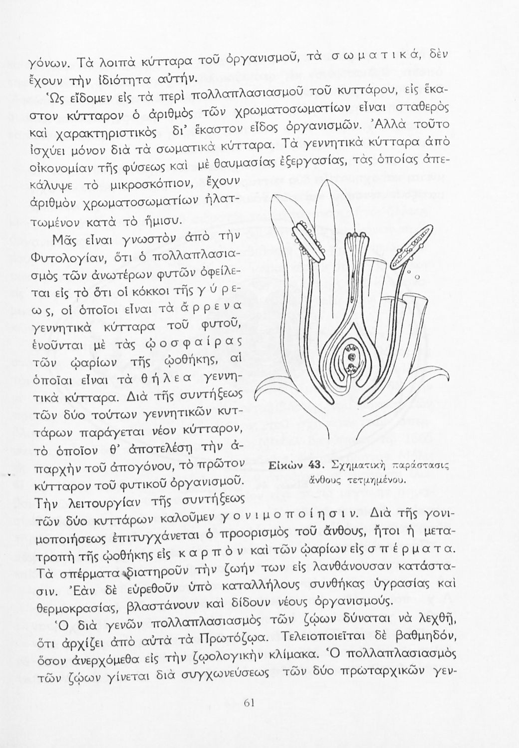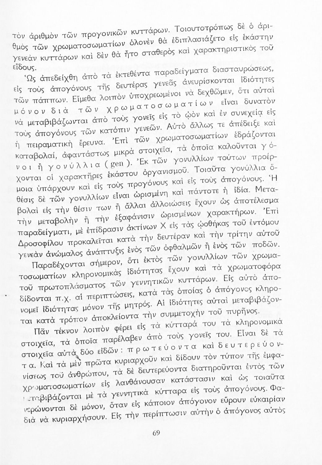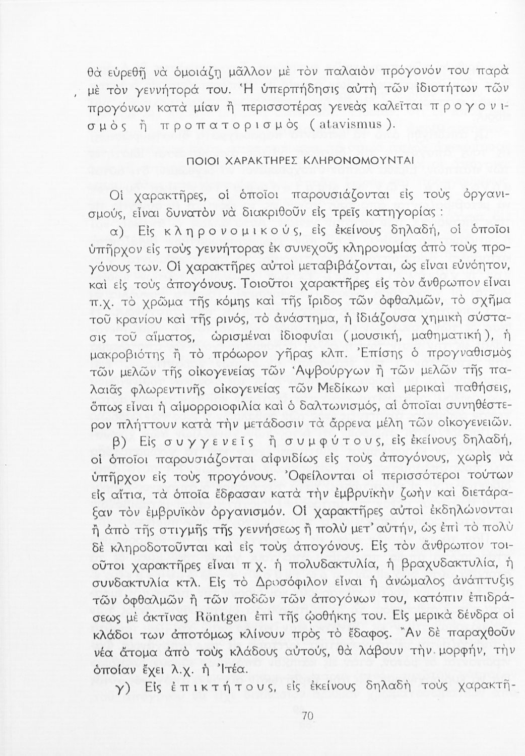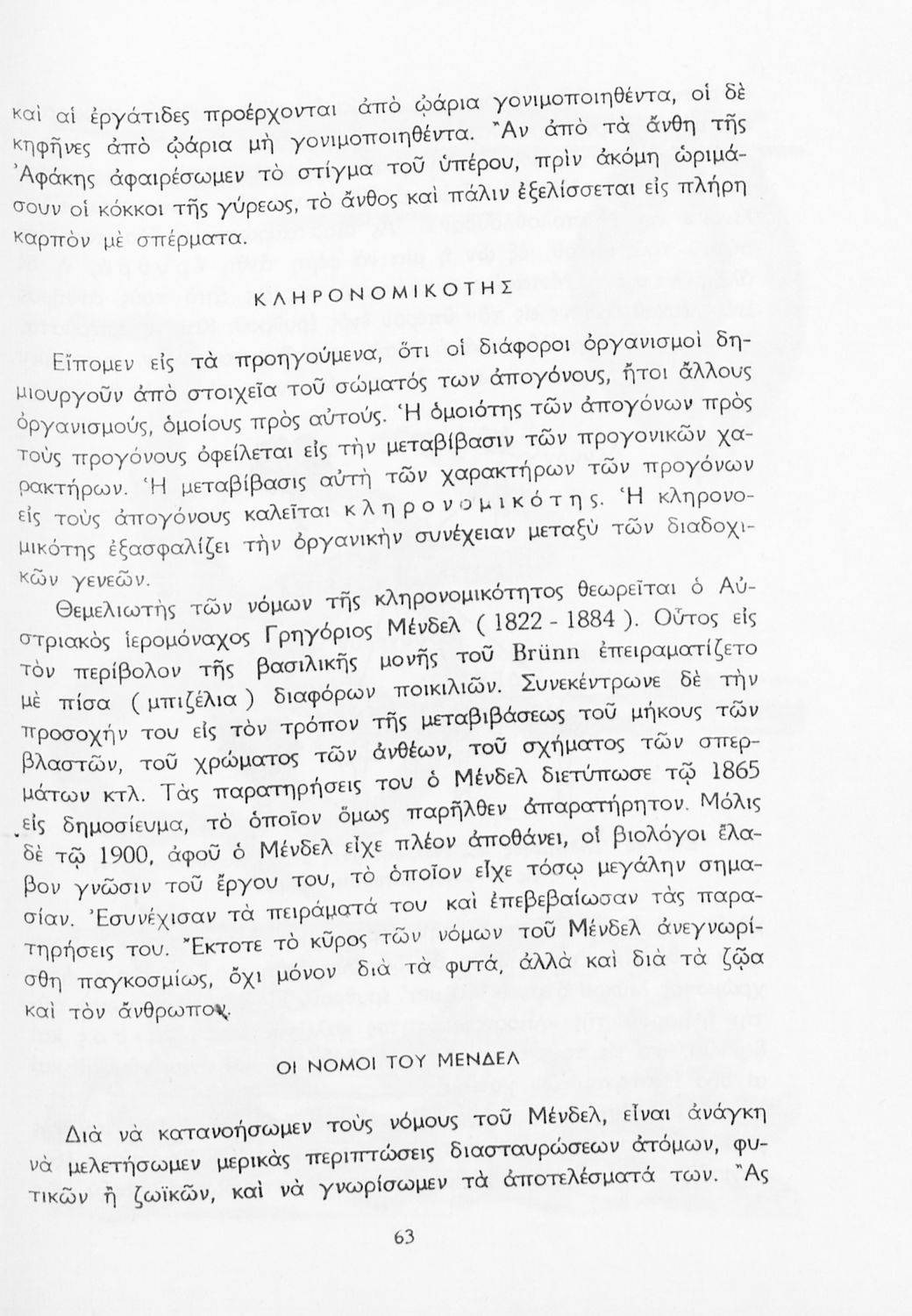 Βαθμίδα εκπαίδευσης: Δευτεροβάθμια Τάξη: Γ' Γυμνασίου Μάθημα: Βιολογία Γλώσσα: Απλή καθαρεύουσα Παρουσίαση περιεχομένου: Το βιβλίο προσφέρει μια γενική επισκόπηση της επιστήμης της βιολογίας. Αρχίζοντας με τα βασικά δομικά στοιχεία κάθε οργανισμού, ανόργανα και οργανικά σώματα και τα γνωρίσματά τους. Τα μέρη του κυττάρου, συνθήκες από τις οποίες εξαρτάται οι μορφές ζωής, όπως θερμότητα, πίεση, υγρασία. Τέλος το βιβλίο ασχολείται με ζητήματα κληρονομικότητας και την έννοια της εξέλιξης. |