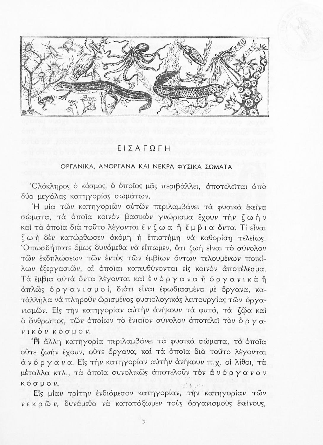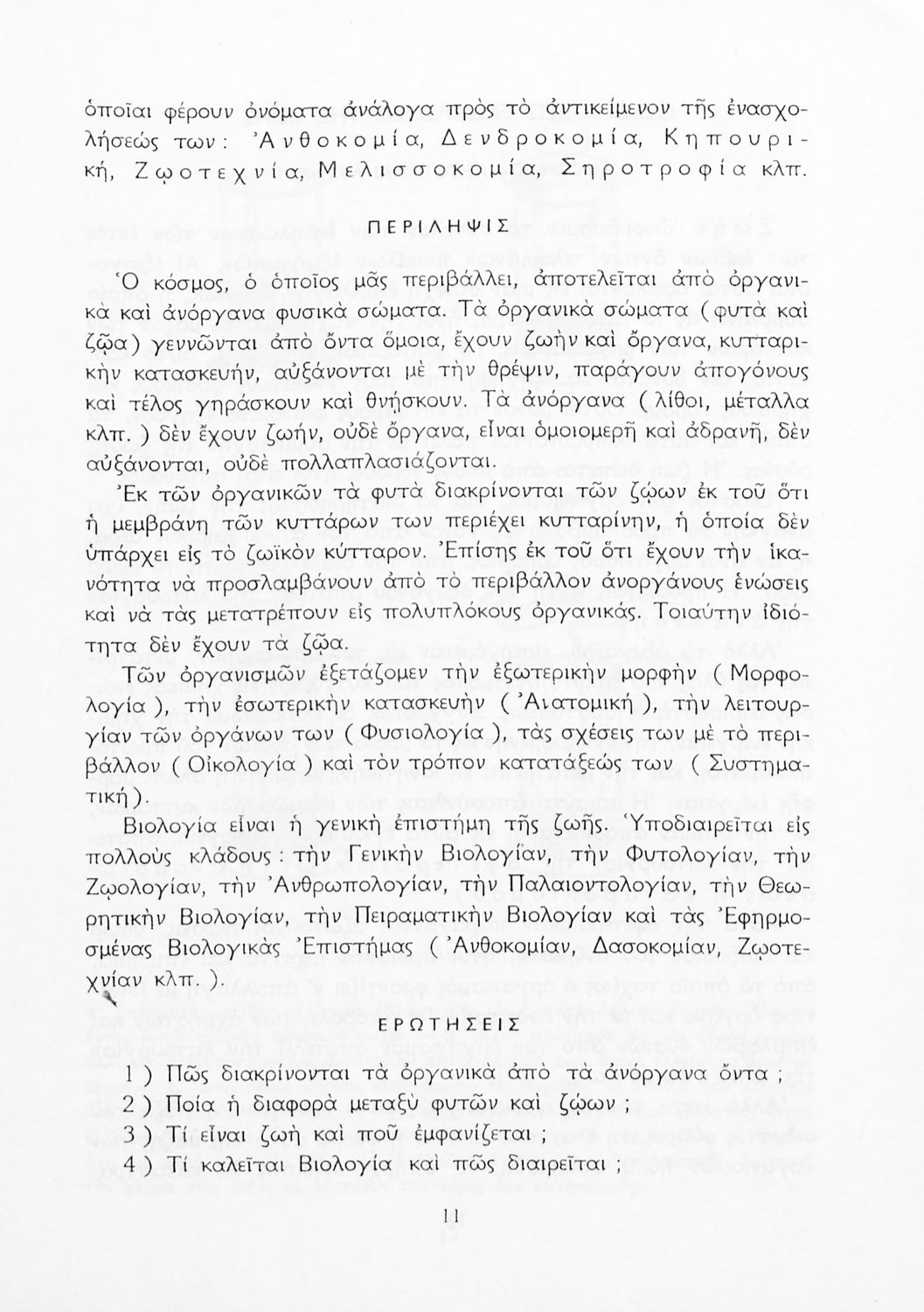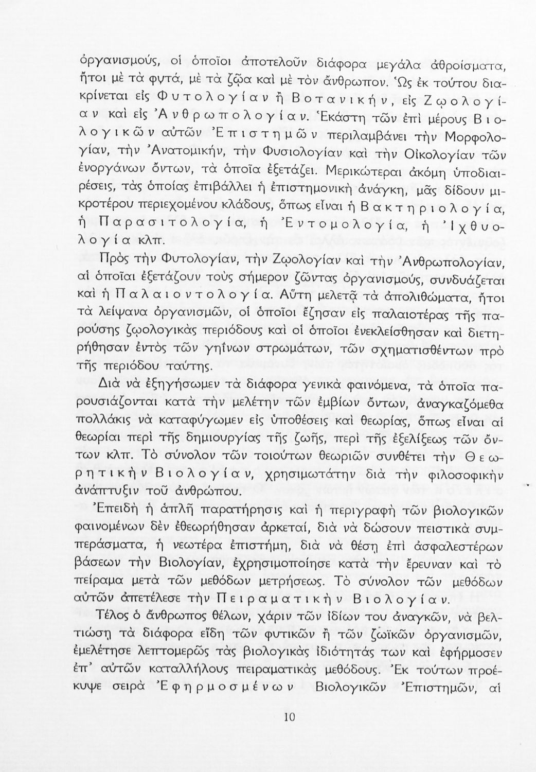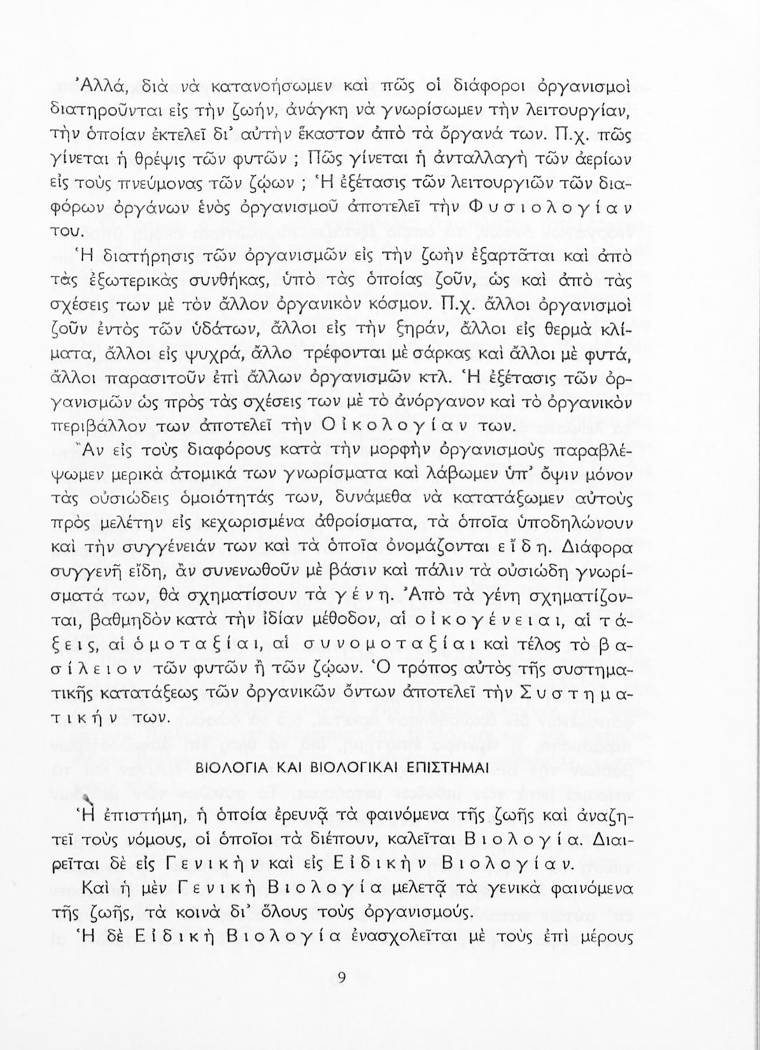 Βαθμίδα εκπαίδευσης: Δευτεροβάθμια Τάξη: Γ' Γυμνασίου Μάθημα: Βιολογία Γλώσσα: Απλή καθαρεύουσα Παρουσίαση περιεχομένου: Το βιβλίο προσφέρει μια γενική επισκόπηση της επιστήμης της βιολογίας. Αρχίζοντας με τα βασικά δομικά στοιχεία κάθε οργανισμού, ανόργανα και οργανικά σώματα και τα γνωρίσματά τους. Τα μέρη του κυττάρου, συνθήκες από τις οποίες εξαρτάται οι μορφές ζωής, όπως θερμότητα, πίεση, υγρασία. Τέλος το βιβλίο ασχολείται με ζητήματα κληρονομικότητας και την έννοια της εξέλιξης. |