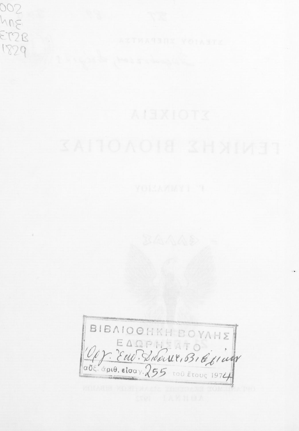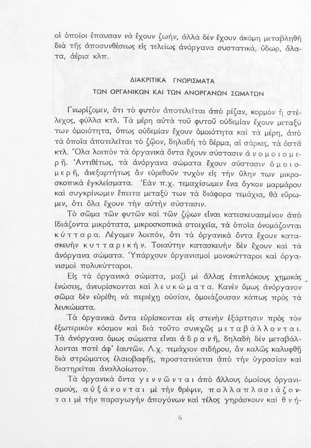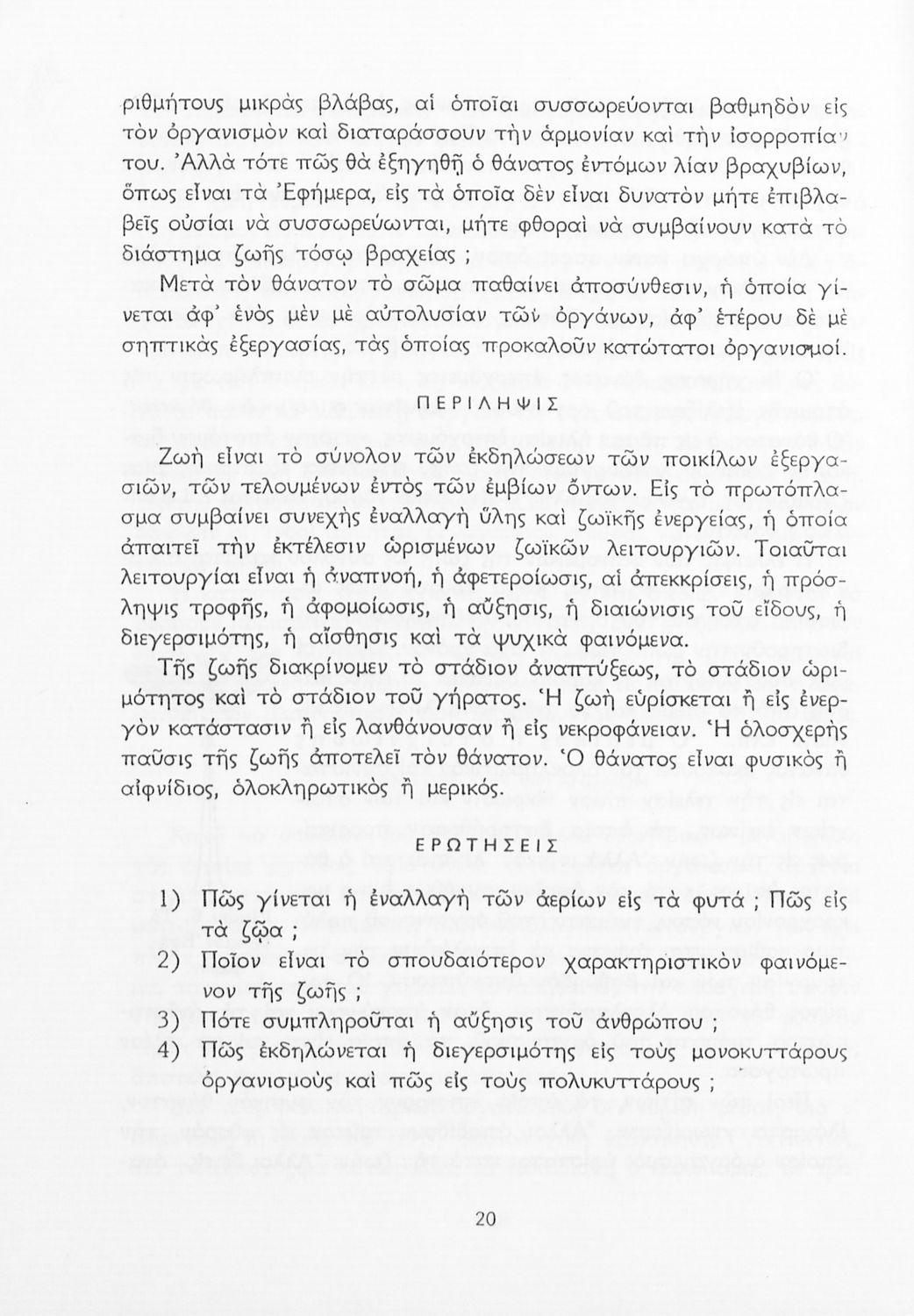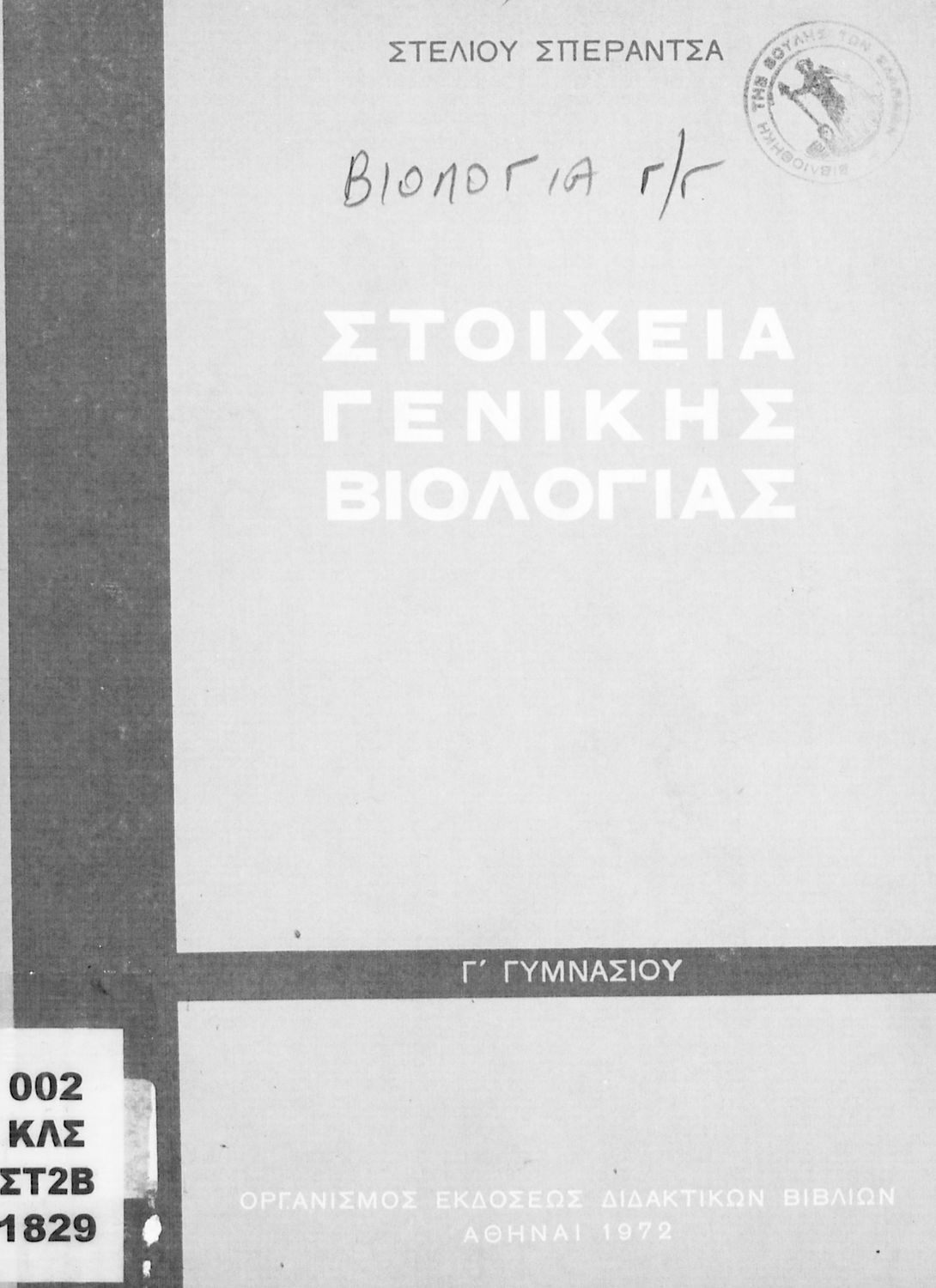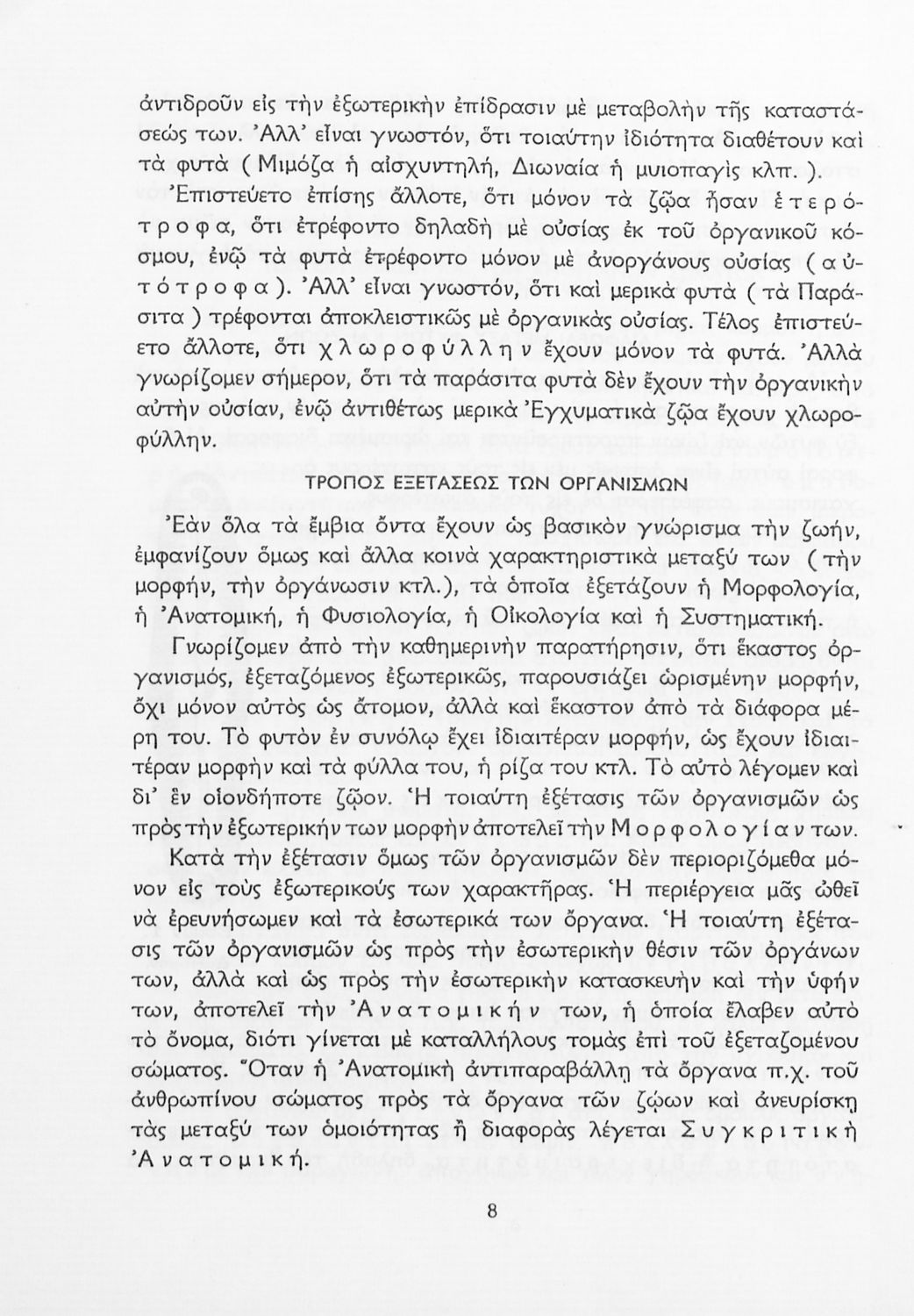 Βαθμίδα εκπαίδευσης: Δευτεροβάθμια Τάξη: Γ' Γυμνασίου Μάθημα: Βιολογία Γλώσσα: Απλή καθαρεύουσα Παρουσίαση περιεχομένου: Το βιβλίο προσφέρει μια γενική επισκόπηση της επιστήμης της βιολογίας. Αρχίζοντας με τα βασικά δομικά στοιχεία κάθε οργανισμού, ανόργανα και οργανικά σώματα και τα γνωρίσματά τους. Τα μέρη του κυττάρου, συνθήκες από τις οποίες εξαρτάται οι μορφές ζωής, όπως θερμότητα, πίεση, υγρασία. Τέλος το βιβλίο ασχολείται με ζητήματα κληρονομικότητας και την έννοια της εξέλιξης. |