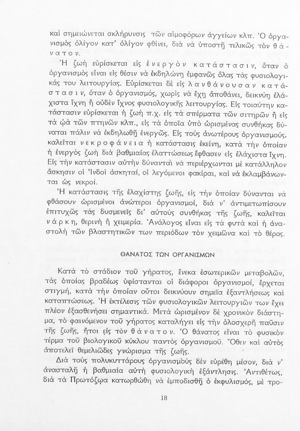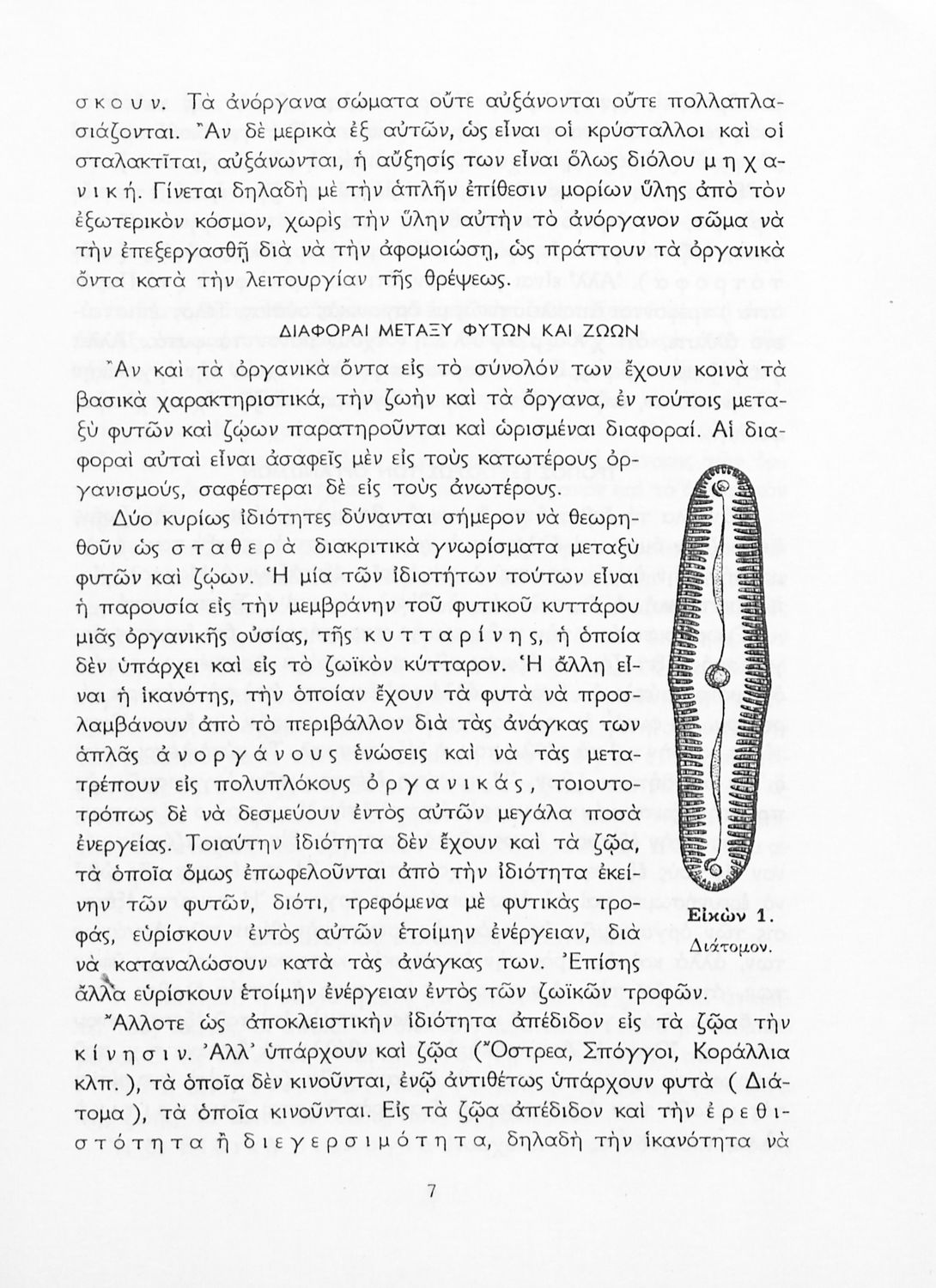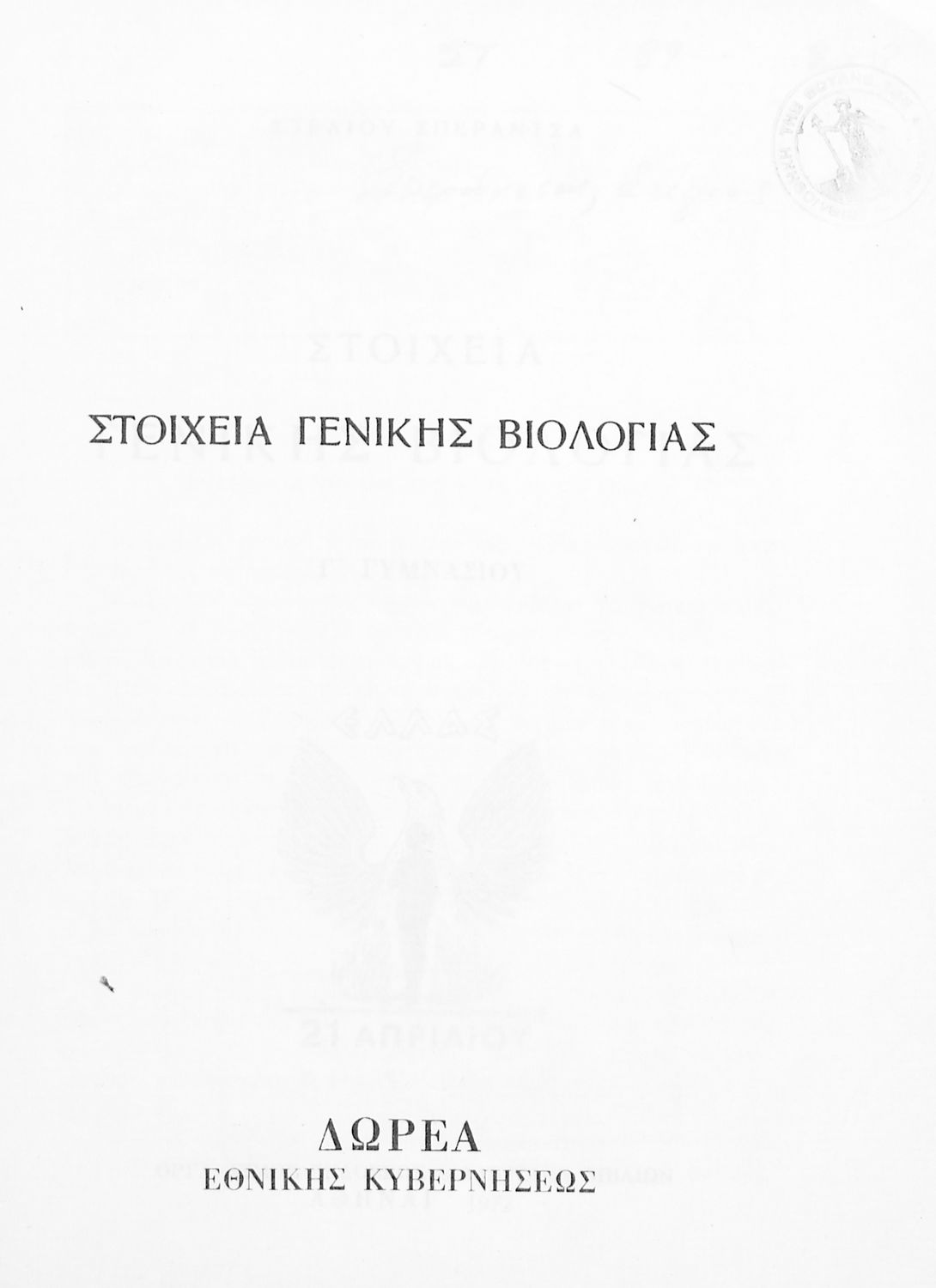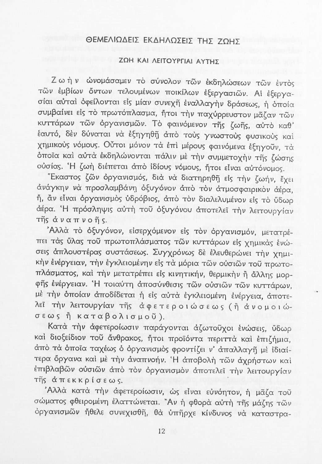 Βαθμίδα εκπαίδευσης: Δευτεροβάθμια Τάξη: Γ' Γυμνασίου Μάθημα: Βιολογία Γλώσσα: Απλή καθαρεύουσα Παρουσίαση περιεχομένου: Το βιβλίο προσφέρει μια γενική επισκόπηση της επιστήμης της βιολογίας. Αρχίζοντας με τα βασικά δομικά στοιχεία κάθε οργανισμού, ανόργανα και οργανικά σώματα και τα γνωρίσματά τους. Τα μέρη του κυττάρου, συνθήκες από τις οποίες εξαρτάται οι μορφές ζωής, όπως θερμότητα, πίεση, υγρασία. Τέλος το βιβλίο ασχολείται με ζητήματα κληρονομικότητας και την έννοια της εξέλιξης. |
