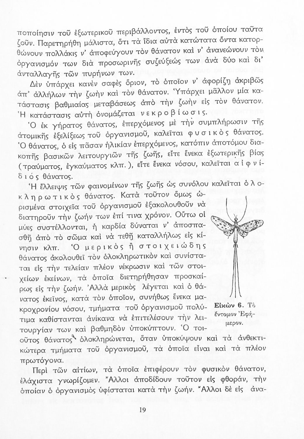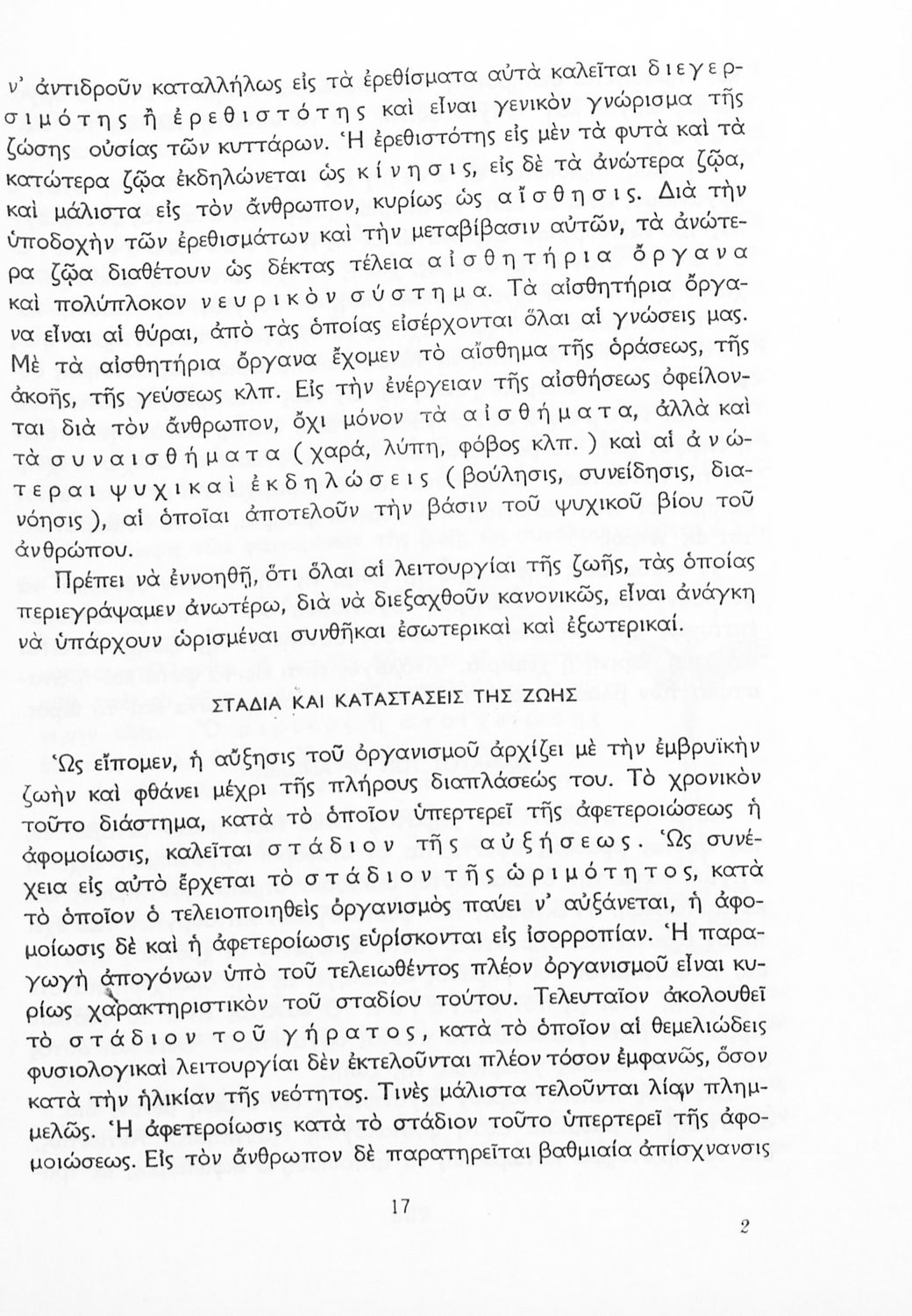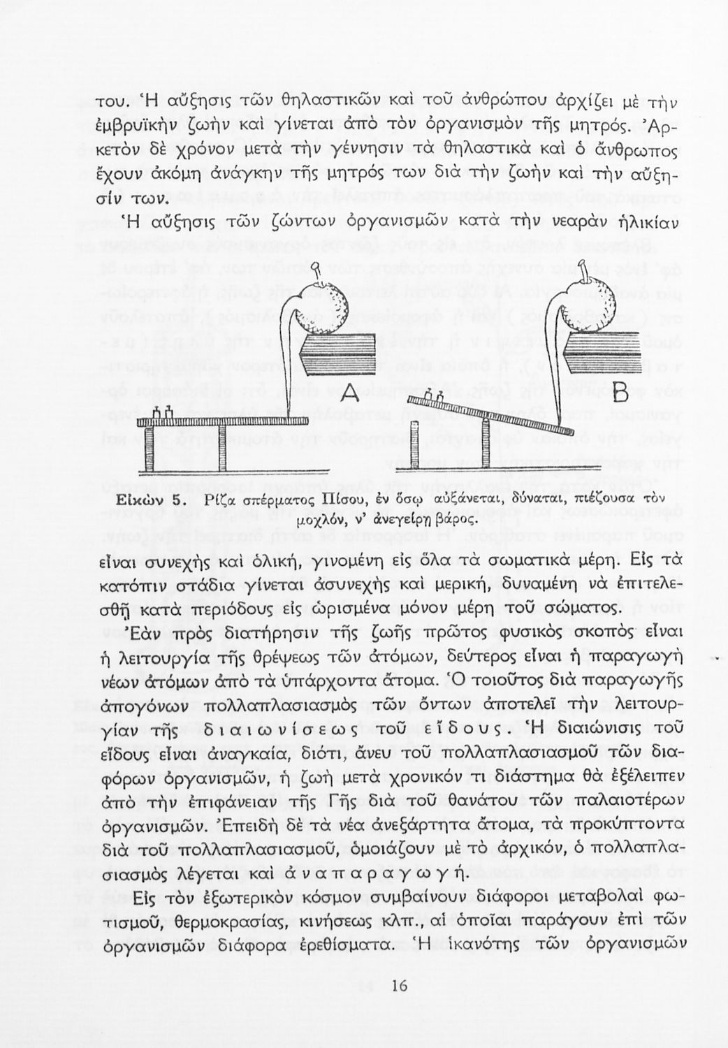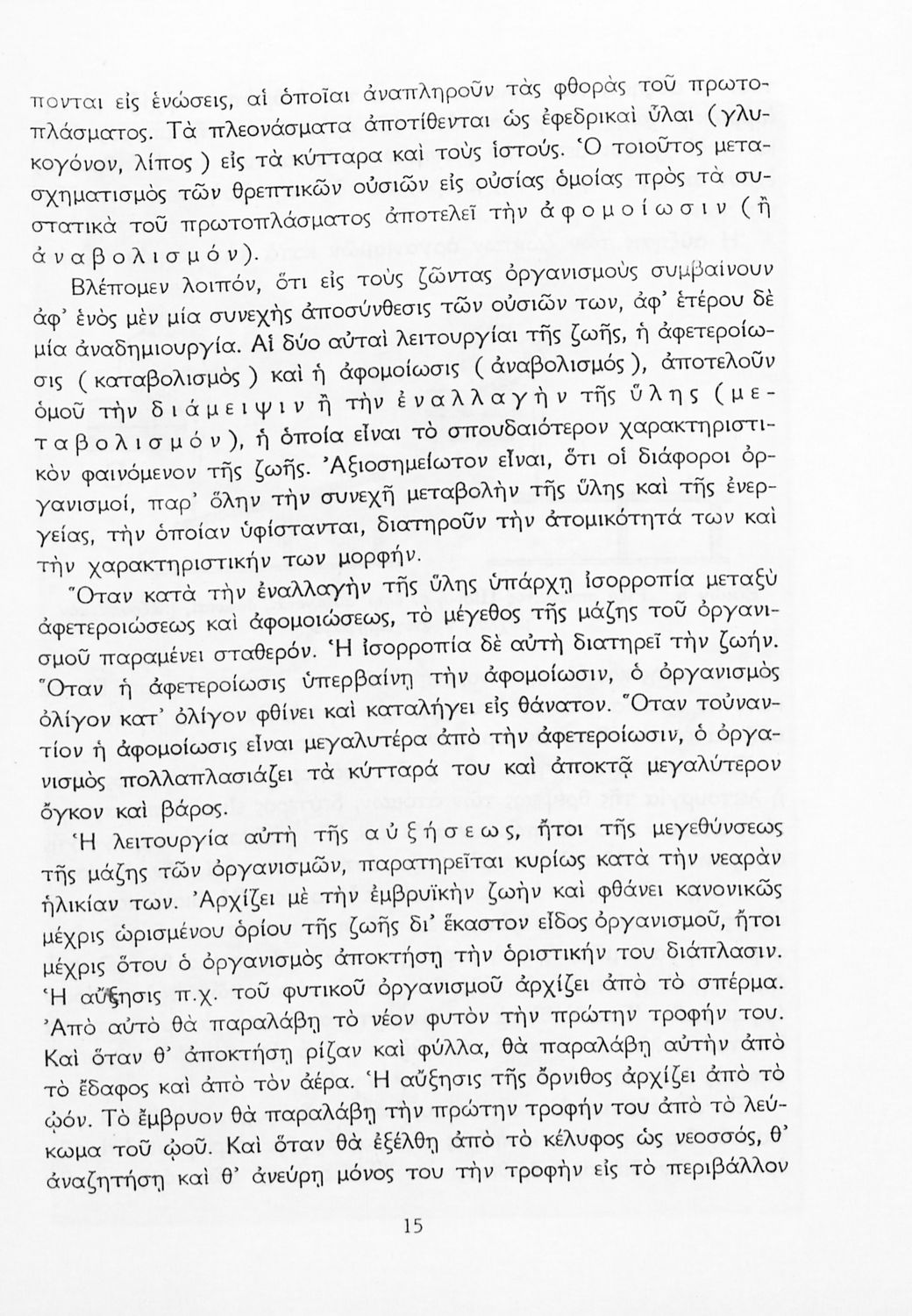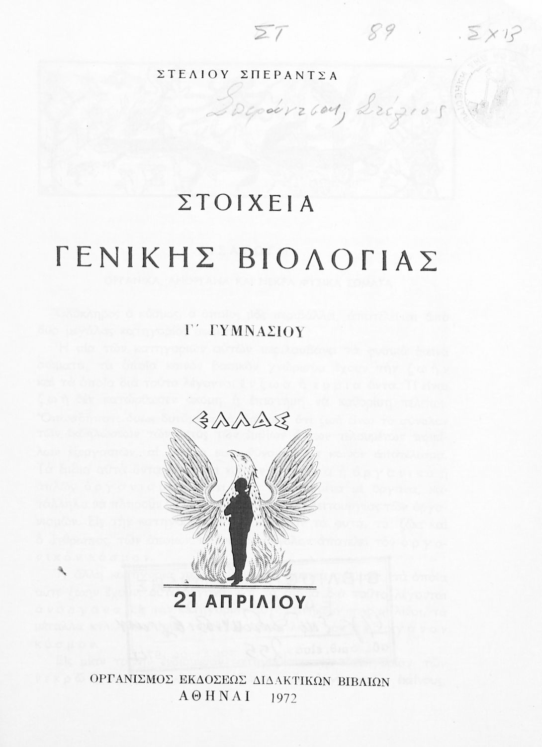 Βαθμίδα εκπαίδευσης: Δευτεροβάθμια Τάξη: Γ' Γυμνασίου Μάθημα: Βιολογία Γλώσσα: Απλή καθαρεύουσα Παρουσίαση περιεχομένου: Το βιβλίο προσφέρει μια γενική επισκόπηση της επιστήμης της βιολογίας. Αρχίζοντας με τα βασικά δομικά στοιχεία κάθε οργανισμού, ανόργανα και οργανικά σώματα και τα γνωρίσματά τους. Τα μέρη του κυττάρου, συνθήκες από τις οποίες εξαρτάται οι μορφές ζωής, όπως θερμότητα, πίεση, υγρασία. Τέλος το βιβλίο ασχολείται με ζητήματα κληρονομικότητας και την έννοια της εξέλιξης. |