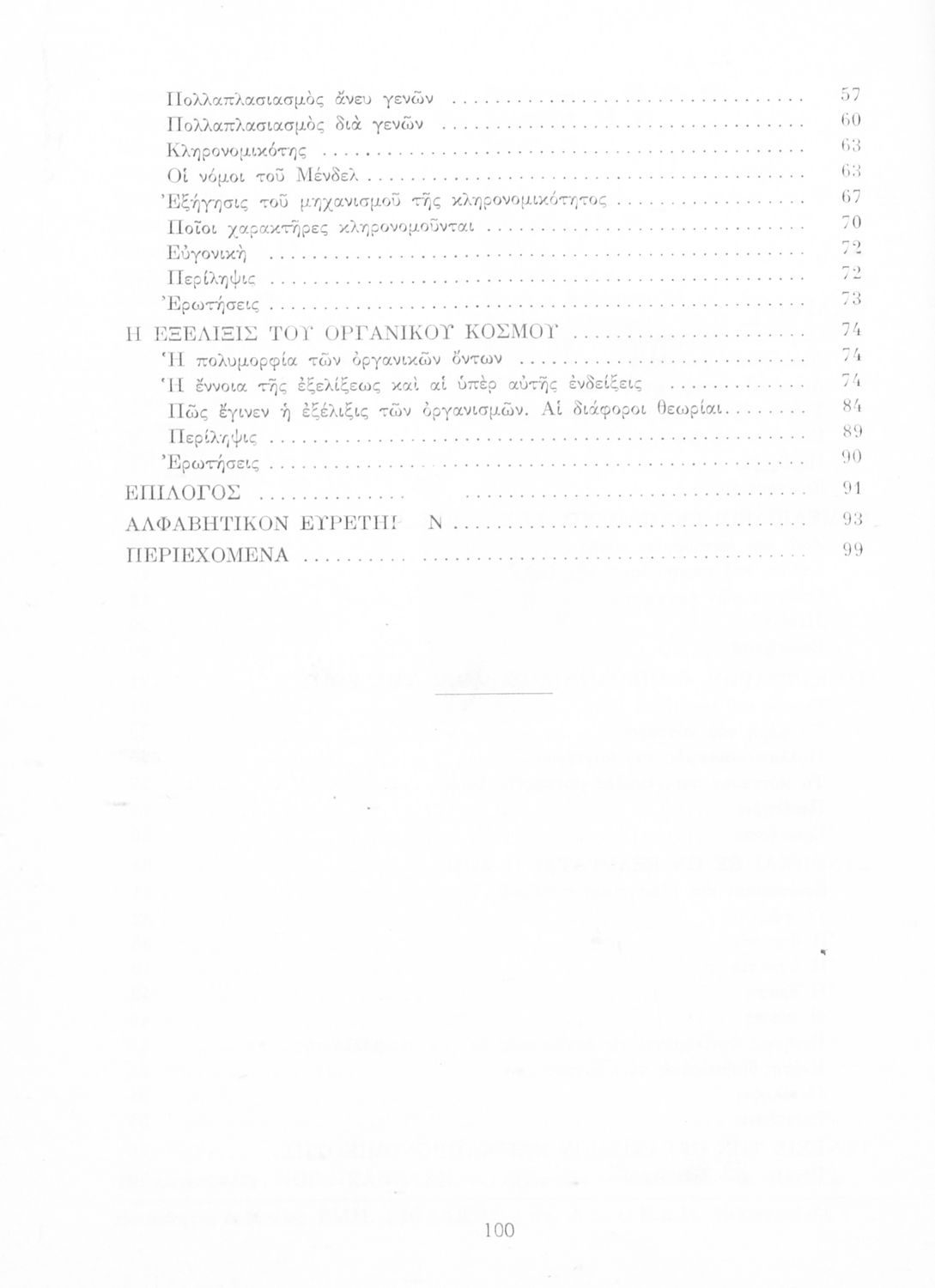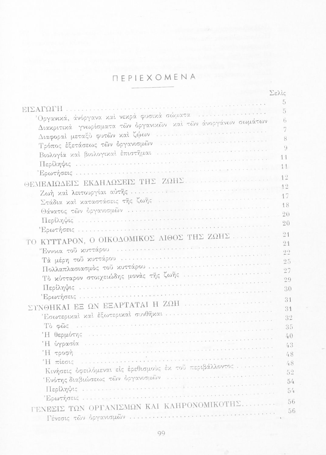 Σχολικό εγχειρίδιο Βιολογίας Δ΄ Γυμνασίου που εστιάζει στις συνθήκες γέννησης, μεταβολής και θανάτου των έμβιων οργανισμών. Ο συγγραφέας ήταν καθηγητής της γενικής Βιολογίας στο Πανεπιστήμιο Αθηνών.