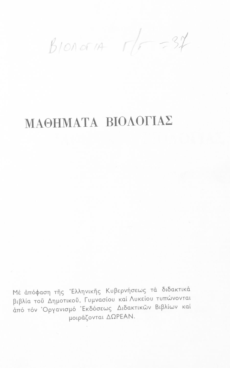 Κωδικός αναγνώρισης: 03-20557937 Τίτλος: Μαθήματα Βιολογίας Γ' Γυμνασίου Συγγραφέας: Κ. Κριμπάς, Ε. Ζούρος, Σ. Τσάκας, Κ. Χριστοδούλου Μέγεθος και υπόστρωμα: Σχολικό εγχειρίδιο, μαλακό εξώφυλλο, 144 σελίδες. Εικόνες, σκίτσα (έγχρωμα). |
