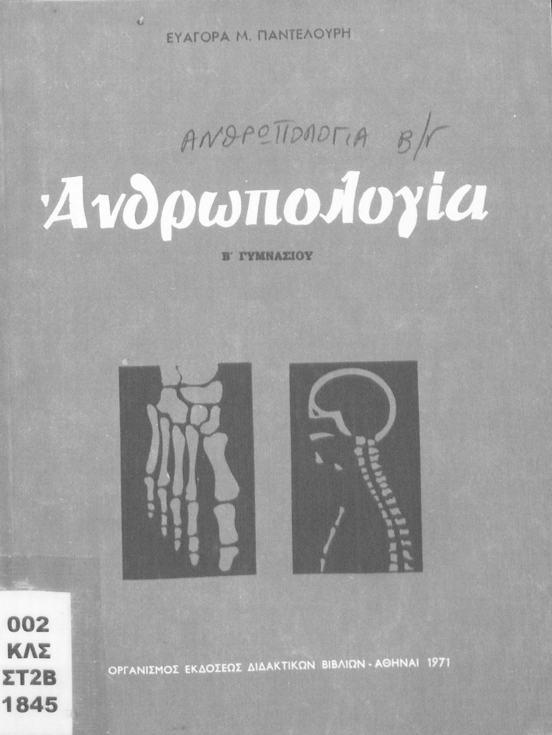 Σχολικό εγχειρίδιο Ανθρωπολογίας Β΄ Γυμνασίου που εστιάζει στην κατασκευή, ανάπτυξη και λειτουργία του ανθρώπινου οργανισμού και τη σχέση του ανθρώπου με το φυσικό περιβάλλον. Περιέχει και αναφορά στις ανθρώπινες φυλές.
