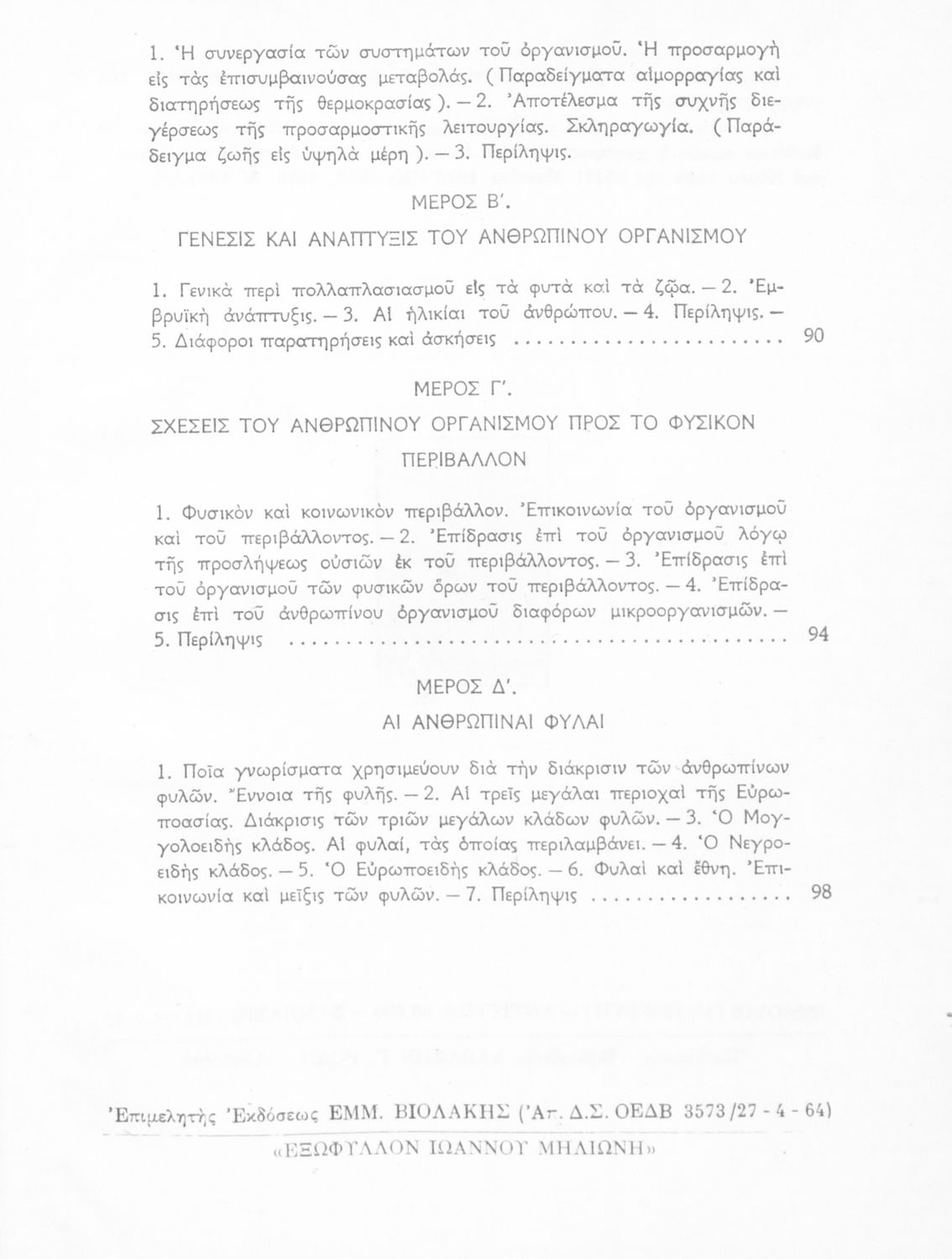 Σχολικό βιβλίο Ανθρωπολογίας για τη Δ΄ τάξη των Εξαταξίων Γυμνασίων που εστιάζει στην ανατομία και φυσιολογία του ανθρώπινου σώματος και τη σχέση του με το περιβάλλον. Ο συγγραφέας ήταν καθηγητής πανεπιστημίου.