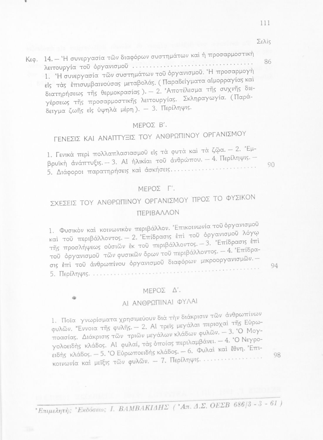 Σχολικό βιβλίο Ανθρωπολογίας για τη Δ΄ τάξη των Εξαταξίων Γυμνασίων που εστιάζει στην ανατομία και φυσιολογία του ανθρώπινου σώματος και τη σχέση του με το περιβάλλον. Ο συγγραφέας ήταν καθηγητής πανεπιστημίου.