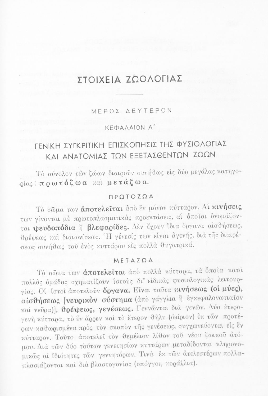 Σχολικό εγχειρίδιο Ζωολογίας/Φυτολογίας για τα Γυμνάσια και Αστικά Σχολεία που παρουσιάζει διάφορα ζώα και φυτά ανάλογα με τη συνομοταξία στην οποία ανήκουν.