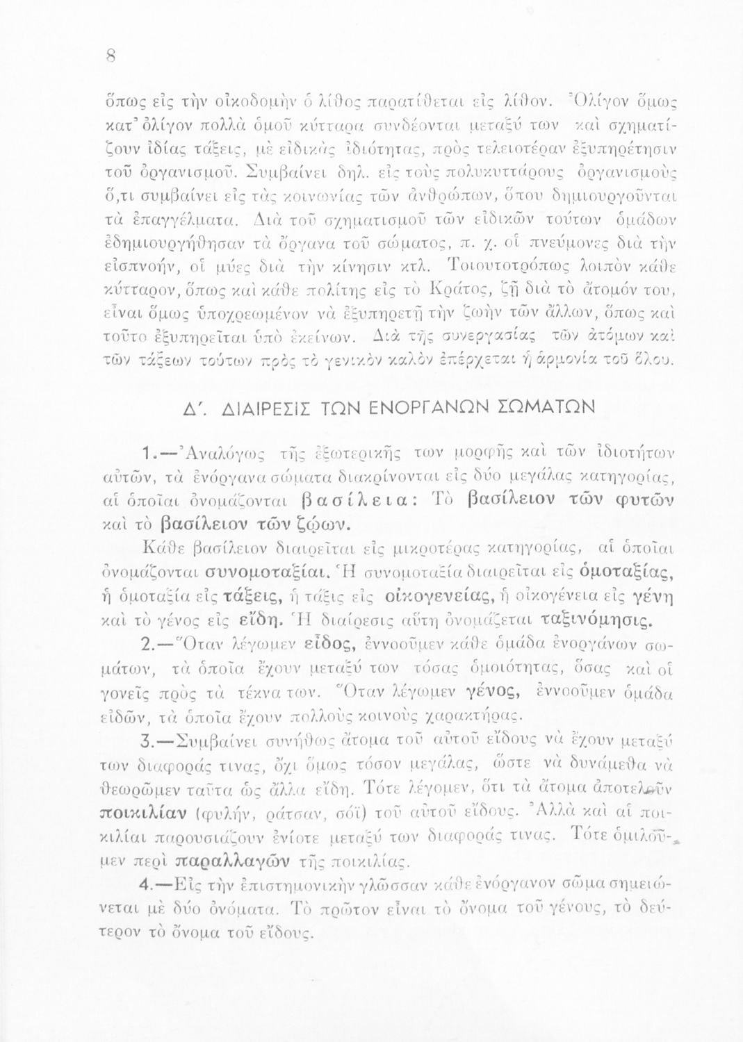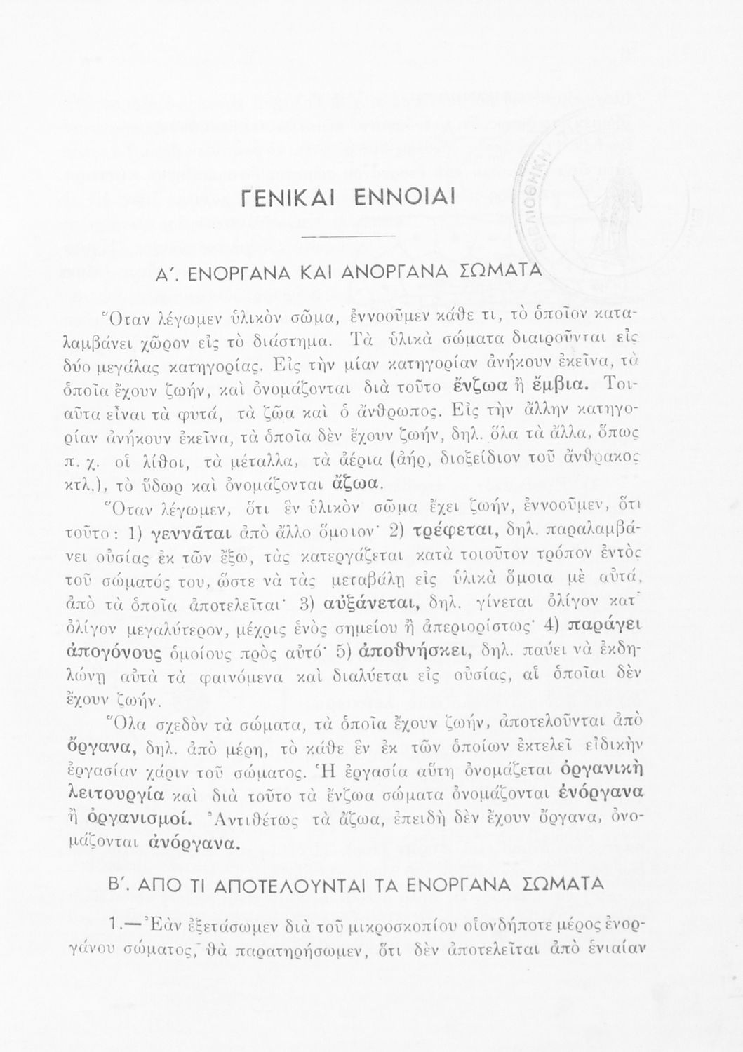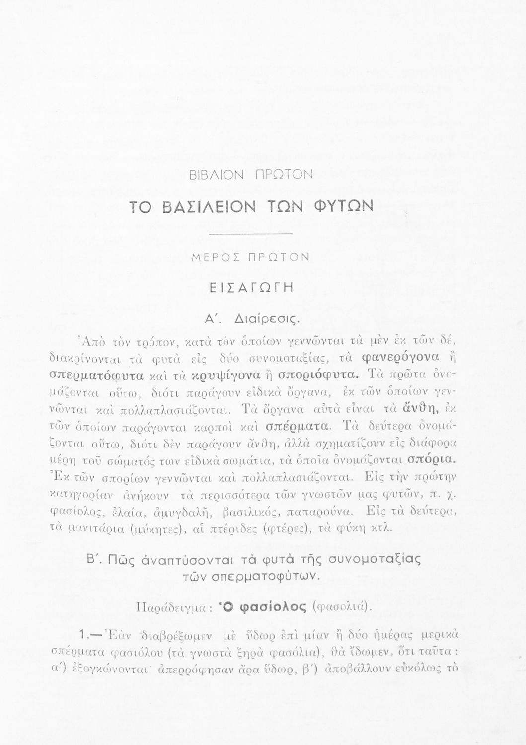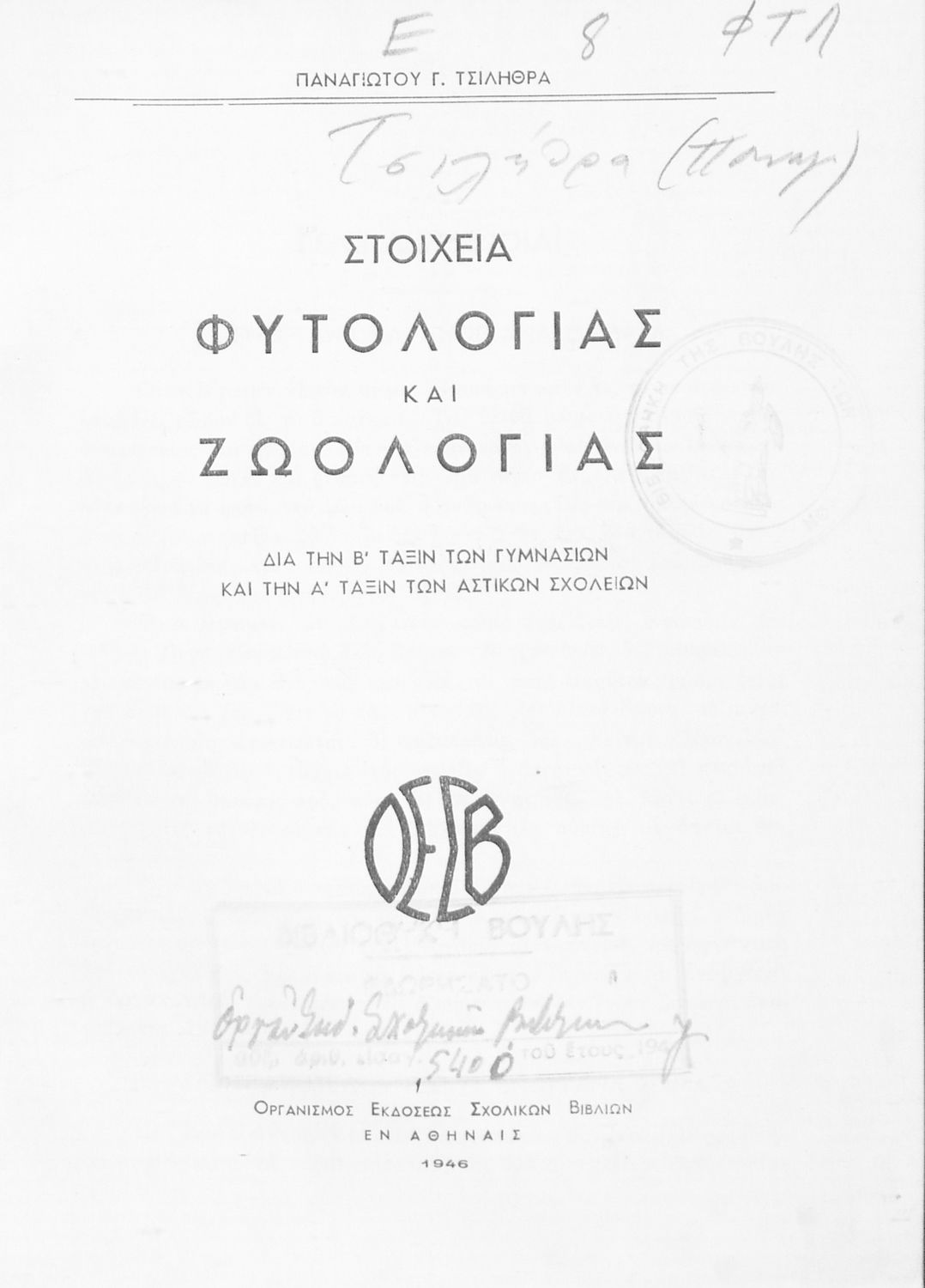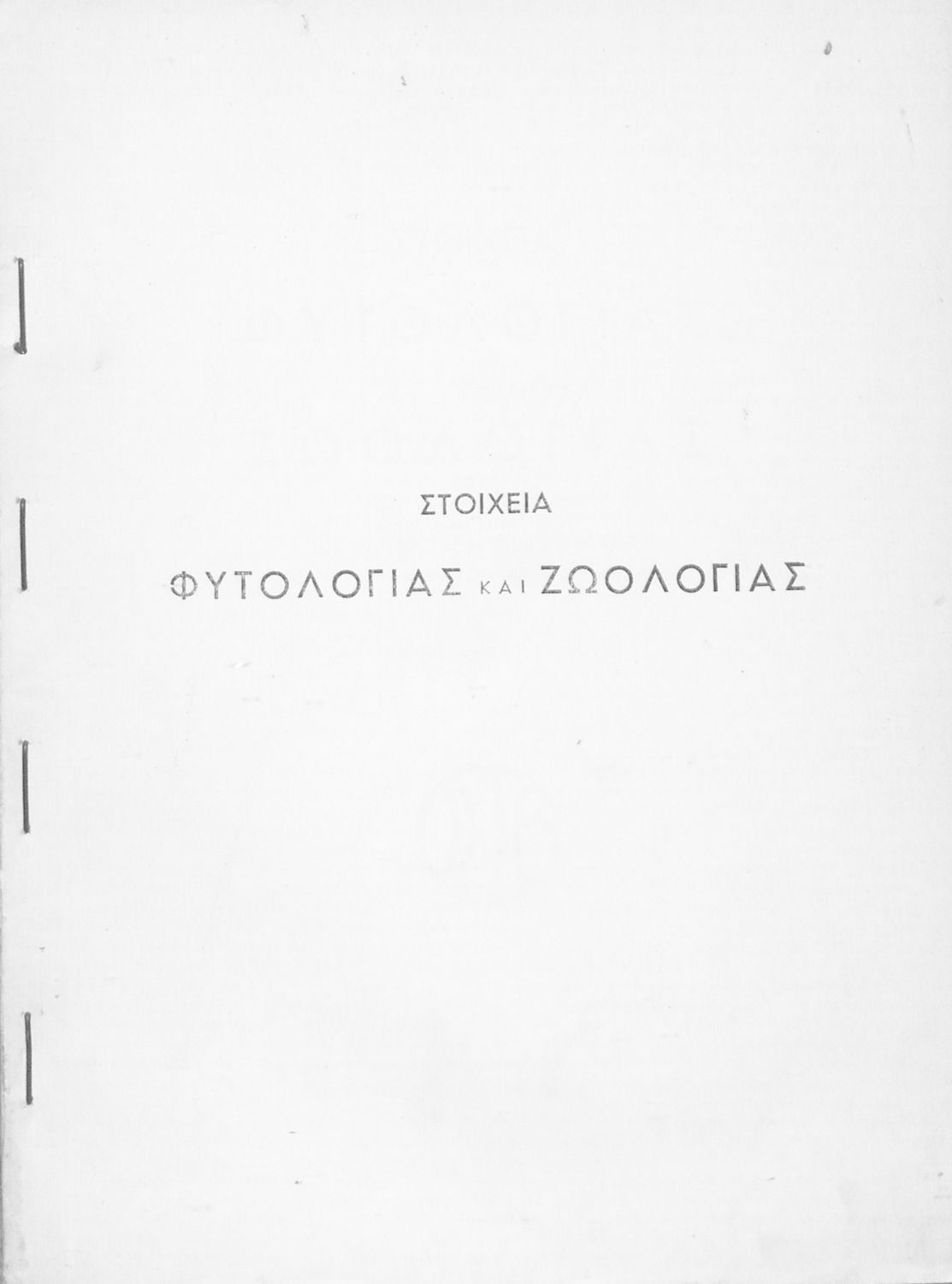 Σχολικό εγχειρίδιο Φυτολογίας και Ζωολογίας της Β΄ τάξης Γυμνασίων και Α΄ τάξης Αστικών Σχολίων. Το βιβλίο χωρίζεται σε δύο μέρη. Στο πρώτο μέρος παρουσιάζει μια επισκόπηση των διαφορετικών φυτών, όπως τα σπερματόφυτα και τα σποριόφυτα. Στο δεύτερο παρουσιάζονται τα διαφορετικά είδη ζώων όπως τα θηλαστικά, τα μαλάκια, τα πτηνά και τα ερπετά αναλύοντας τα χαρακτηριστικά και τις ιδιότητες του καθενός.