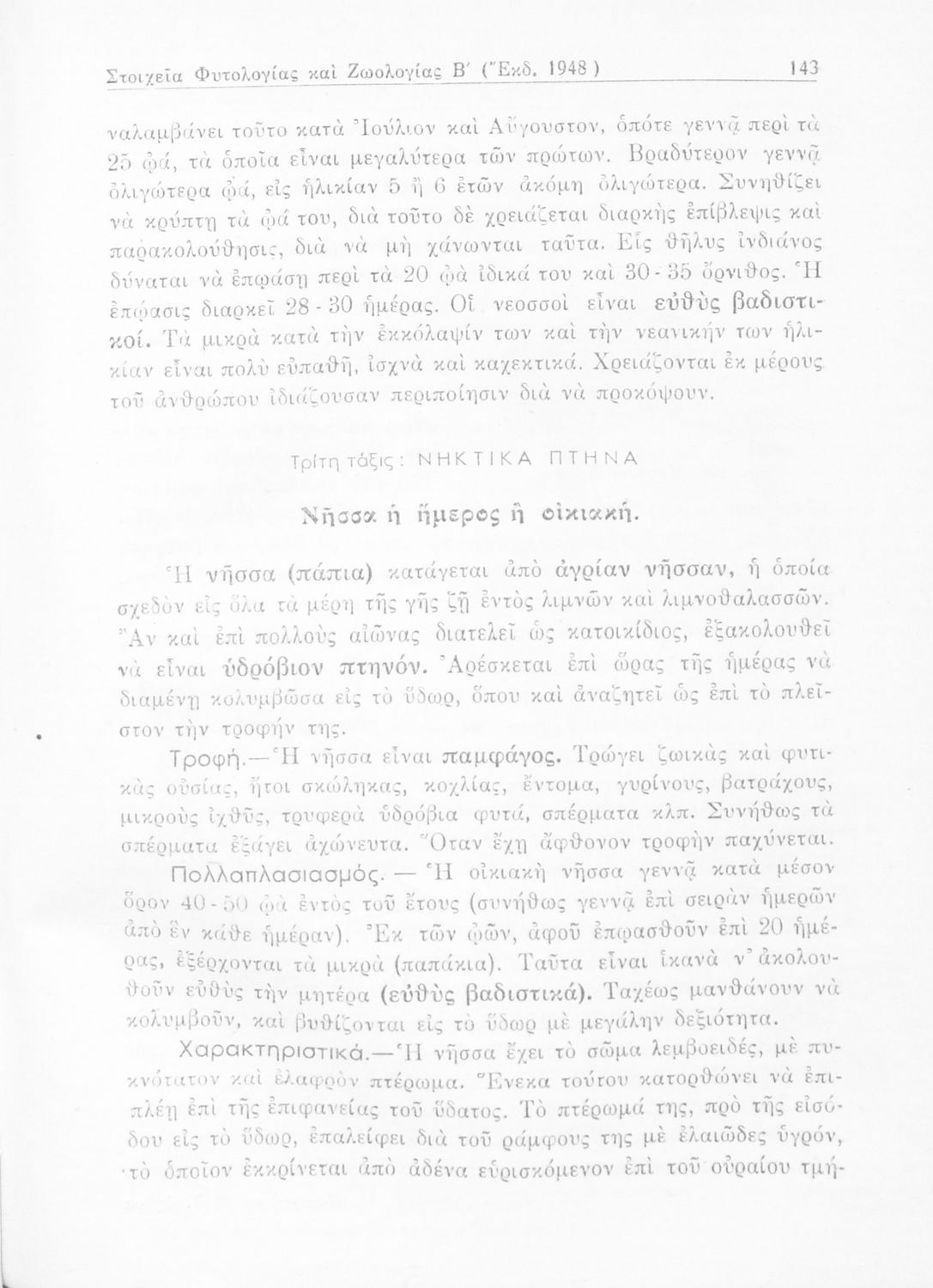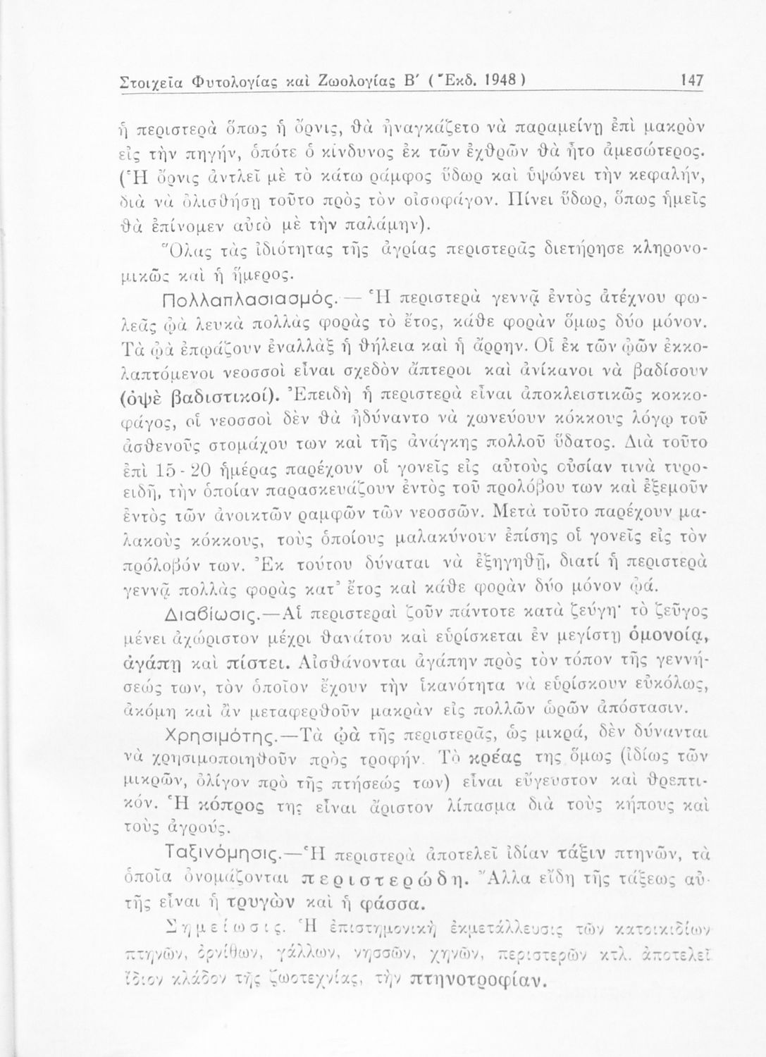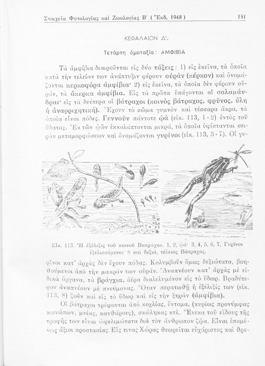 Σχολικό εγχειρίδιο Φυτολογίας - Ζωολογίας για τους μαθητές της Β' Τάξης Γυμνασίου, και της Α' Τάξης Αστικών Σχολείων. Περιέχει μια εισαγωγή της Φυτολογίας και της Ζωολογίας. Χωρίζεται σε δύο μέρη. Στο πρώτο μέρος παρουσιάζει μια επισκόπηση των διαφορετικών φυτών όπως είναι τα σπερματόφυτα και τα σποριόφυτα. Στο δεύτερο παρουσιάζει τα διαφορετικά είδη των ζώων τα θηλαστικά, τα μαλάκια, τα πτηνά και τα ερπετά.